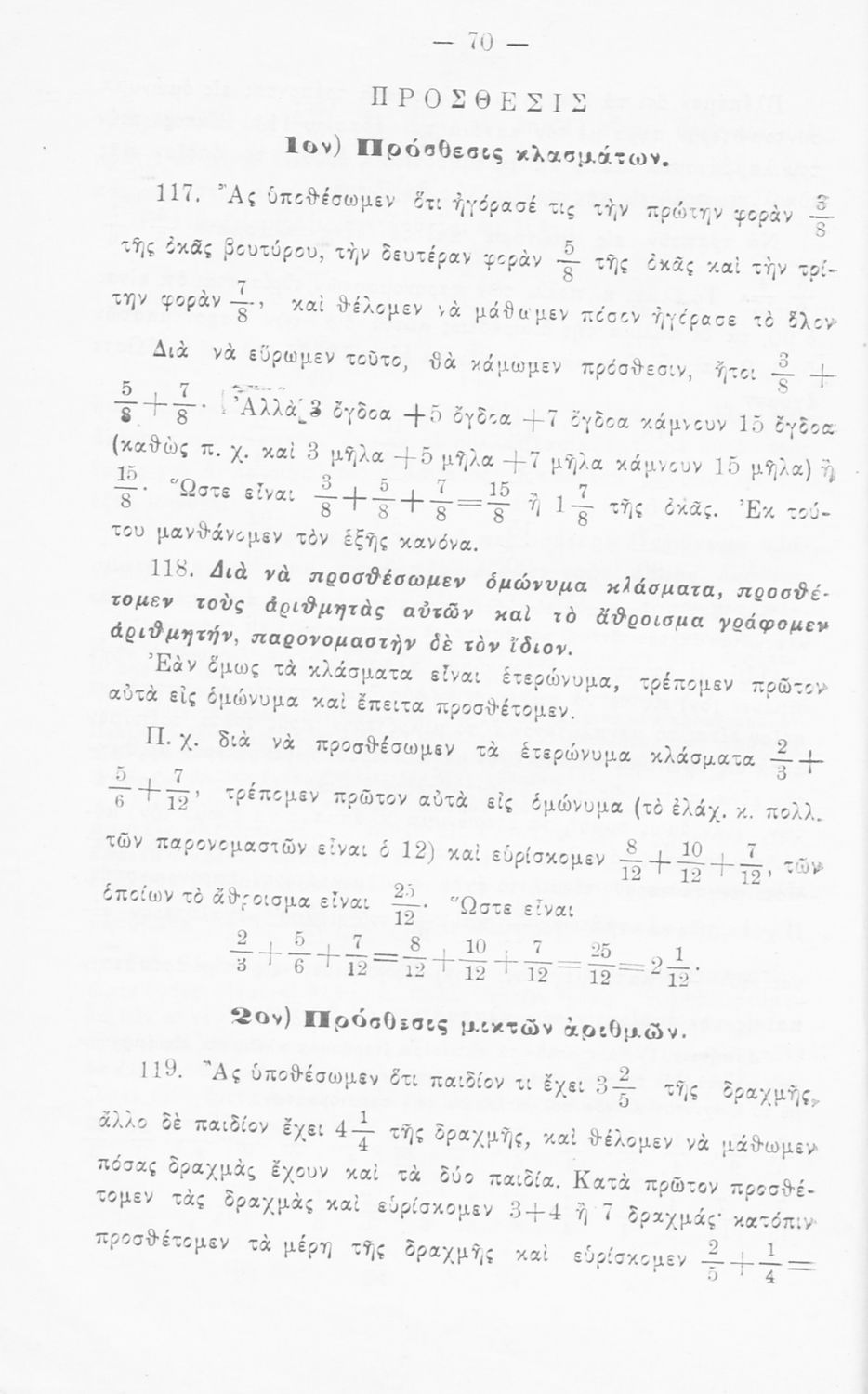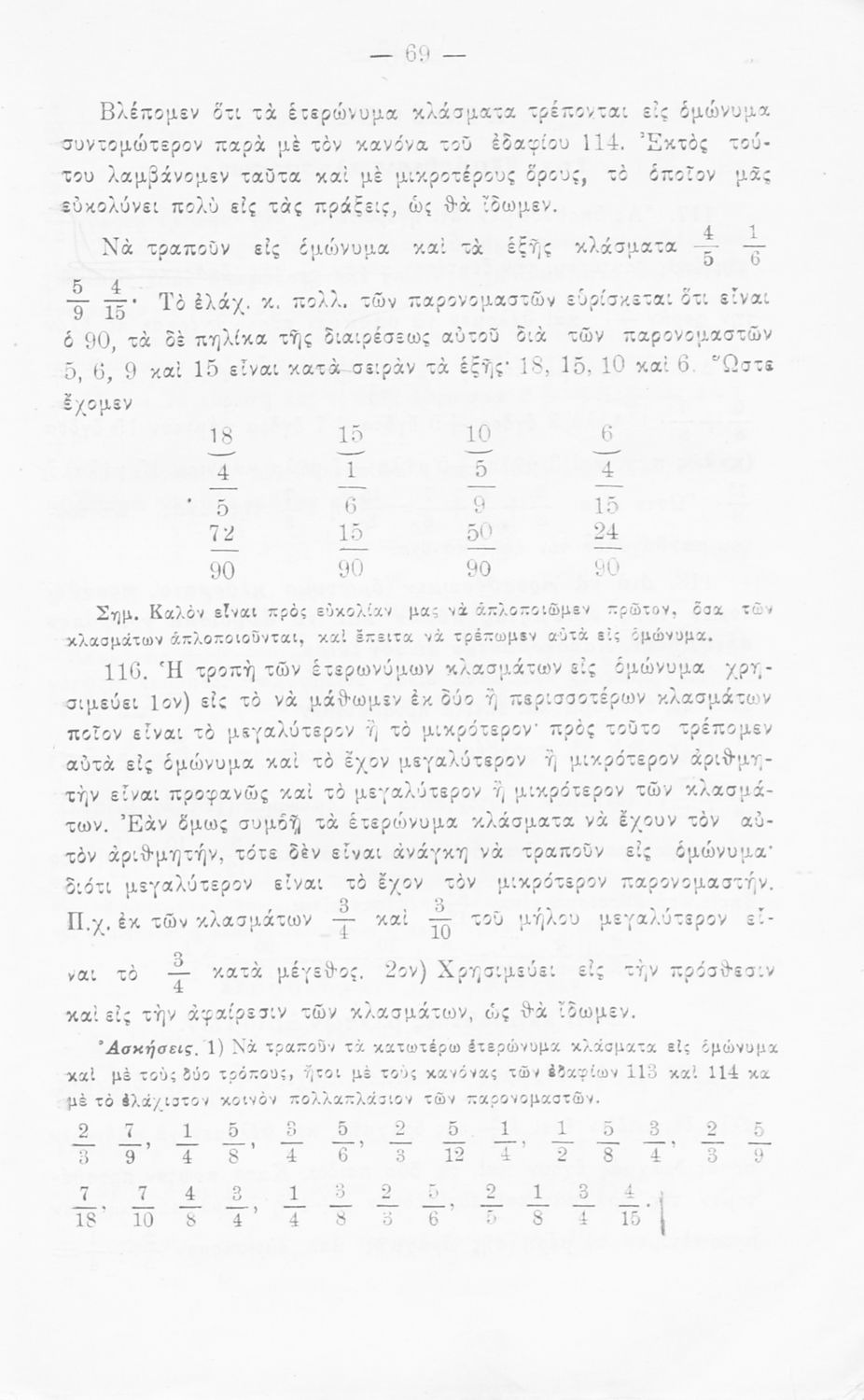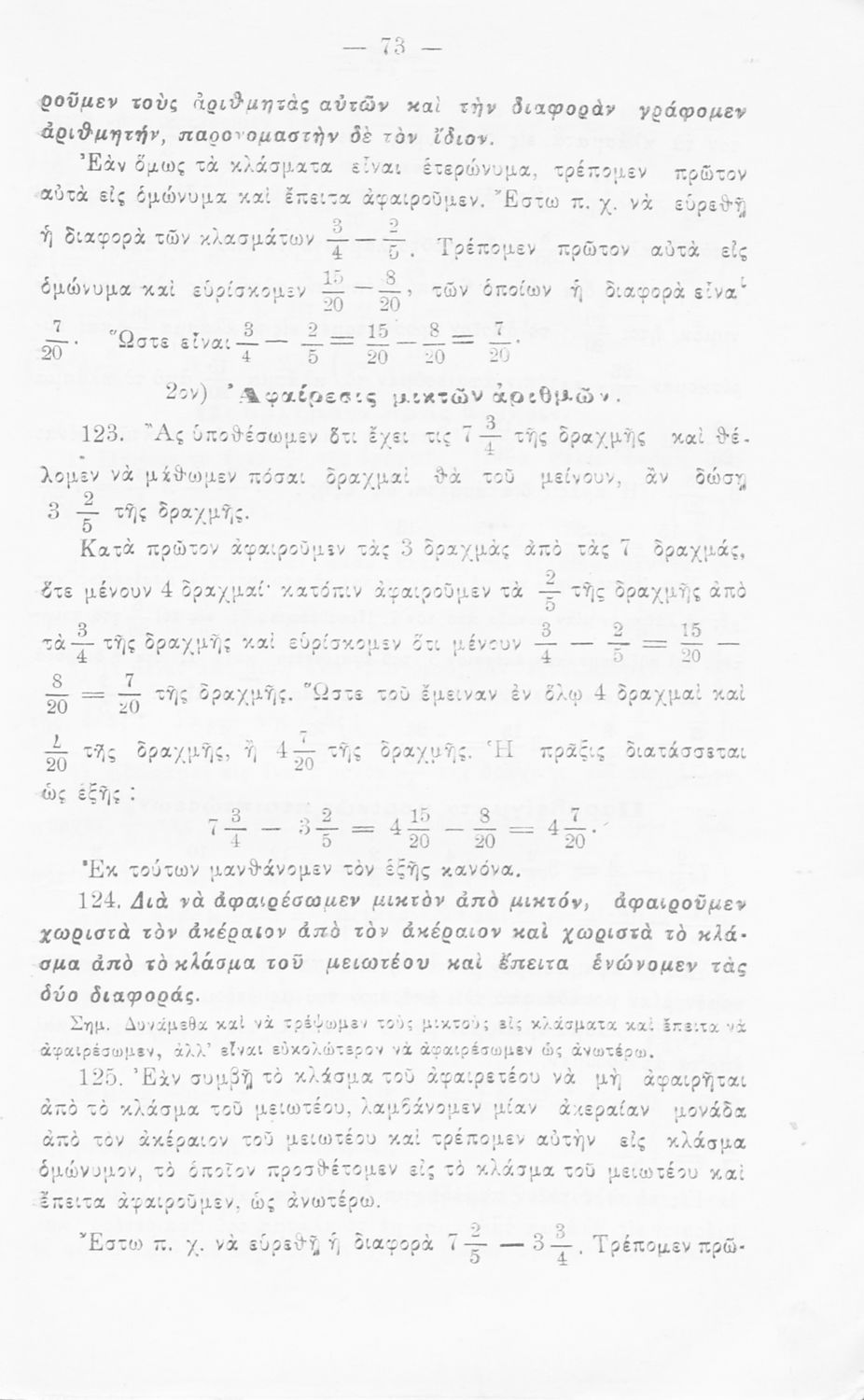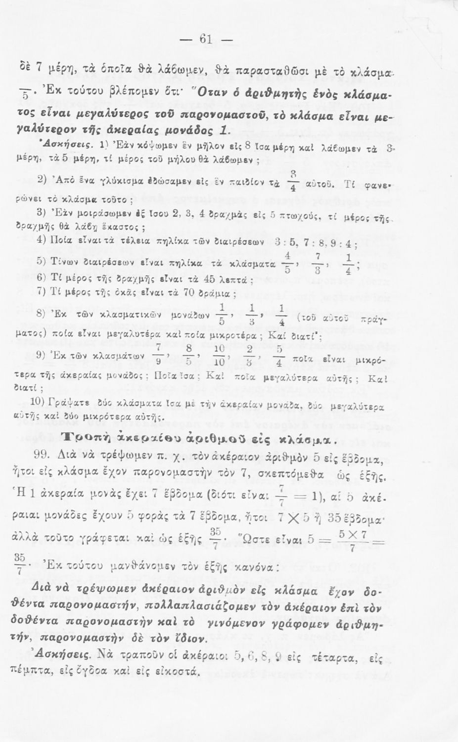 Σχολικό εγχειρίδιο Αριθμητικής για τις Α΄, Β΄, Γ΄ Γυμνασίου και τα Ανώτερα Παρθεναγωγεία που είναι χωρισμένο σε θεωρία και ασκήσεις και εστιάζει στις αριθμητικές πράξεις με κλάσματα και ακέραιους και συμμιγείς