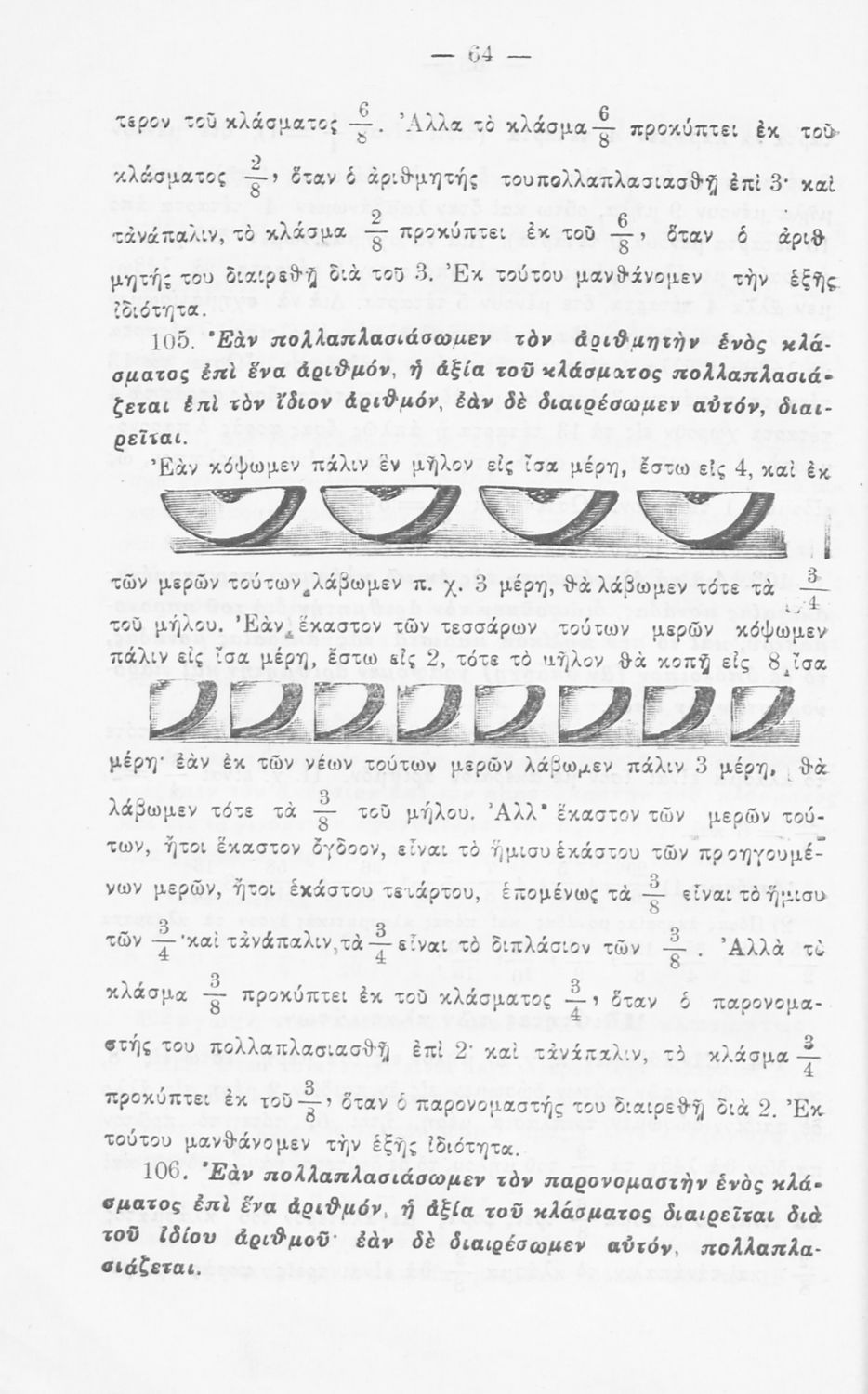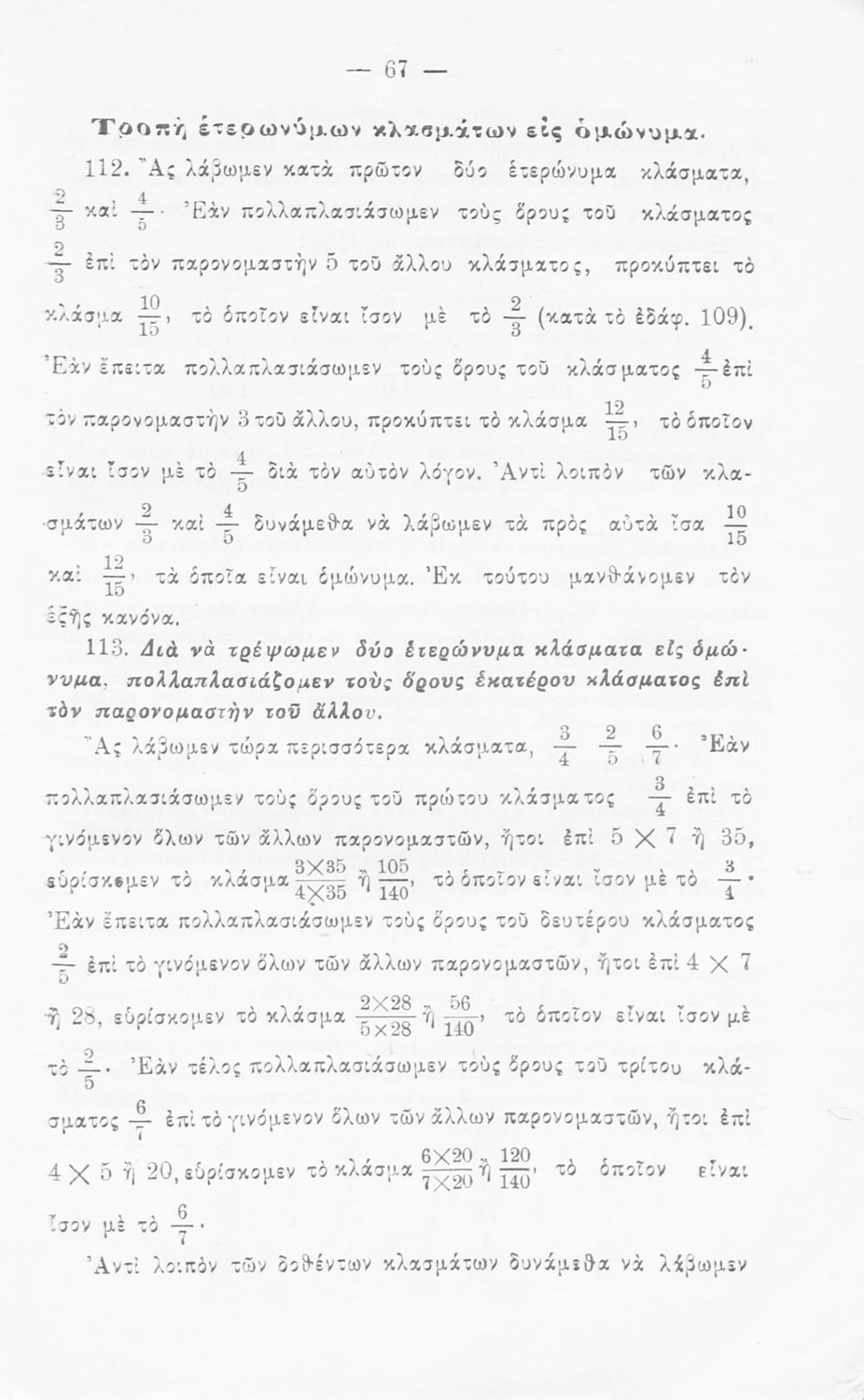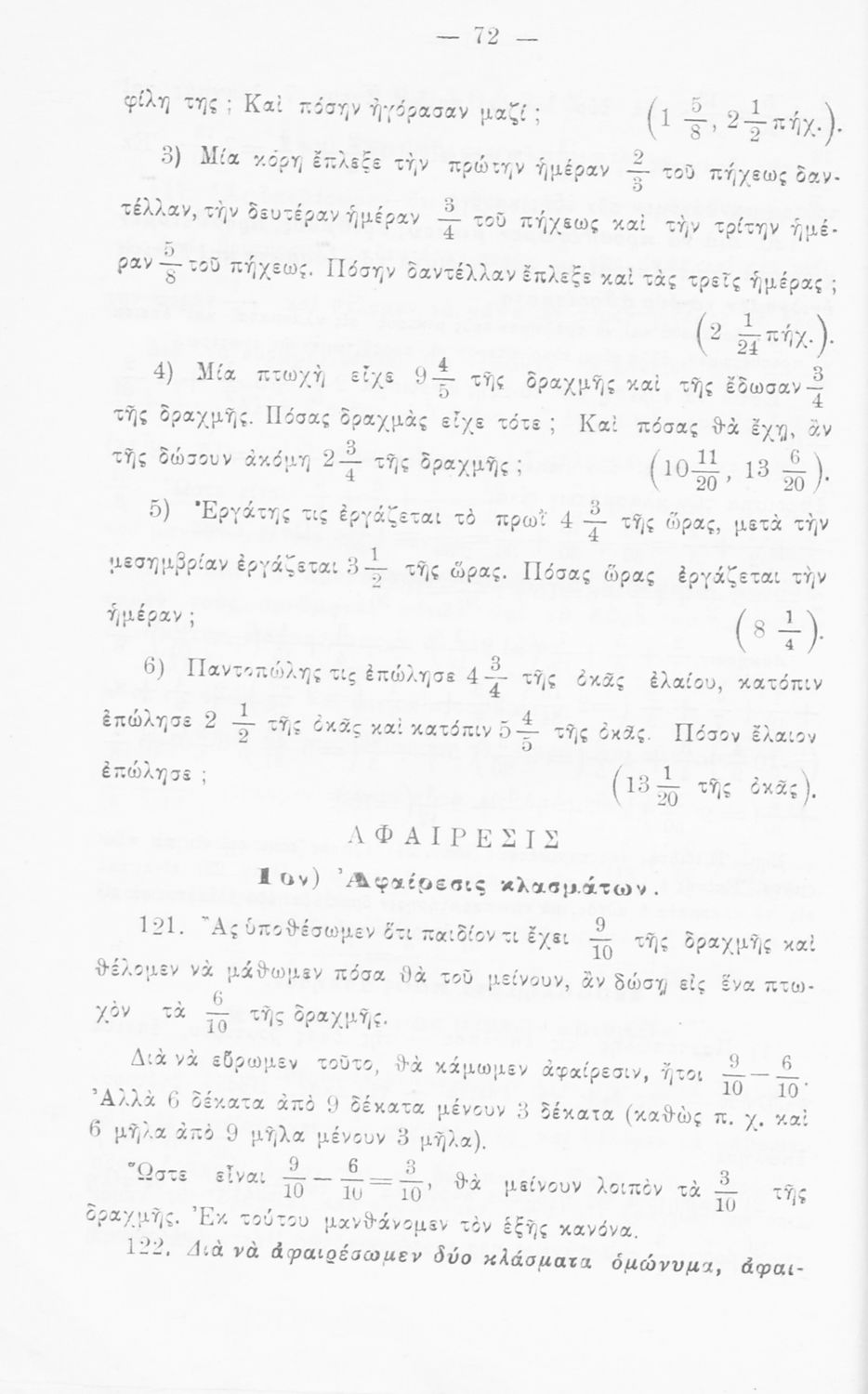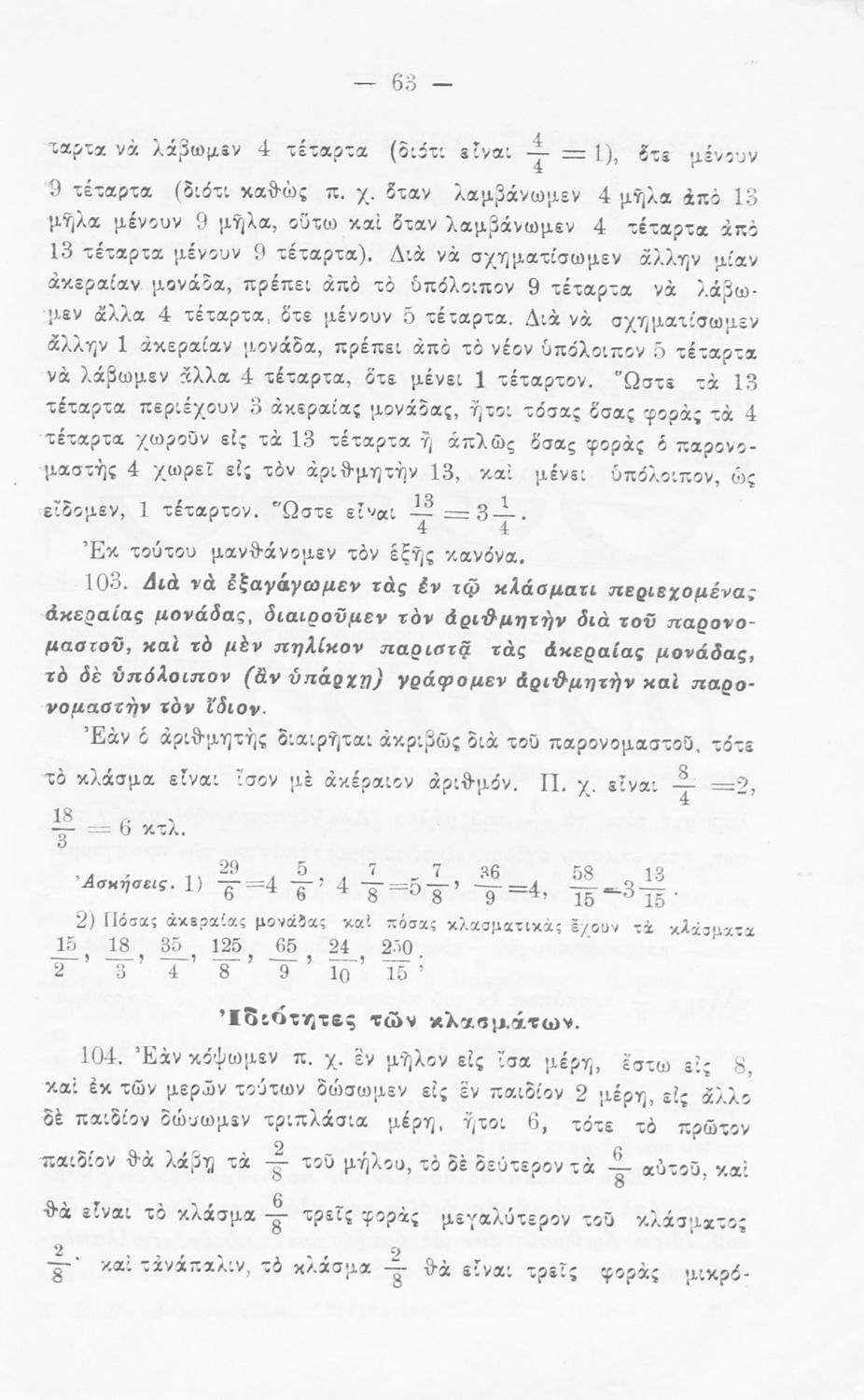 Σχολικό εγχειρίδιο Αριθμητικής για τις Α΄, Β΄, Γ΄ Γυμνασίου και τα Ανώτερα Παρθεναγωγεία που είναι χωρισμένο σε θεωρία και ασκήσεις και εστιάζει στις αριθμητικές πράξεις με κλάσματα και ακέραιους και συμμιγείς