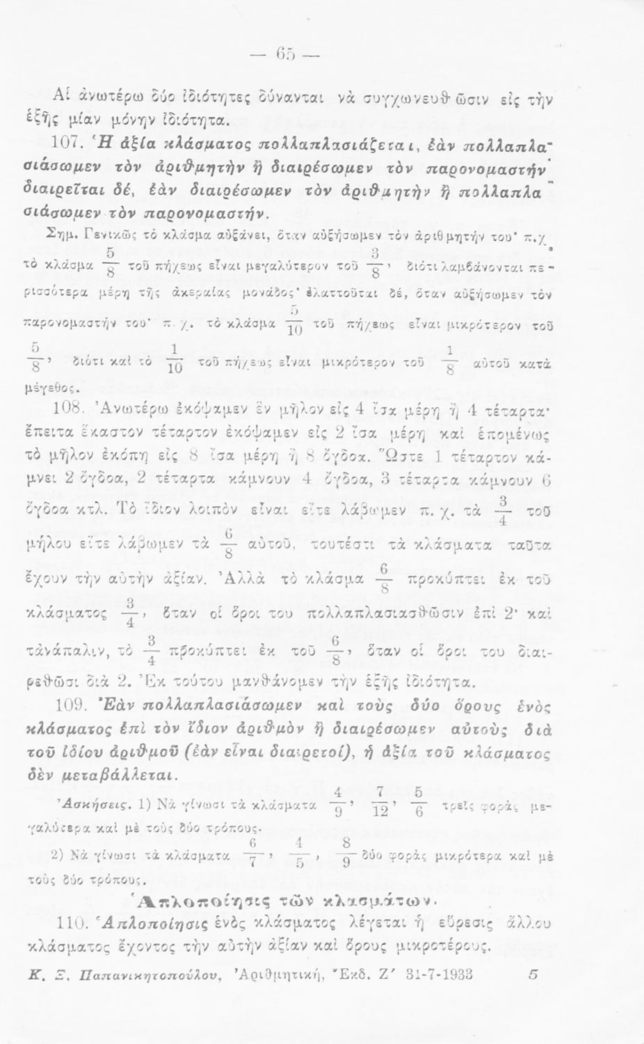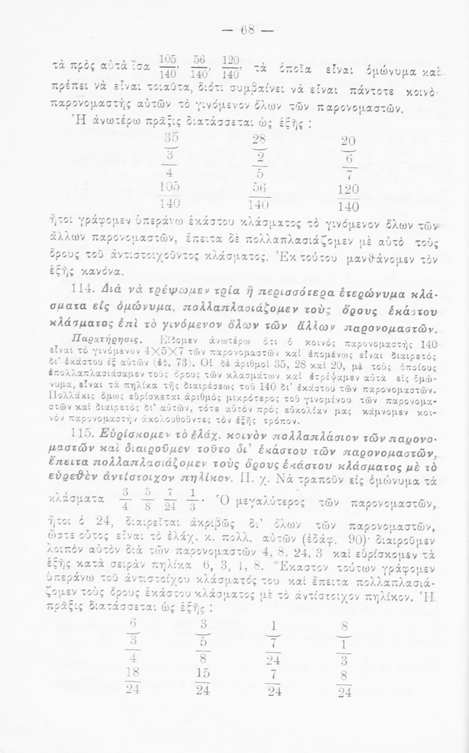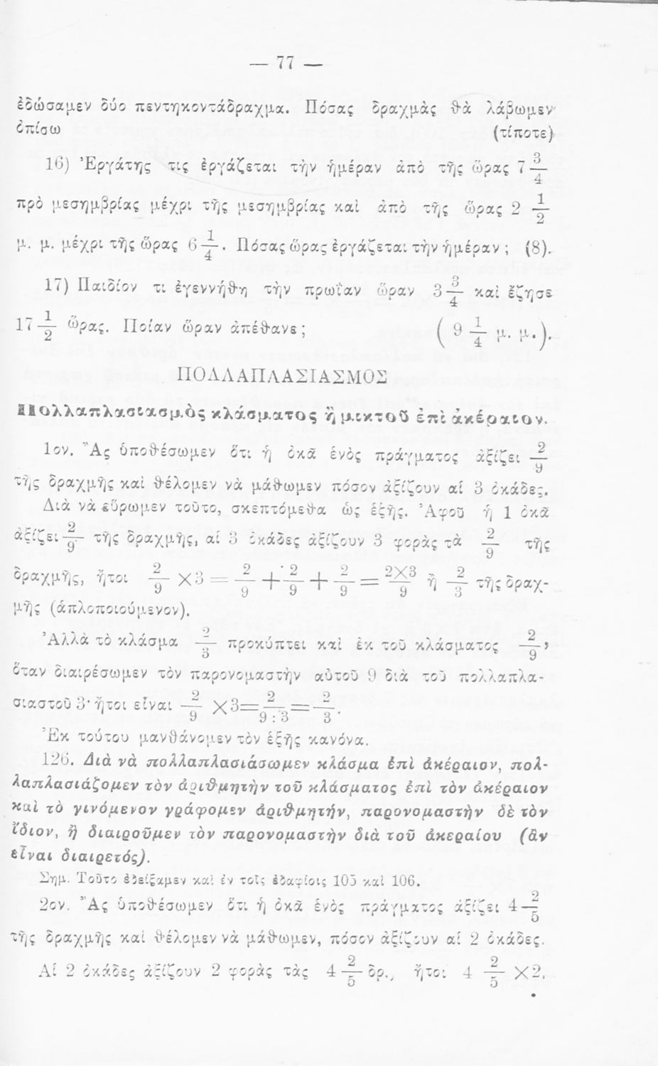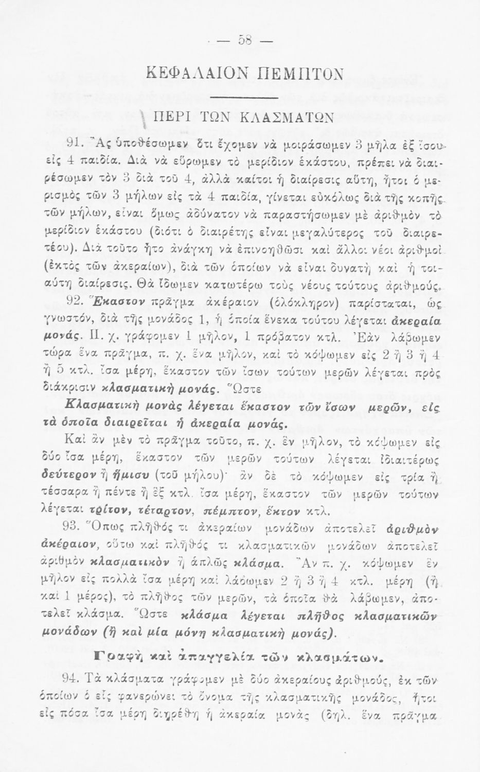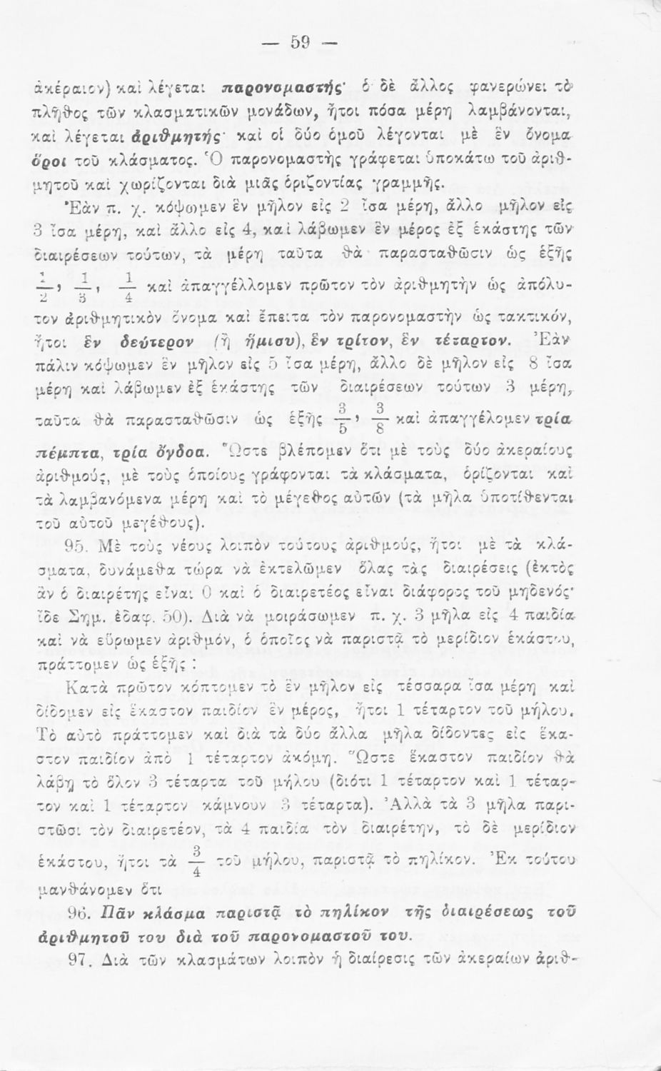 Σχολικό εγχειρίδιο Αριθμητικής για τις Α΄, Β΄, Γ΄ Γυμνασίου και τα Ανώτερα Παρθεναγωγεία που είναι χωρισμένο σε θεωρία και ασκήσεις και εστιάζει στις αριθμητικές πράξεις με κλάσματα και ακέραιους και συμμιγείς