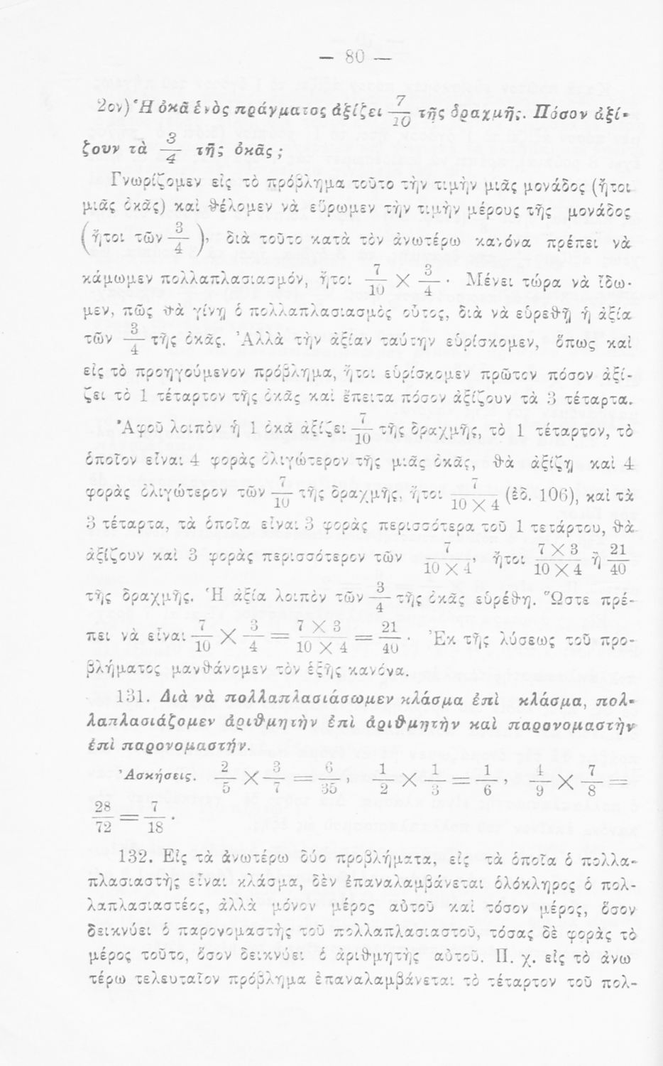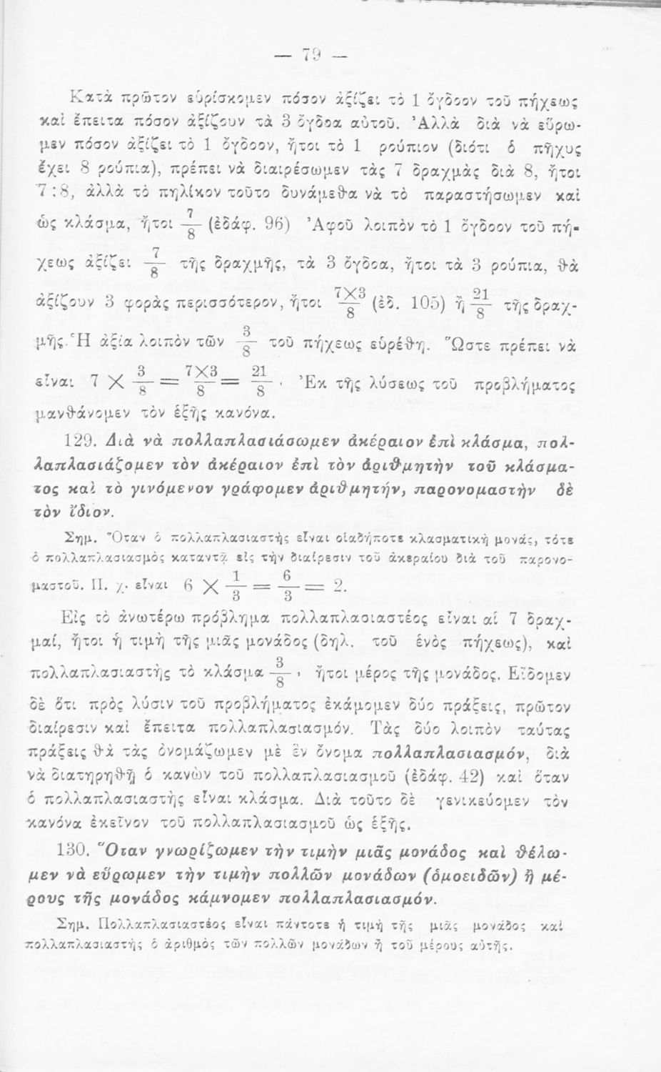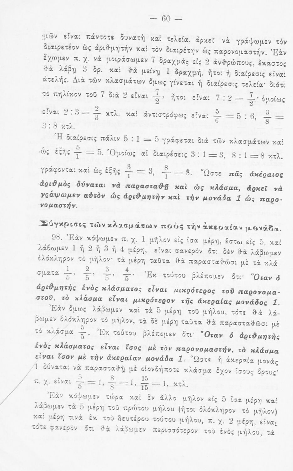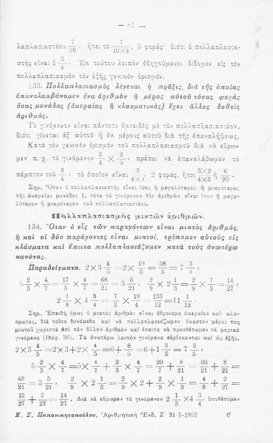 Σχολικό εγχειρίδιο Αριθμητικής για τις Α΄, Β΄, Γ΄ Γυμνασίου και τα Ανώτερα Παρθεναγωγεία που είναι χωρισμένο σε θεωρία και ασκήσεις και εστιάζει στις αριθμητικές πράξεις με κλάσματα και ακέραιους και συμμιγείς