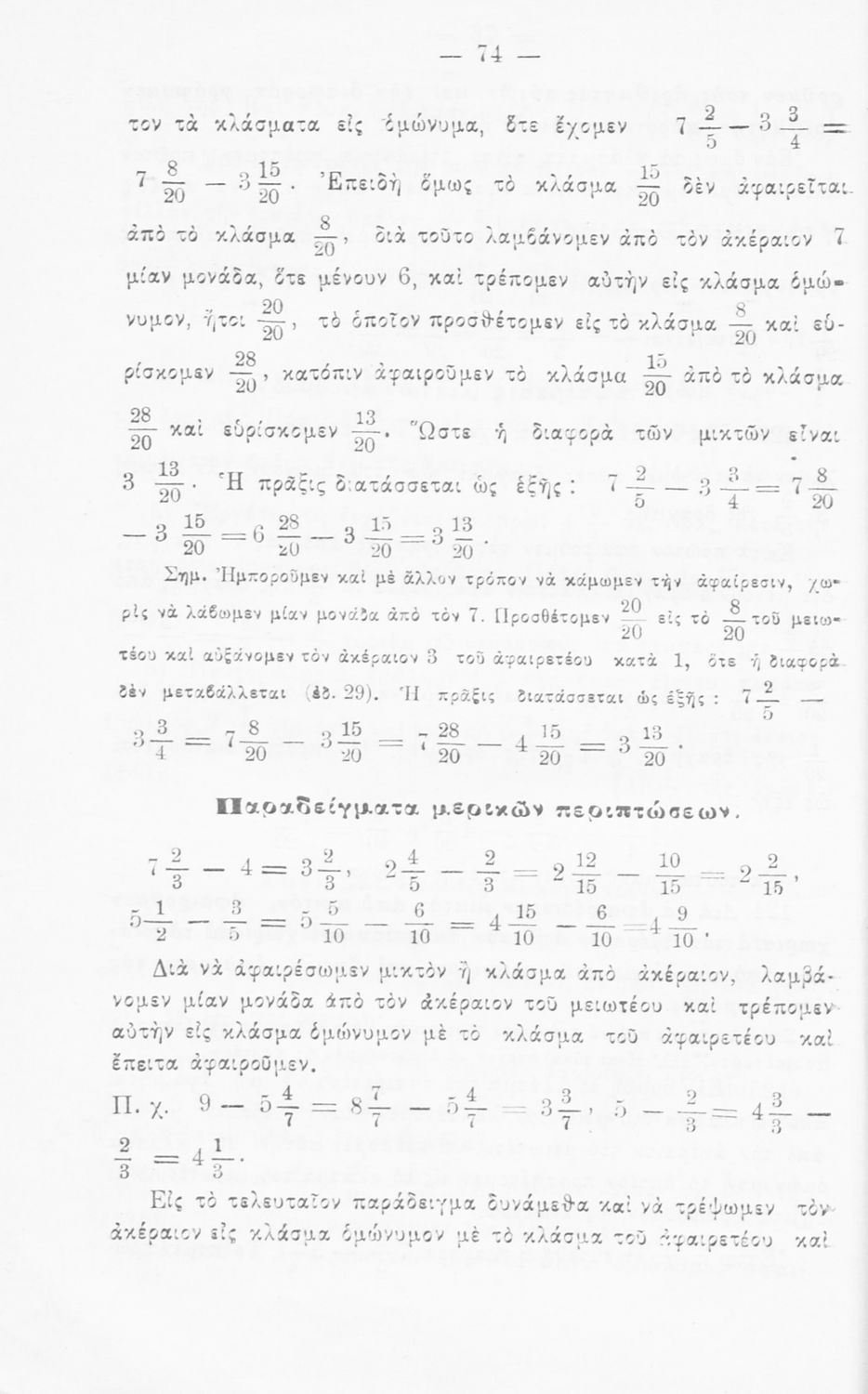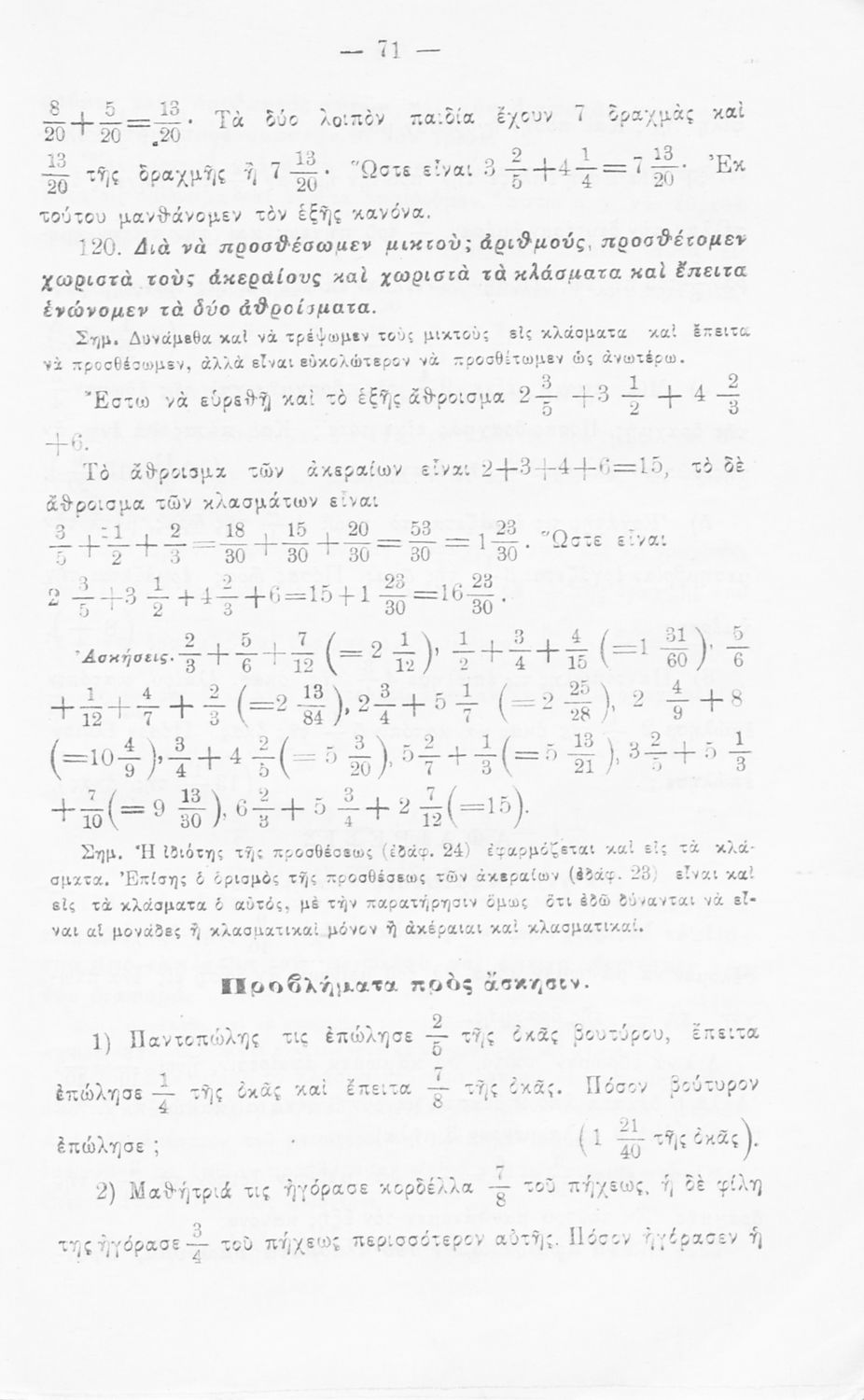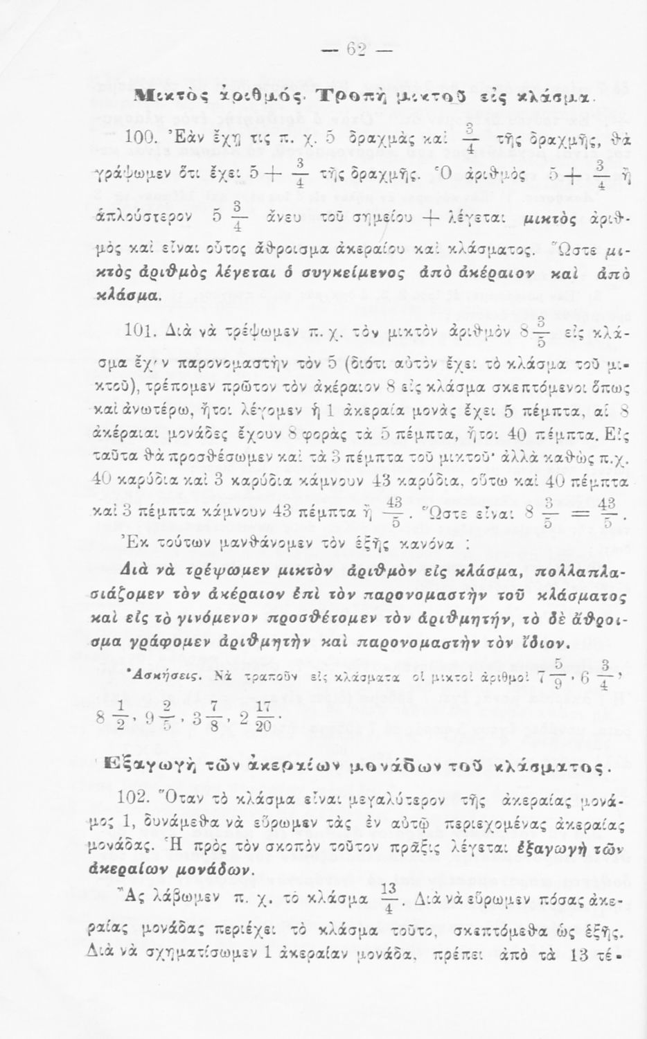 Σχολικό εγχειρίδιο Αριθμητικής για τις Α΄, Β΄, Γ΄ Γυμνασίου και τα Ανώτερα Παρθεναγωγεία που είναι χωρισμένο σε θεωρία και ασκήσεις και εστιάζει στις αριθμητικές πράξεις με κλάσματα και ακέραιους και συμμιγείς αριθμούς.