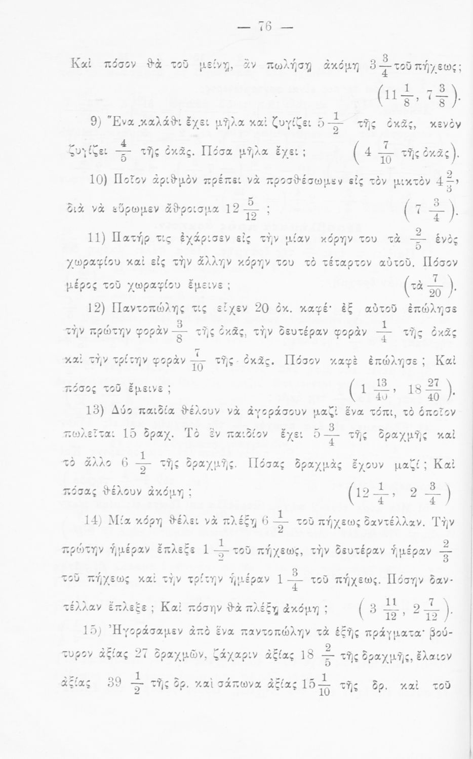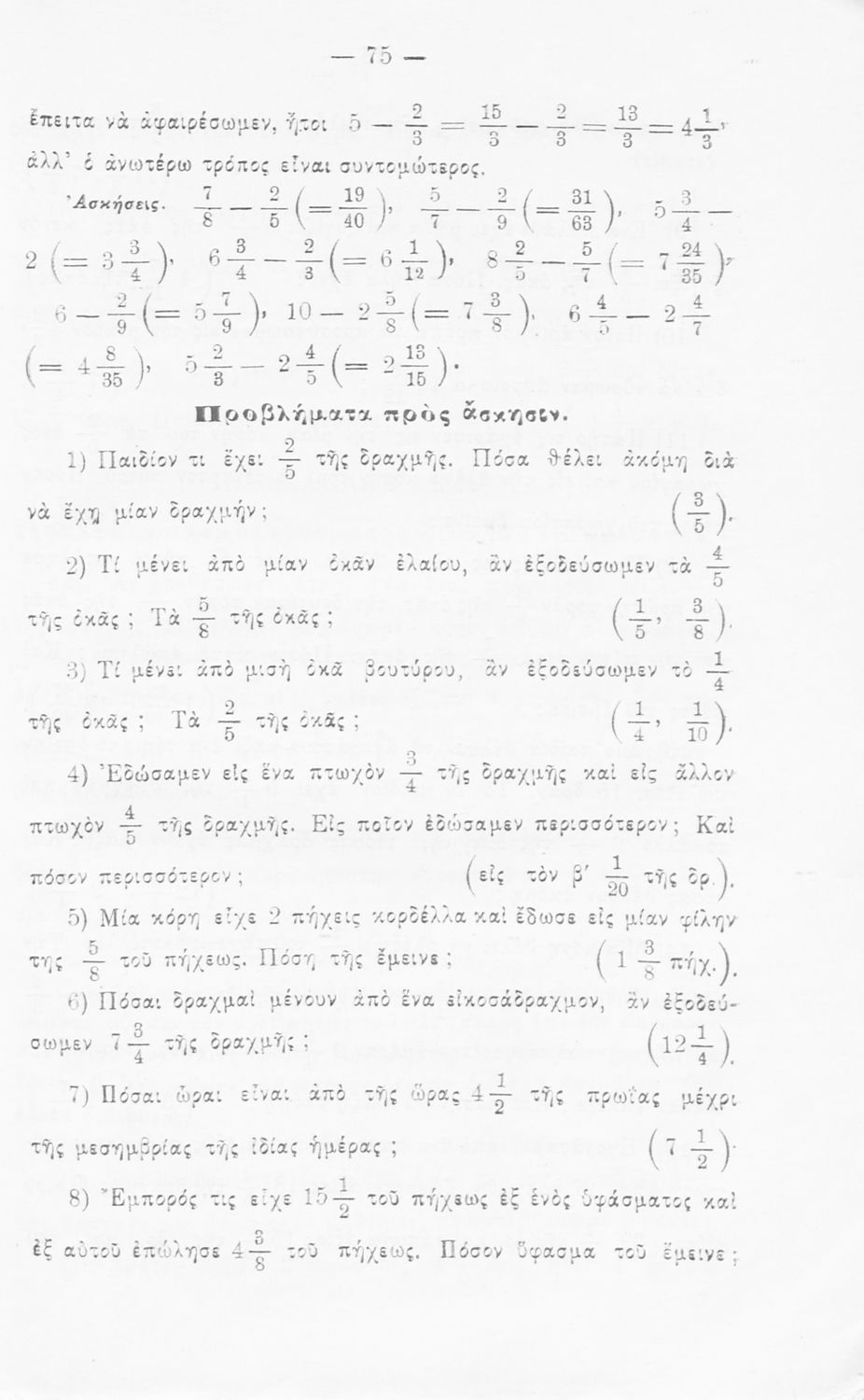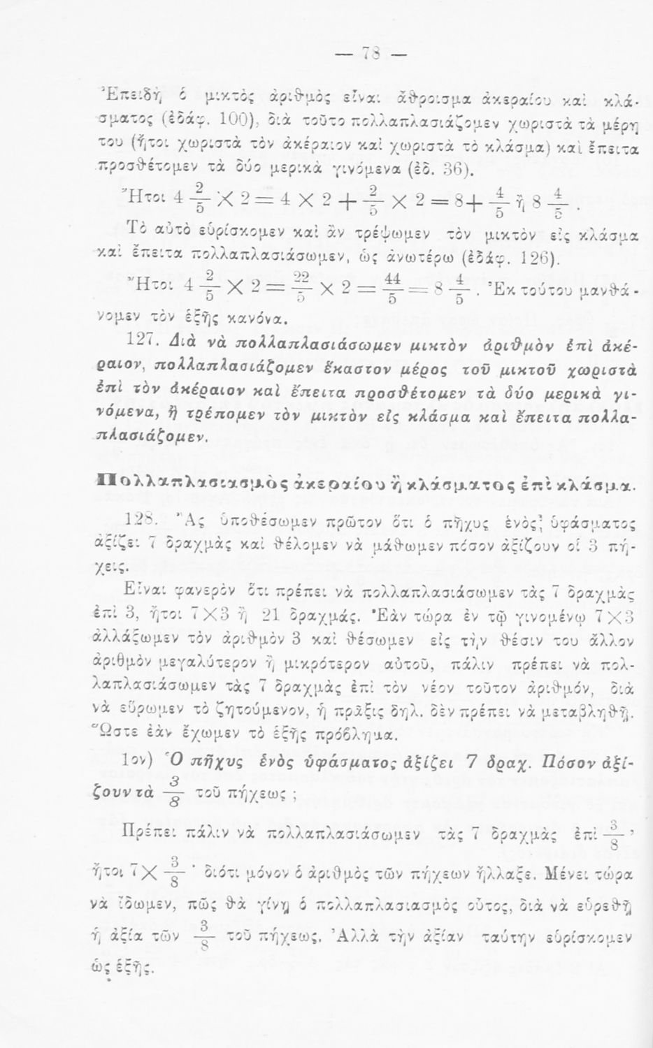Σχολικό εγχειρίδιο Αριθμητικής για τις Α΄, Β΄, Γ΄ Γυμνασίου και τα Ανώτερα Παρθεναγωγεία που είναι χωρισμένο σε θεωρία και ασκήσεις και εστιάζει στις αριθμητικές πράξεις με κλάσματα και ακέραιους και συμμιγείς αριθμούς.