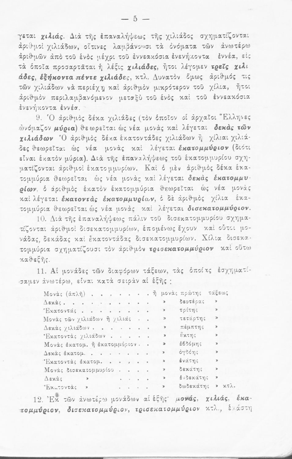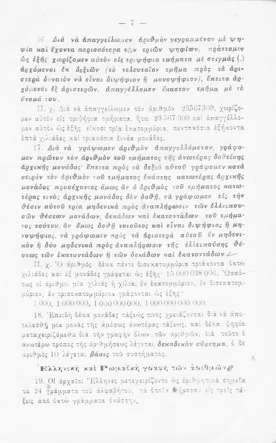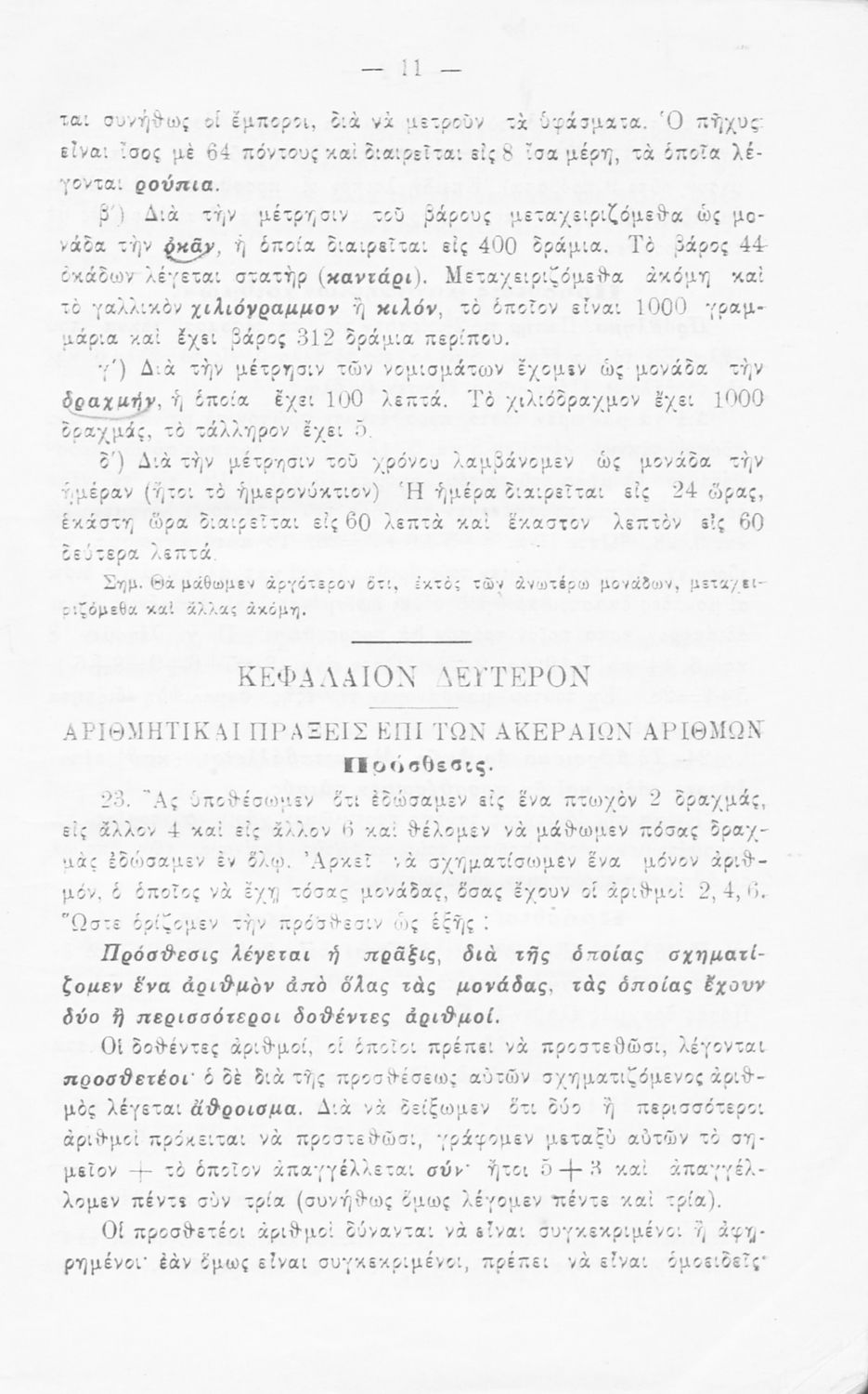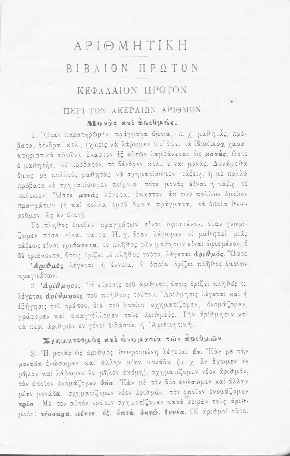 Βαθμίδα εκπαίδευσης: Δευτεροβάθμια Τάξη: Α' Γυμνασίου / Β' Γυμνασίου / Γ' Γυμνασίου Μάθημα: Αριθμητική Γλώσσα: Καθαρεύουσα Παρουσίαση περιεχομένου: Σχολικό εγχειρίδιο Αριθμητικής για τις Α΄, Β΄, Γ΄ Γυμνασίου και τα Ανώτερα Παρθεναγωγεία που είναι χωρισμένο σε θεωρία και ασκήσεις και εστιάζει στις αριθμητικές πράξεις με κλάσματα και ακέραιους και συμμιγείς αριθμούς. |