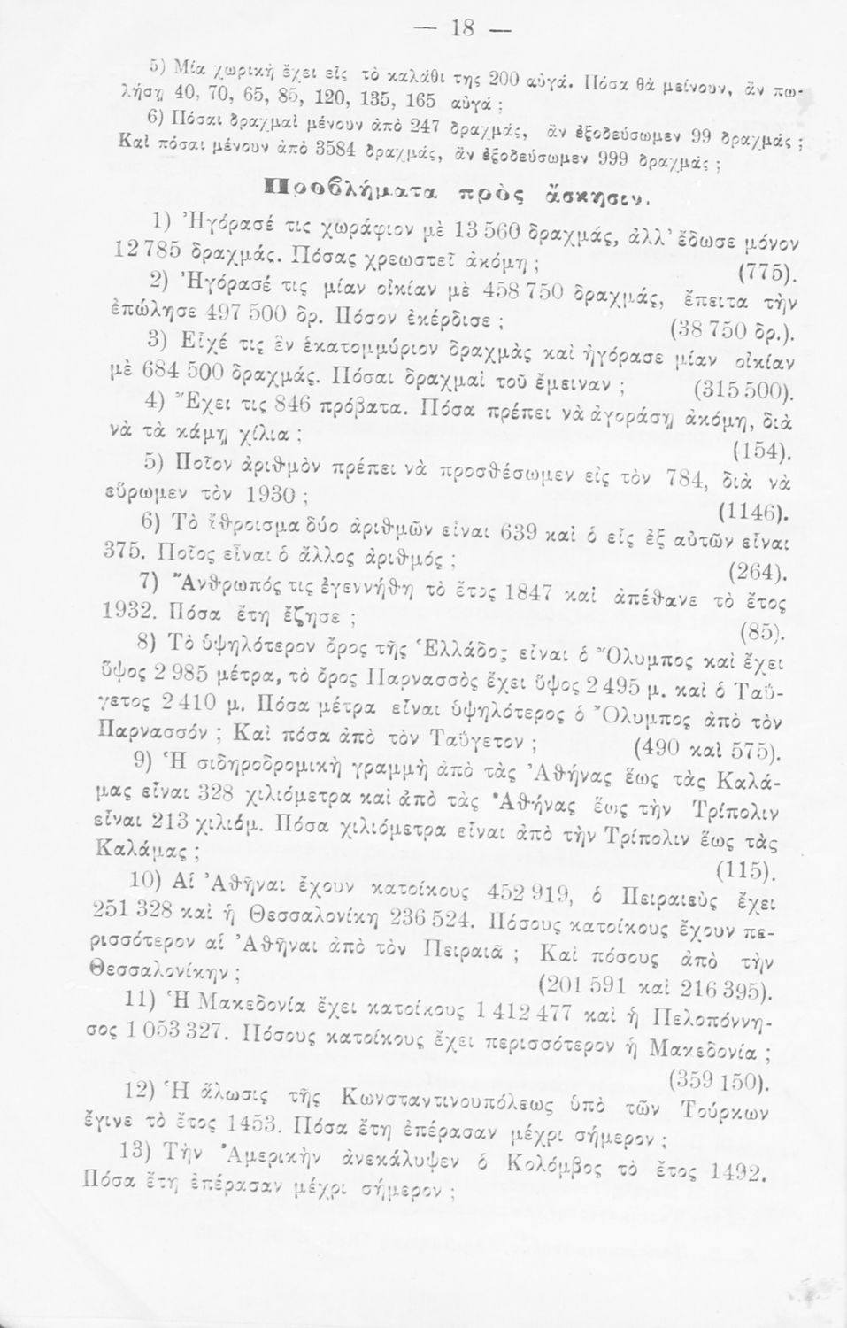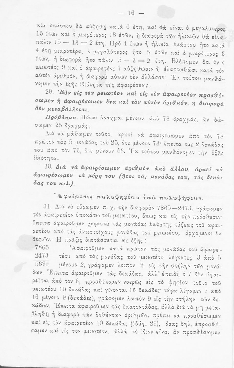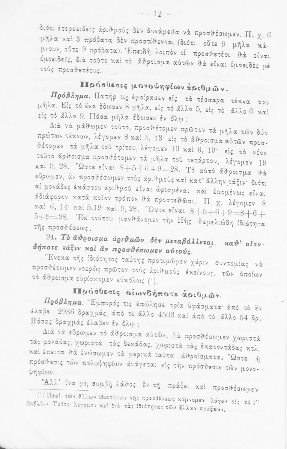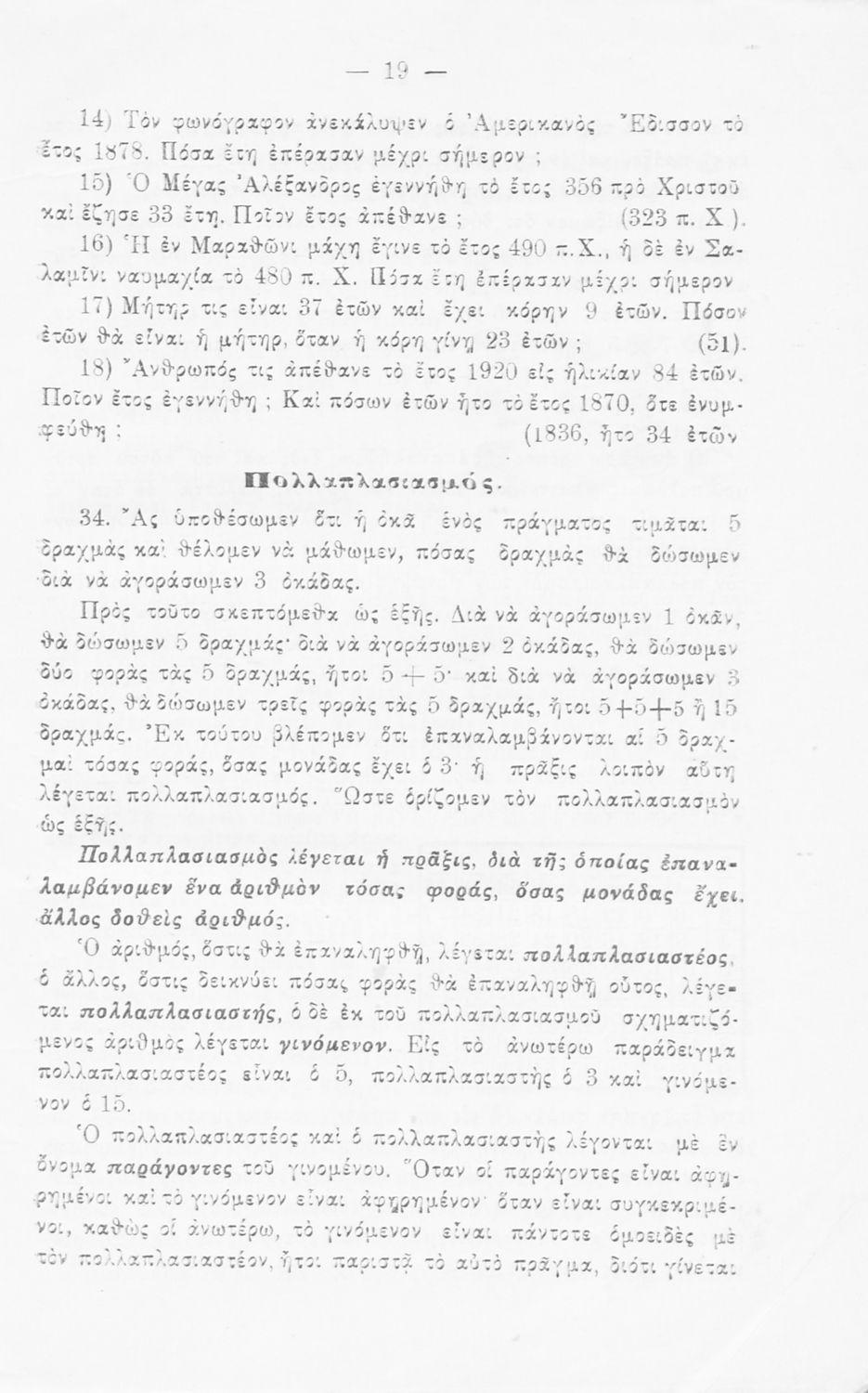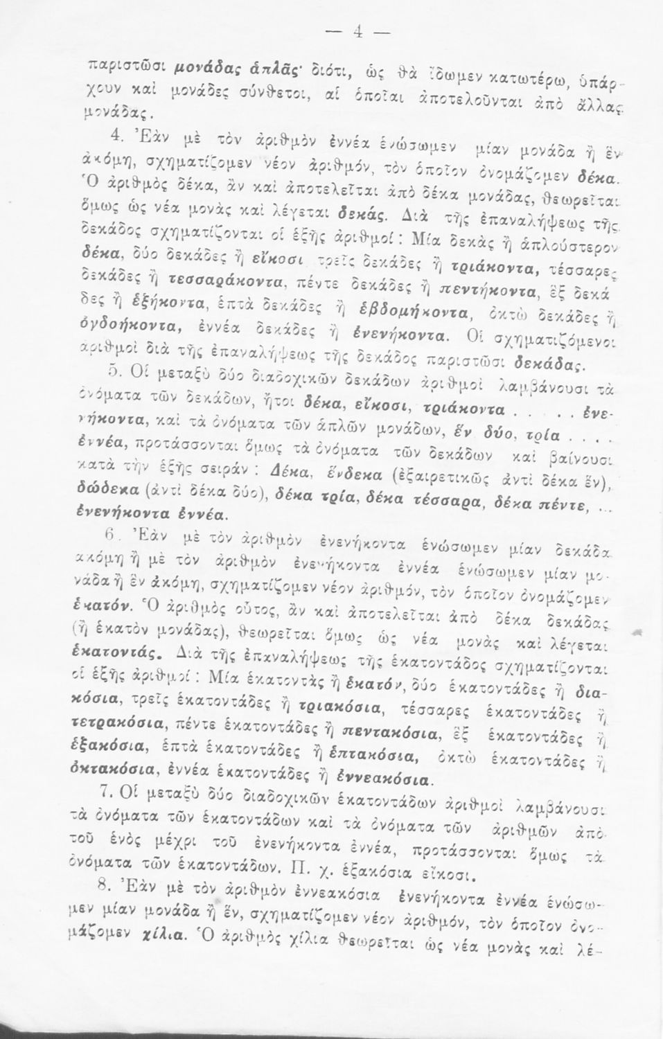 Βαθμίδα εκπαίδευσης: Δευτεροβάθμια Τάξη: Α' Γυμνασίου / Β' Γυμνασίου / Γ' Γυμνασίου Μάθημα: Αριθμητική Γλώσσα: Καθαρεύουσα Παρουσίαση περιεχομένου: Σχολικό εγχειρίδιο Αριθμητικής για τις Α΄, Β΄, Γ΄ Γυμνασίου και τα Ανώτερα Παρθεναγωγεία που είναι χωρισμένο σε θεωρία και ασκήσεις και εστιάζει στις αριθμητικές πράξεις με κλάσματα και ακέραιους και συμμιγείς αριθμούς. |
