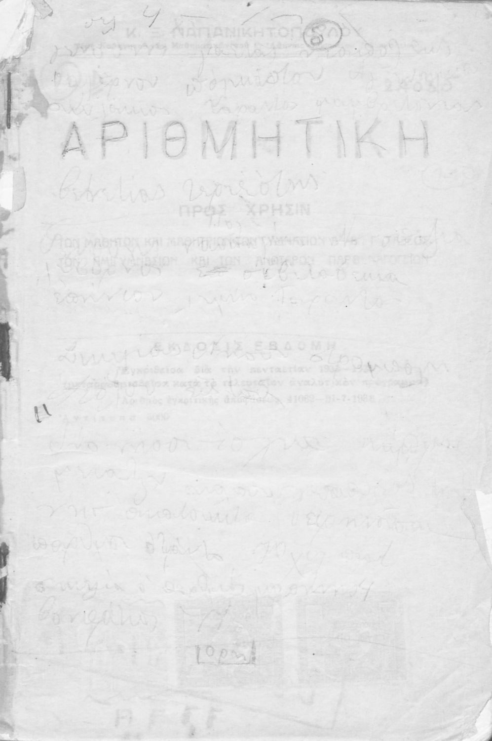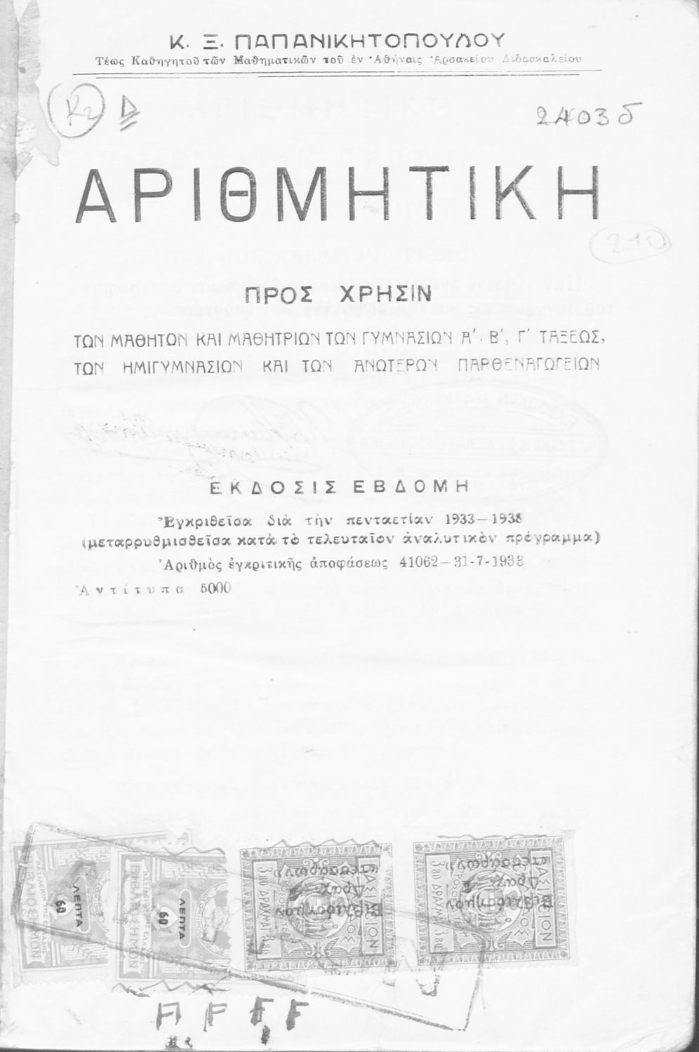 Κωδικός αναγνώρισης: 05-00210 Τίτλος: Αριθμητική προς χρήσιν των μαθητών και μαθητριών των Γυμνασίων Α΄, Β΄, Γ΄ τάξεως, των Ημιγυμνασίων και των Ανωτέρων Παρθεναγωγείων Συγγραφέας: Κ. Ξ. Παπανικητόπουλος Μέγεθος και υπόστρωμα: Σχολικό εγχειρίδιο, μαλακό εξώφυλλο, 239 σελίδες. |