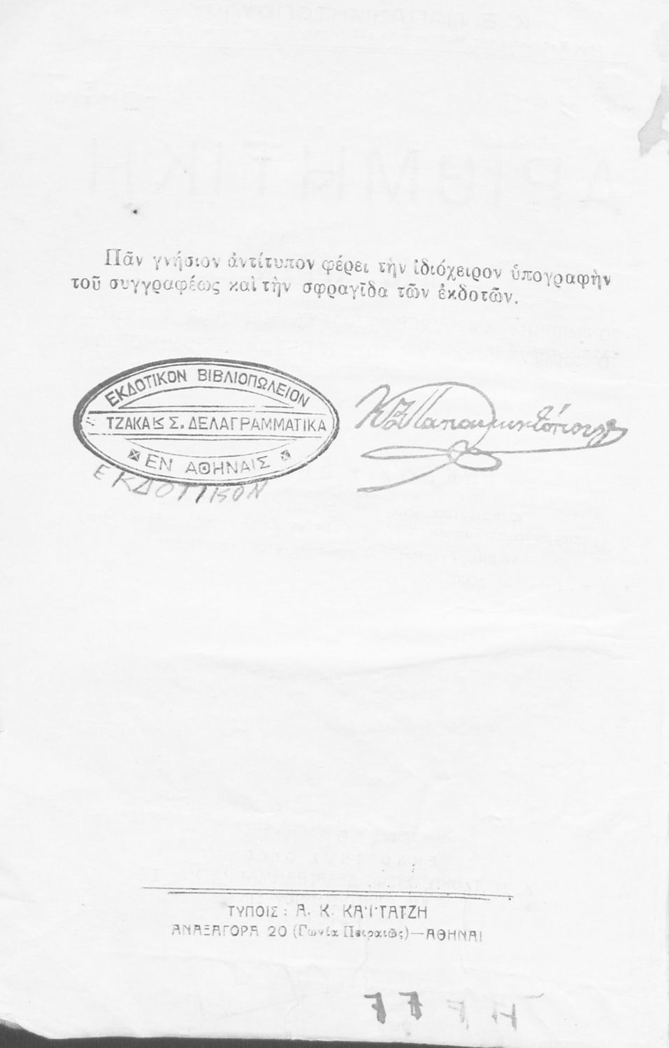 Εκδότης: Δημ. Ν. Τζάκας, Στεφ. Δελαγραμμάτικας Έτος έκδοσης: 1933 Τόπος έκδοσης: Αθήνα Έκδοση: 7η Υπουργική απόφαση / Σύμβαση: 41062/31-7-1933 |