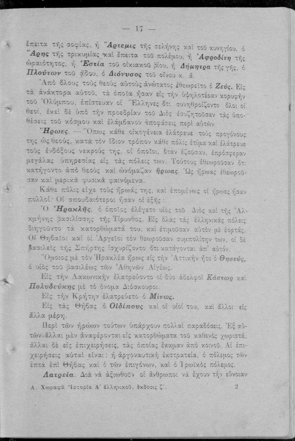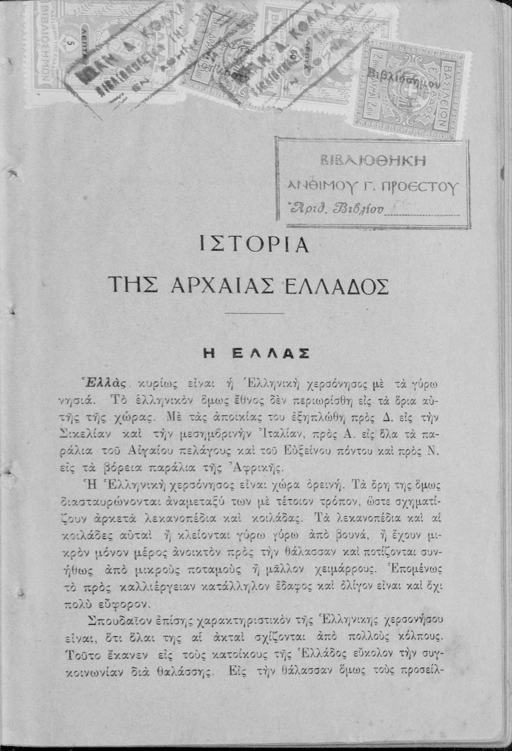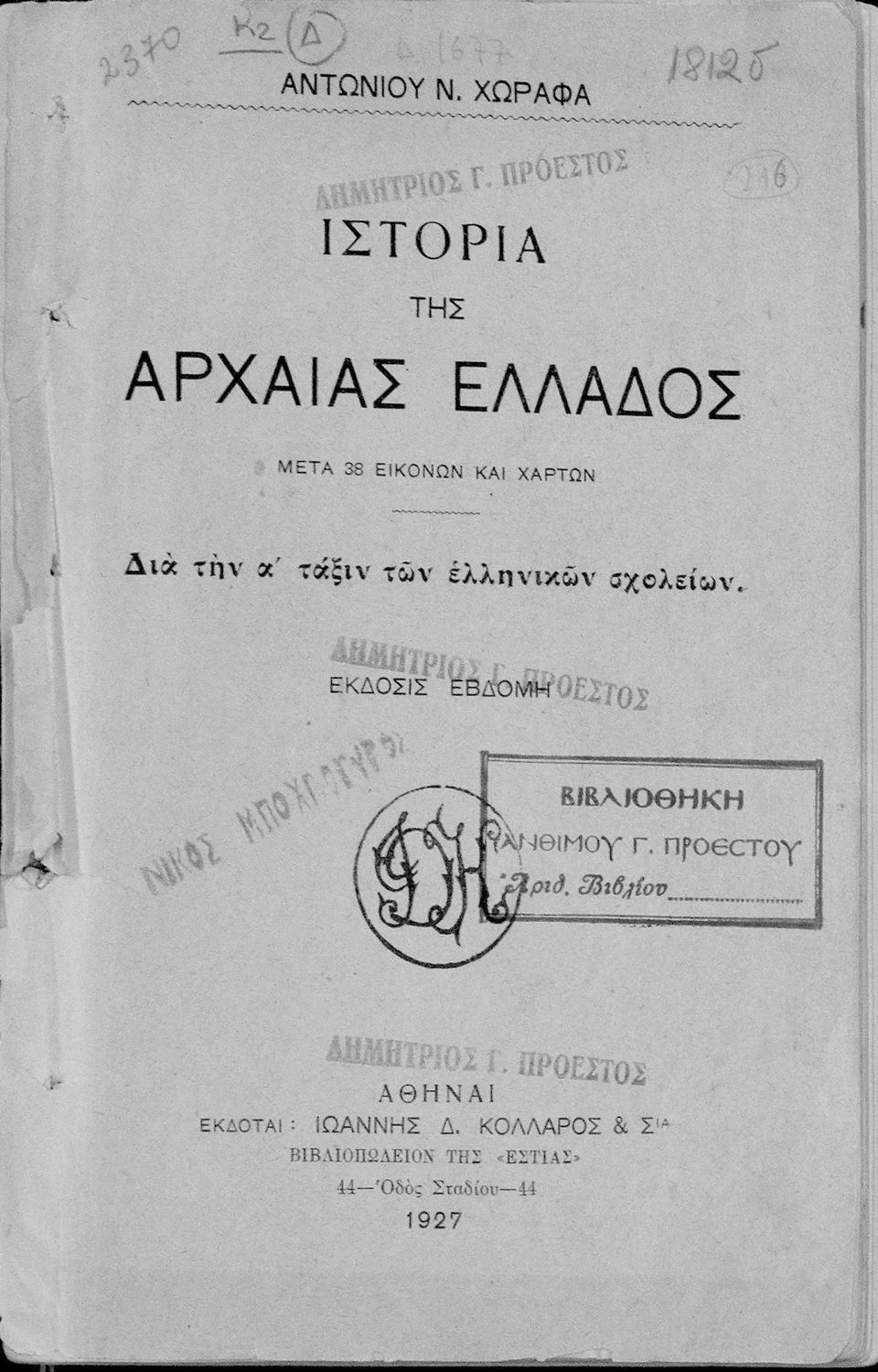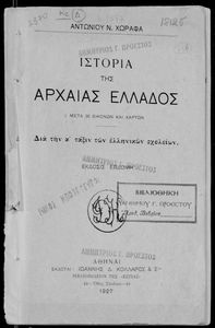 Κωδικός αναγνώρισης: 05-00216 Τίτλος: Ιστορία της αρχαίας Ελλάδος μετά 38 εικόνων και χαρτών. Διά την Α΄ τάξιν των Ελληνικών Σχολείων Συγγραφέας: Αντώνιος Ν. Χωραφάς Μέγεθος και υπόστρωμα: Σχολικό εγχειρίδιο, μαλακό εξώφυλλο, 144 σελίδες. Εικόνες (ασπρόμαυρες), σκίτσα (ασπρόμαυρα), χάρτες (ασπρόμαυροι). |