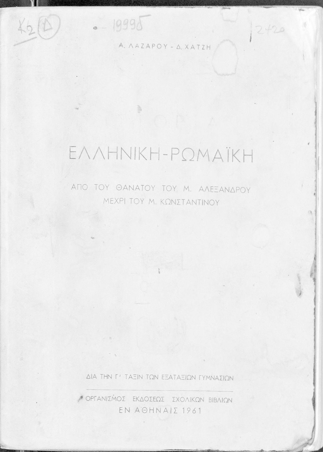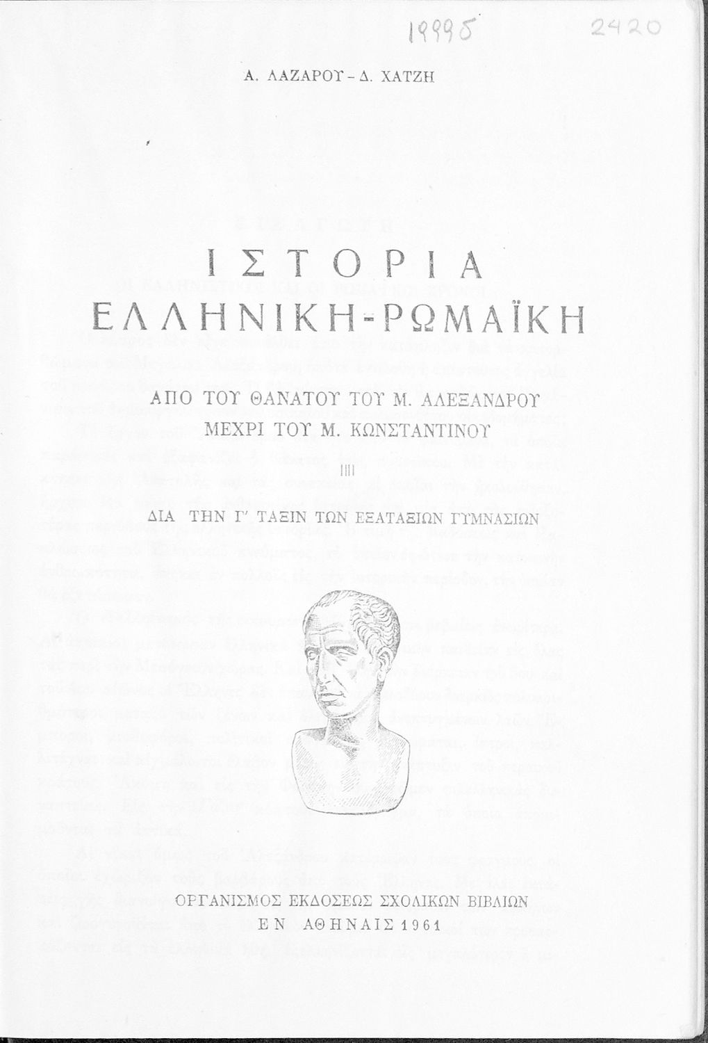 Κωδικός αναγνώρισης: 05-00217 Τίτλος: Ιστορία Ελληνική - Ρωμαϊκή από του θανάτου του Μ. Αλεξάνδρου μέχρι του Μ. Κωνσταντίνου. Διά την Γ΄ τάξιν των Εξαταξίων Γυμνασίων Συγγραφέας: Α. Λαζάρου, Δ. Χατζής Μέγεθος και υπόστρωμα: Σχολικό εγχειρίδιο, μαλακό εξώφυλλο, 263 σελίδες. Εικόνες (ασπρόμαυρες). |