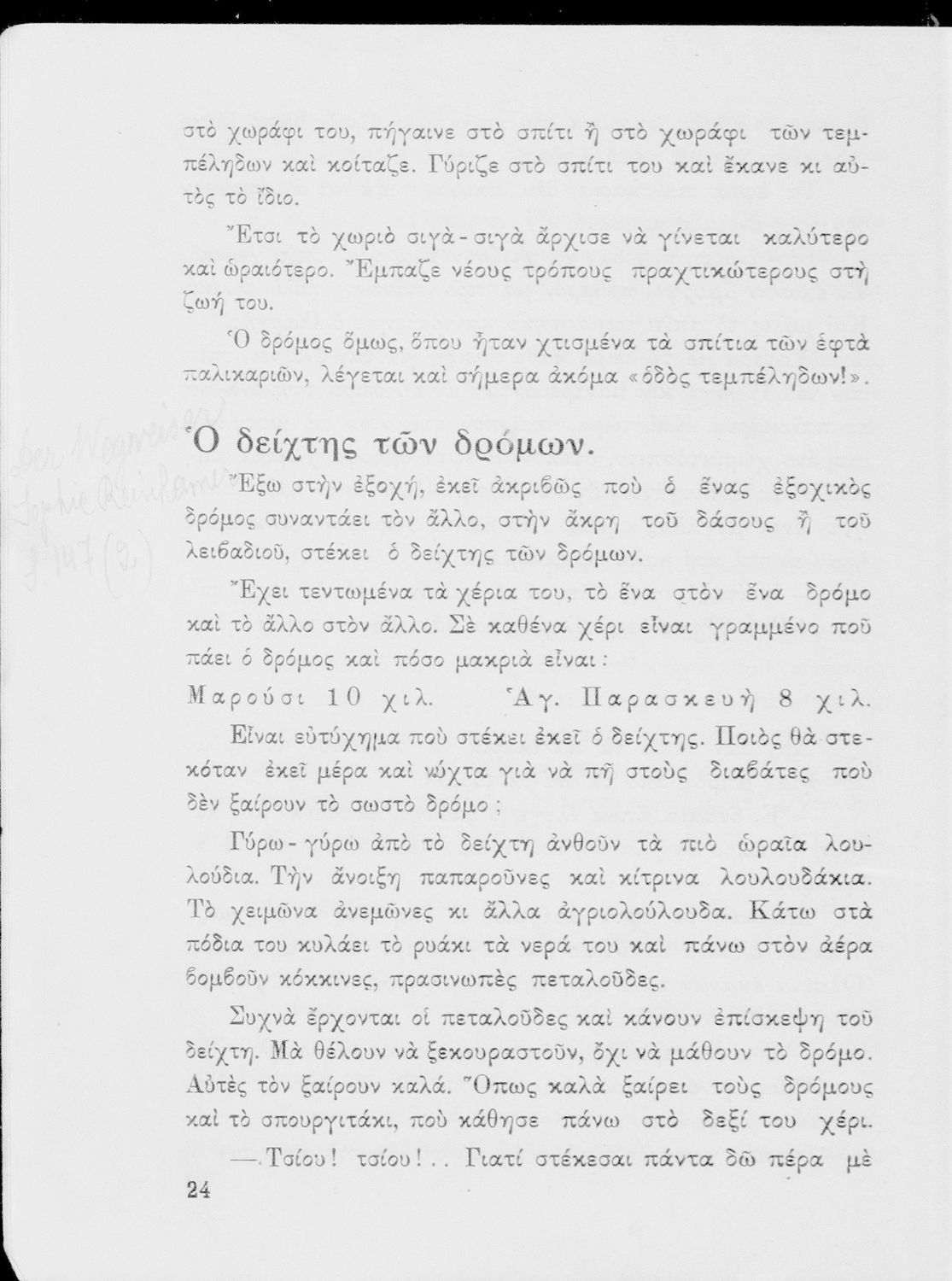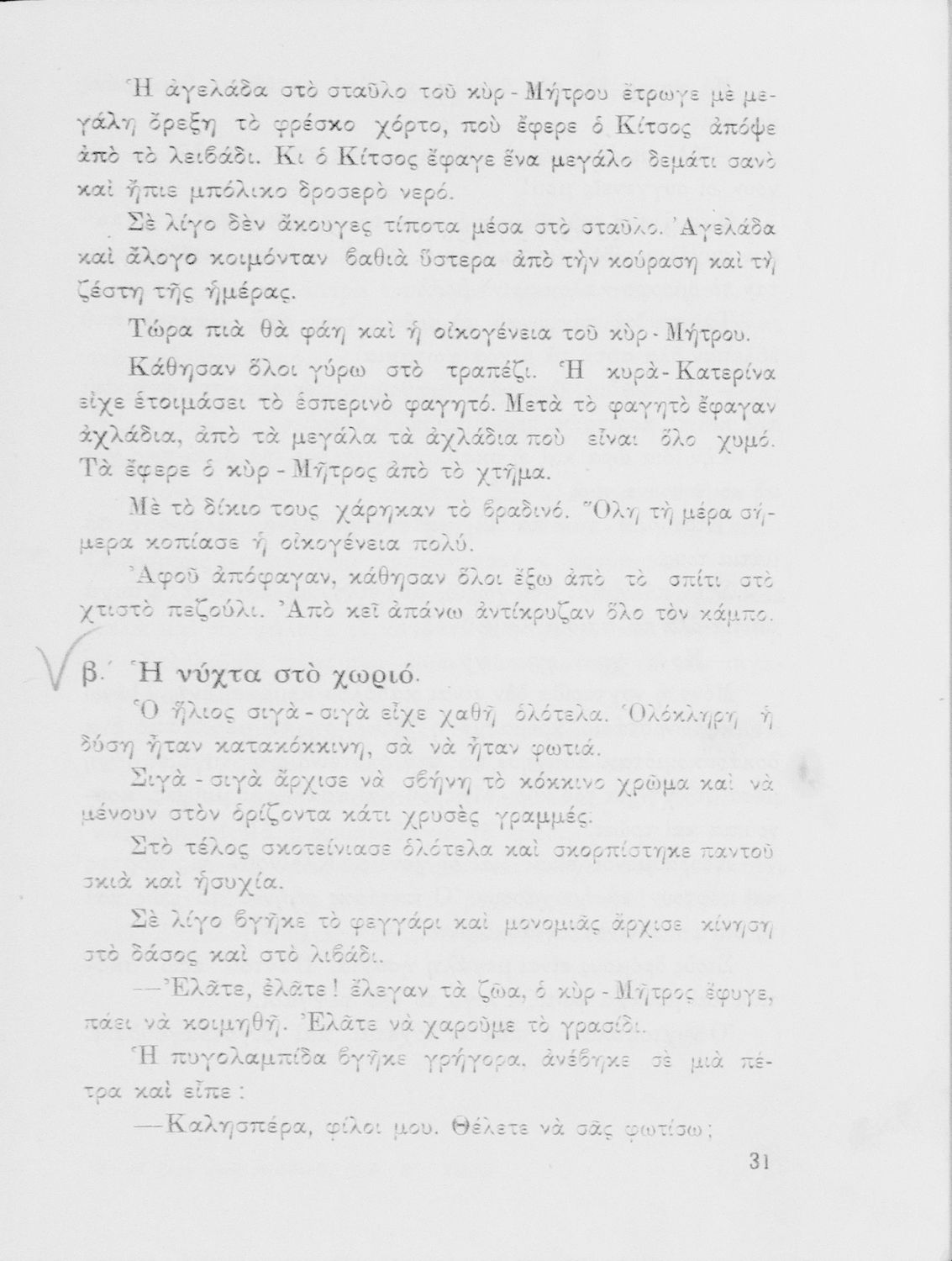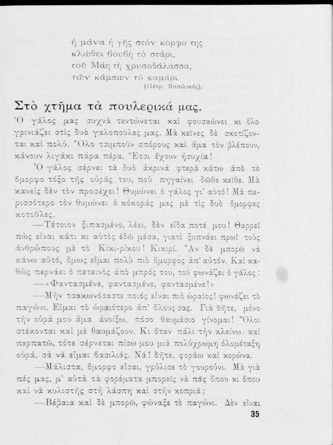 Αναγνωστικό Γ΄ Δημοτικού που περιλαμβάνει ποιήματα και πεζά εμπνευσμένα από τη ζωή της υπαίθρου, την οικογενειακή και κοινωνική ζωή και το εθνικό παρελθόν. Αποτυπώνει τις ιδεολογικές προκείμενες του μεταξικού ...