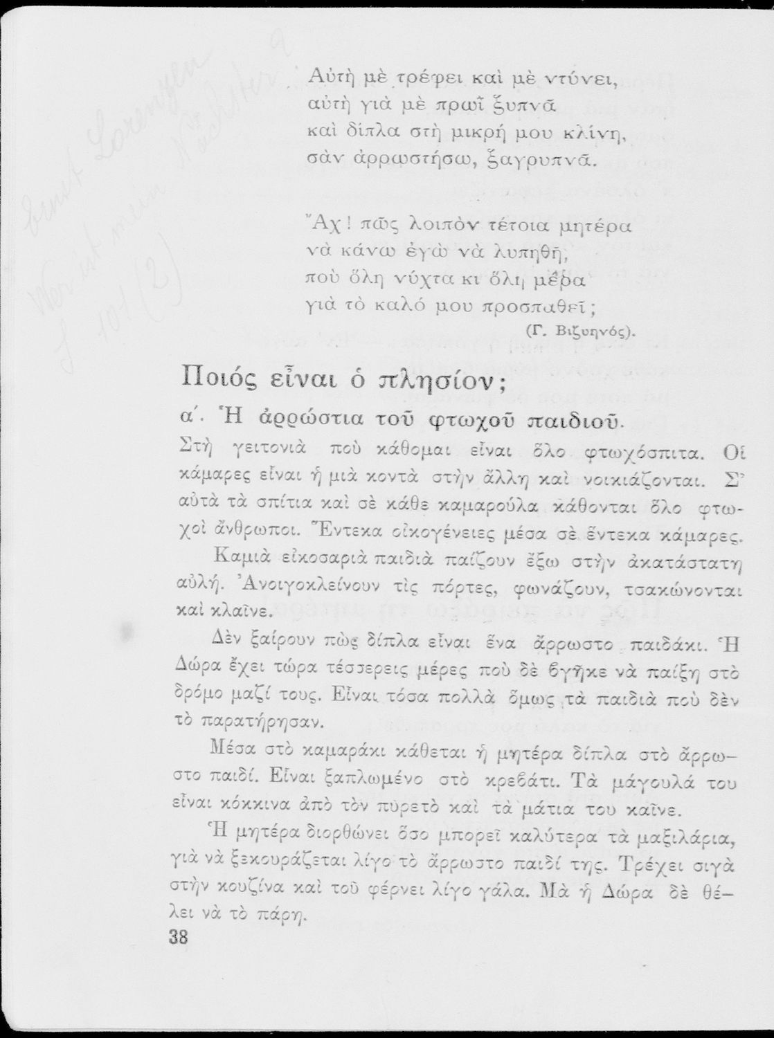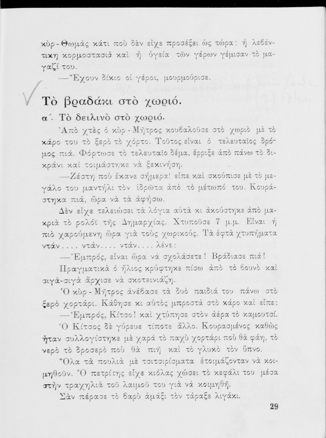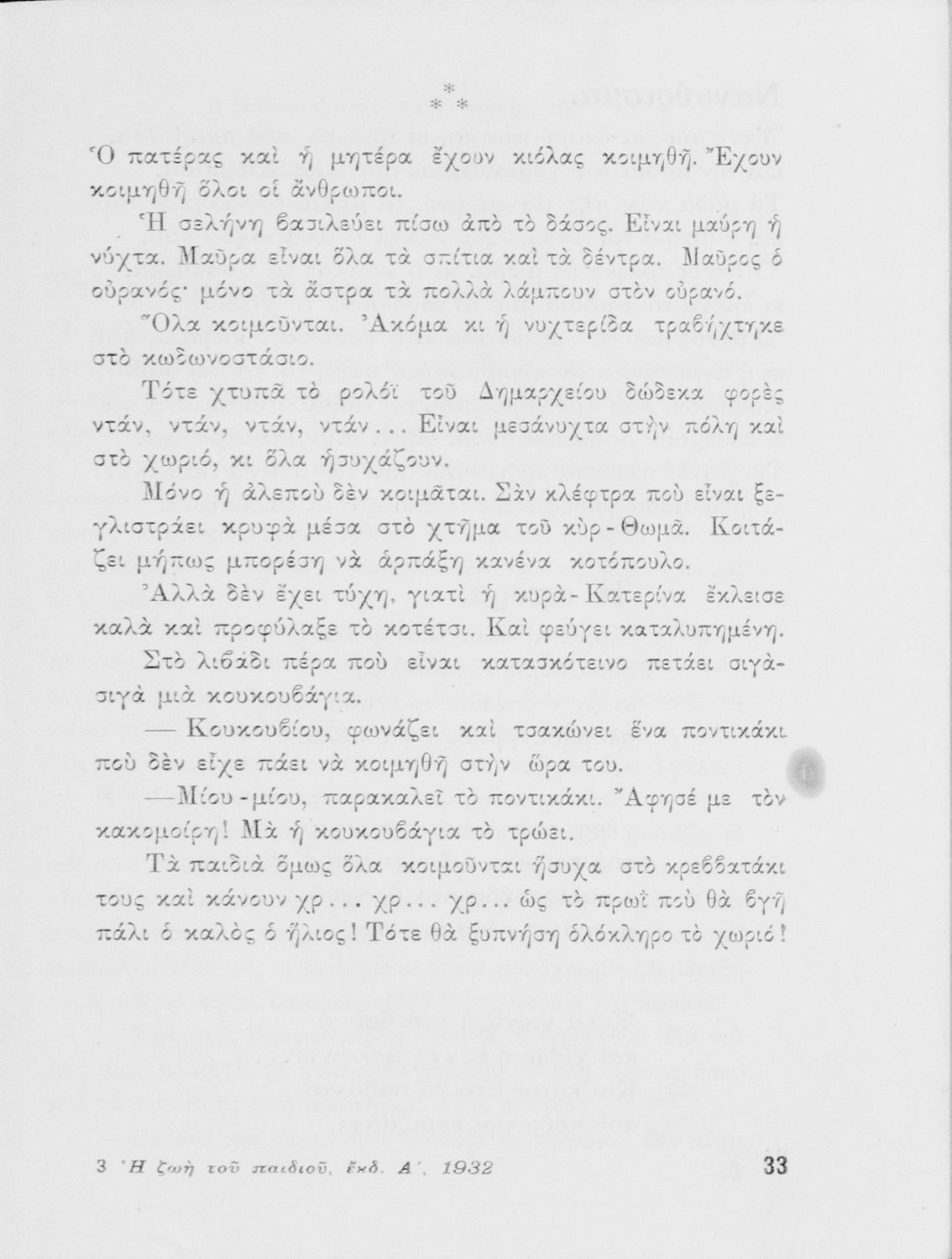 Αναγνωστικό Γ΄ Δημοτικού που περιλαμβάνει ποιήματα και πεζά εμπνευσμένα από τη ζωή της υπαίθρου, την οικογενειακή και κοινωνική ζωή και το εθνικό παρελθόν. Αποτυπώνει τις ιδεολογικές προκείμενες του μεταξικού ...