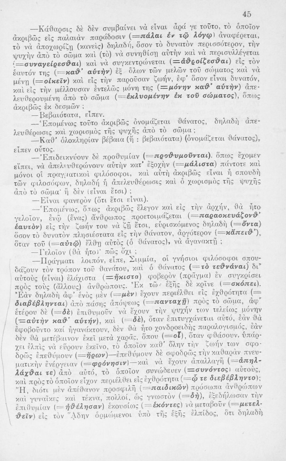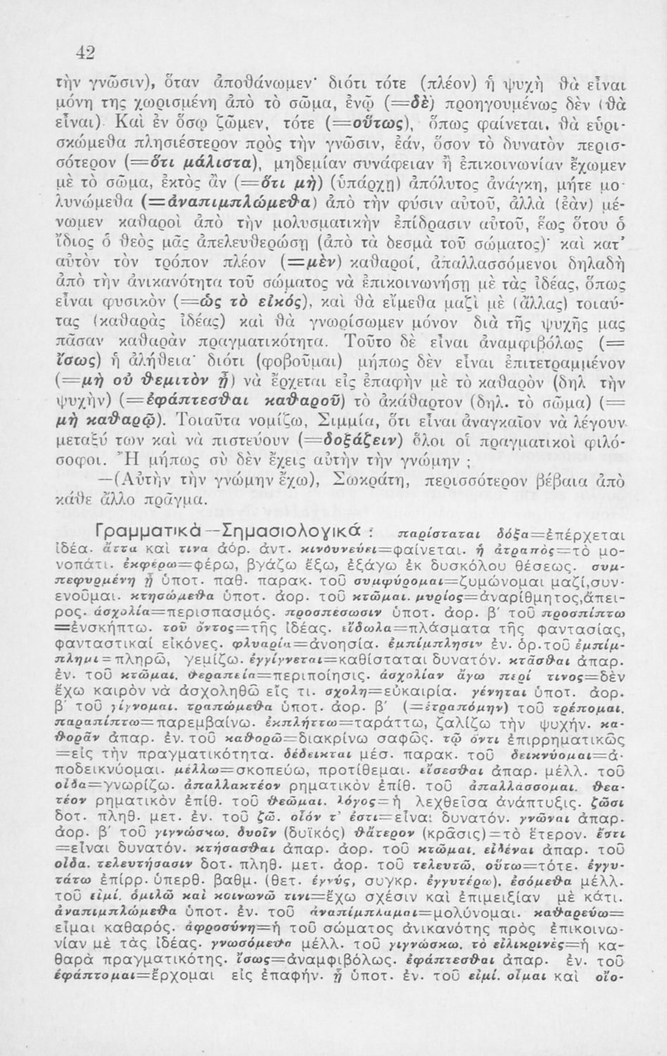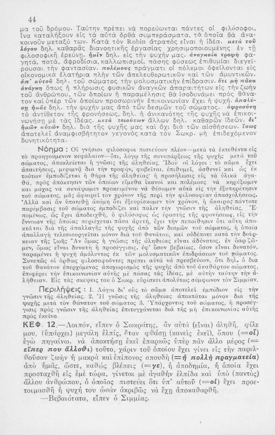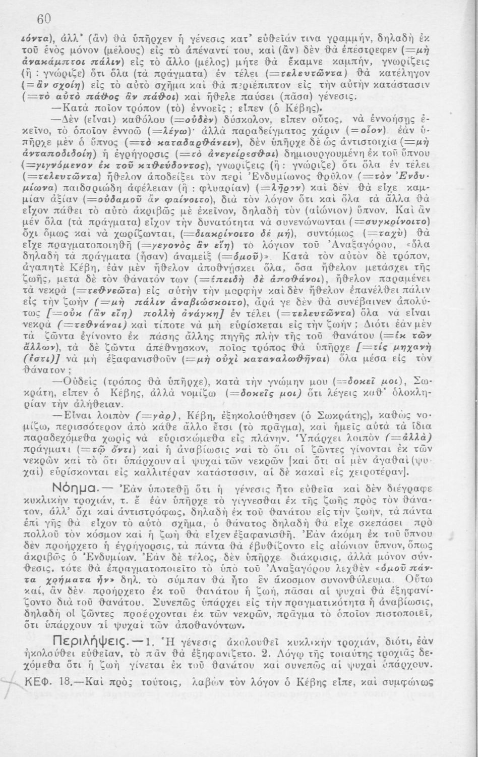 Μαθητικό βοήθημα Αρχαίων Ελληνικών για την Η' Γυμνασίου που περιλαμβάνει εισαγωγή και μετάφραση του Φαίδωνα του Πλάτωνα καθώς και ερμηνευτικά, γραμματικά και πραγματολογικά σχόλια.