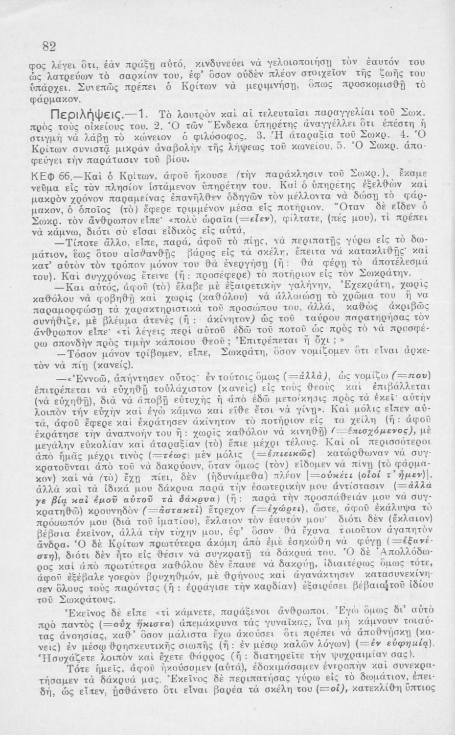 Μαθητικό βοήθημα Αρχαίων Ελληνικών για την Η' Γυμνασίου που περιλαμβάνει εισαγωγή και μετάφραση του Φαίδωνα του Πλάτωνα καθώς και ερμηνευτικά, γραμματικά και πραγματολογικά σχόλια.