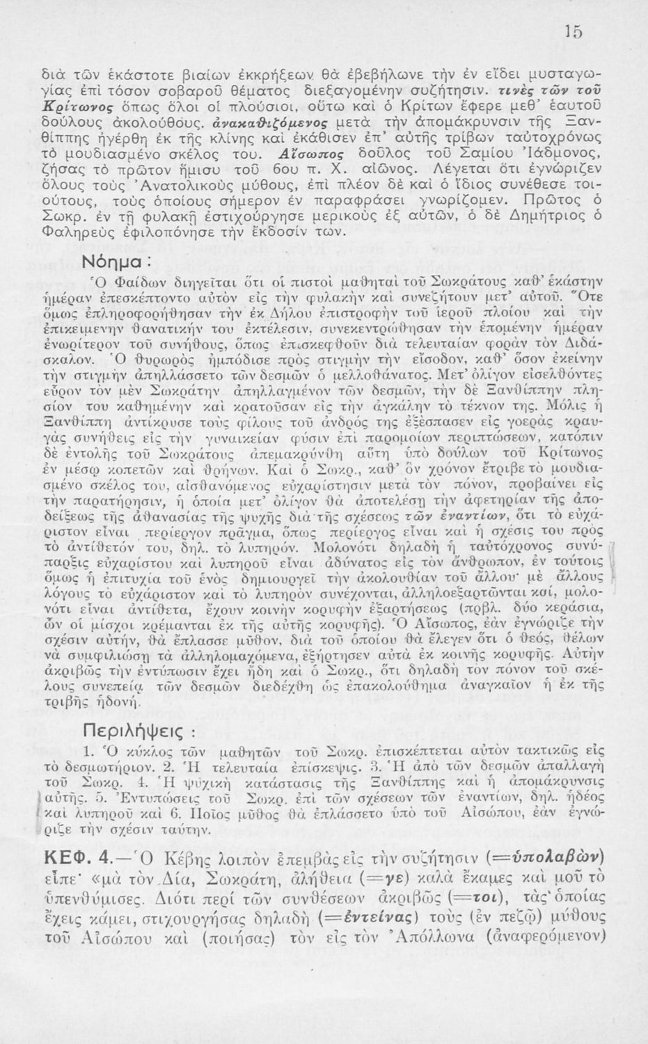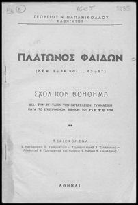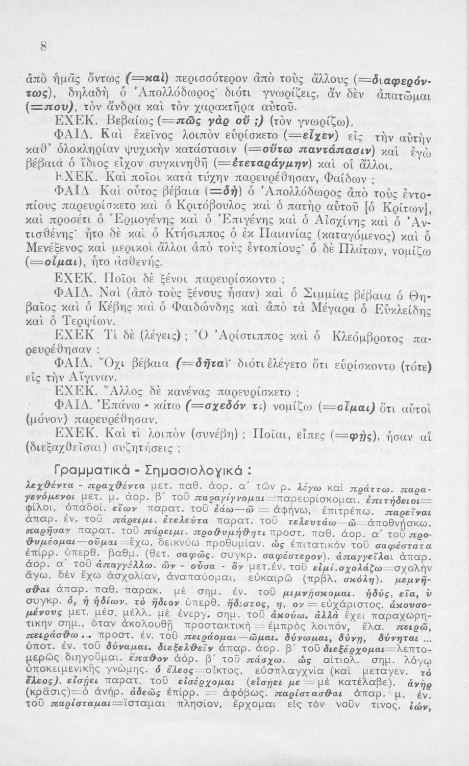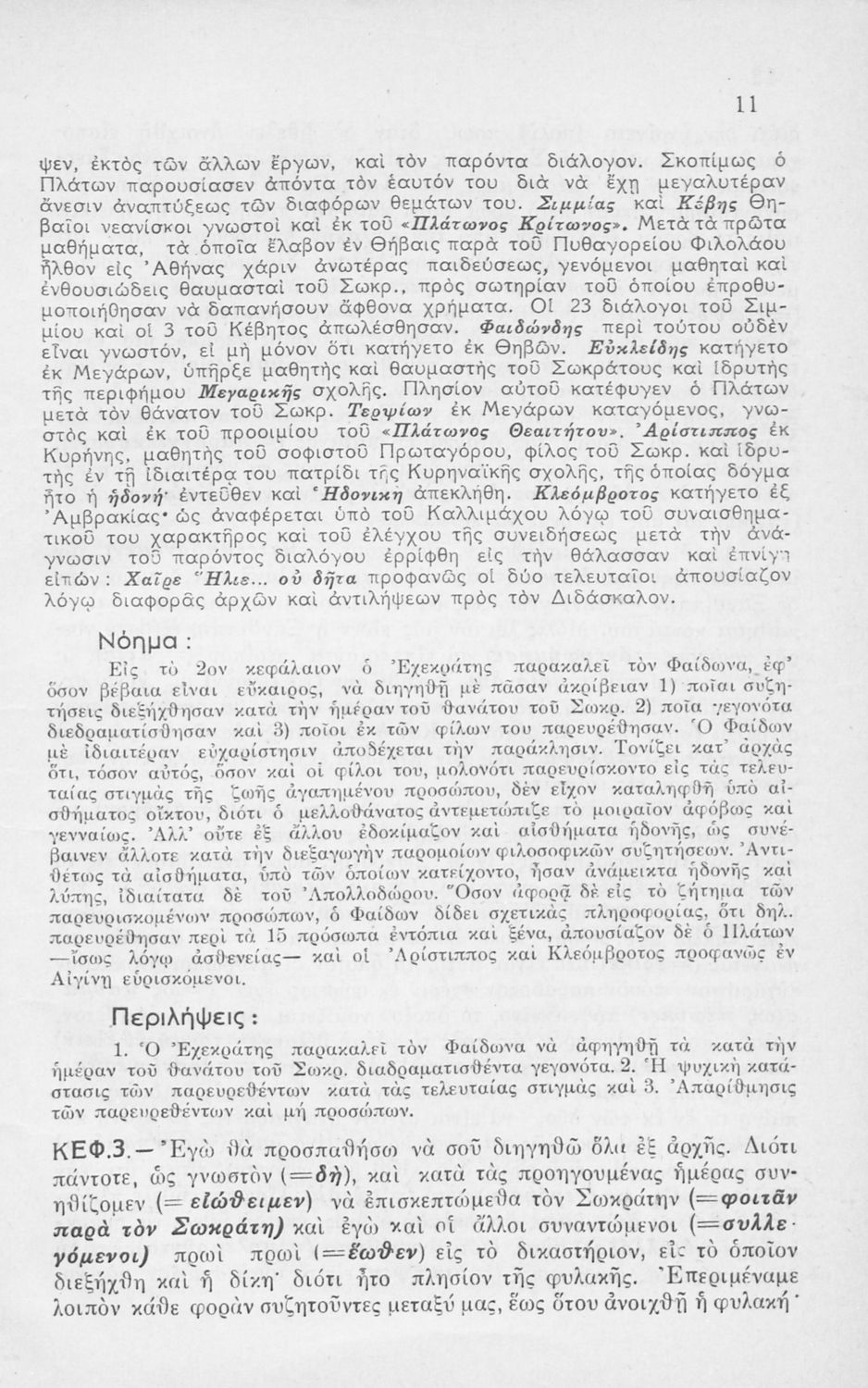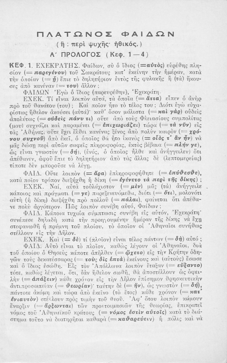 Μαθητικό βοήθημα Αρχαίων Ελληνικών για την Η' Γυμνασίου που περιλαμβάνει εισαγωγή και μετάφραση του Φαίδωνα του Πλάτωνα καθώς και ερμηνευτικά, γραμματικά και πραγματολογικά σχόλια.