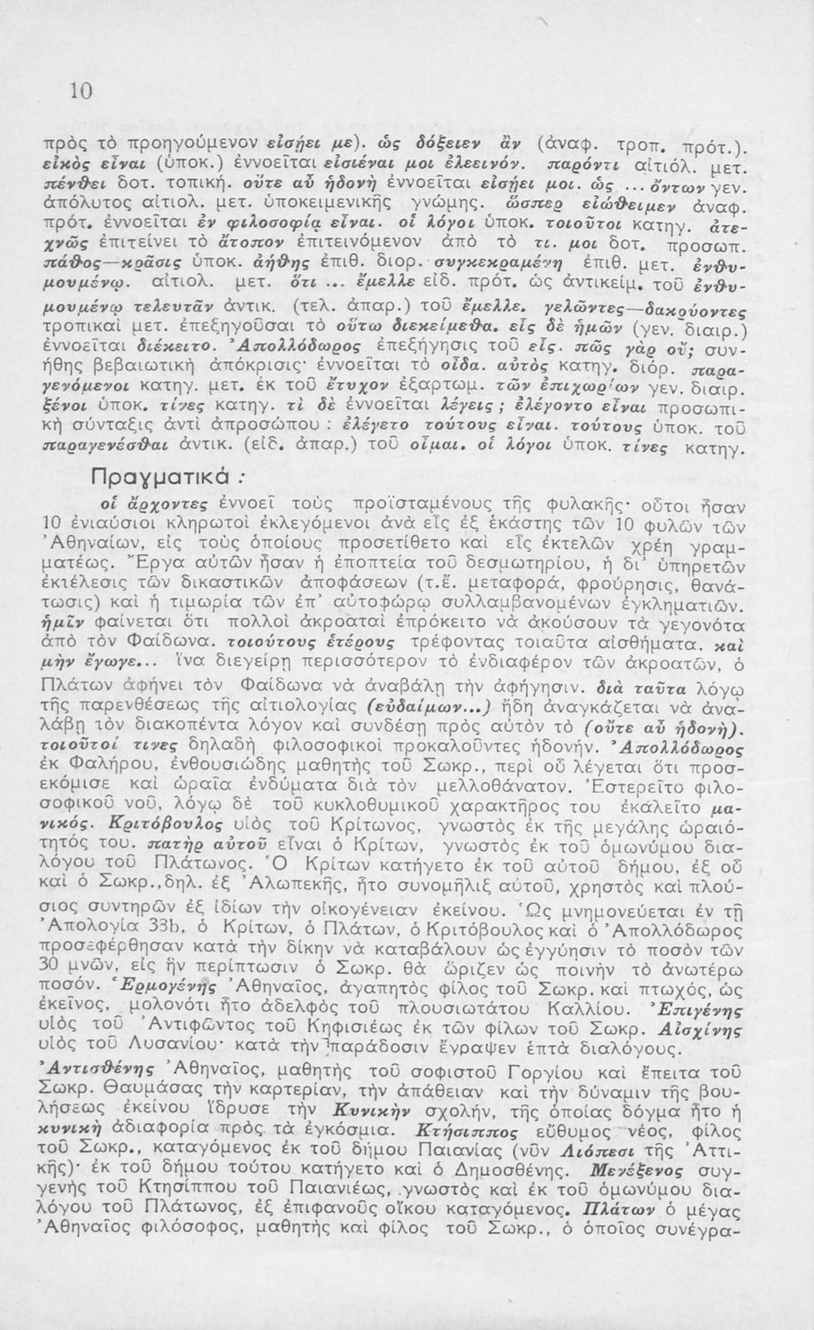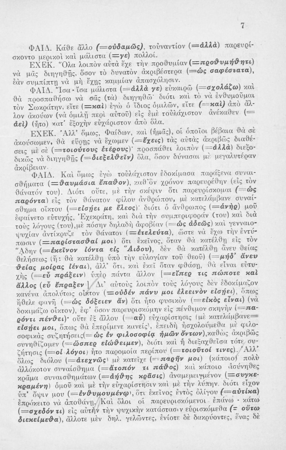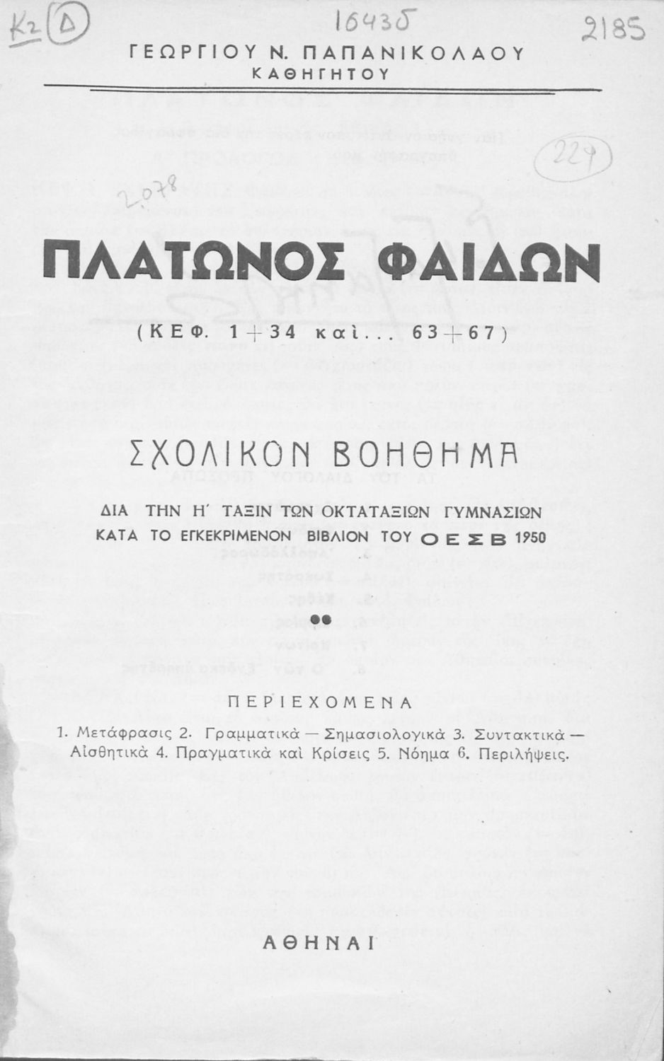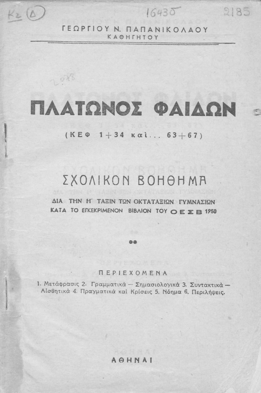 Μαθητικό βοήθημα Αρχαίων Ελληνικών για την Η' Γυμνασίου που περιλαμβάνει εισαγωγή και μετάφραση του Φαίδωνα του Πλάτωνα καθώς και ερμηνευτικά, γραμματικά και πραγματολογικά σχόλια.