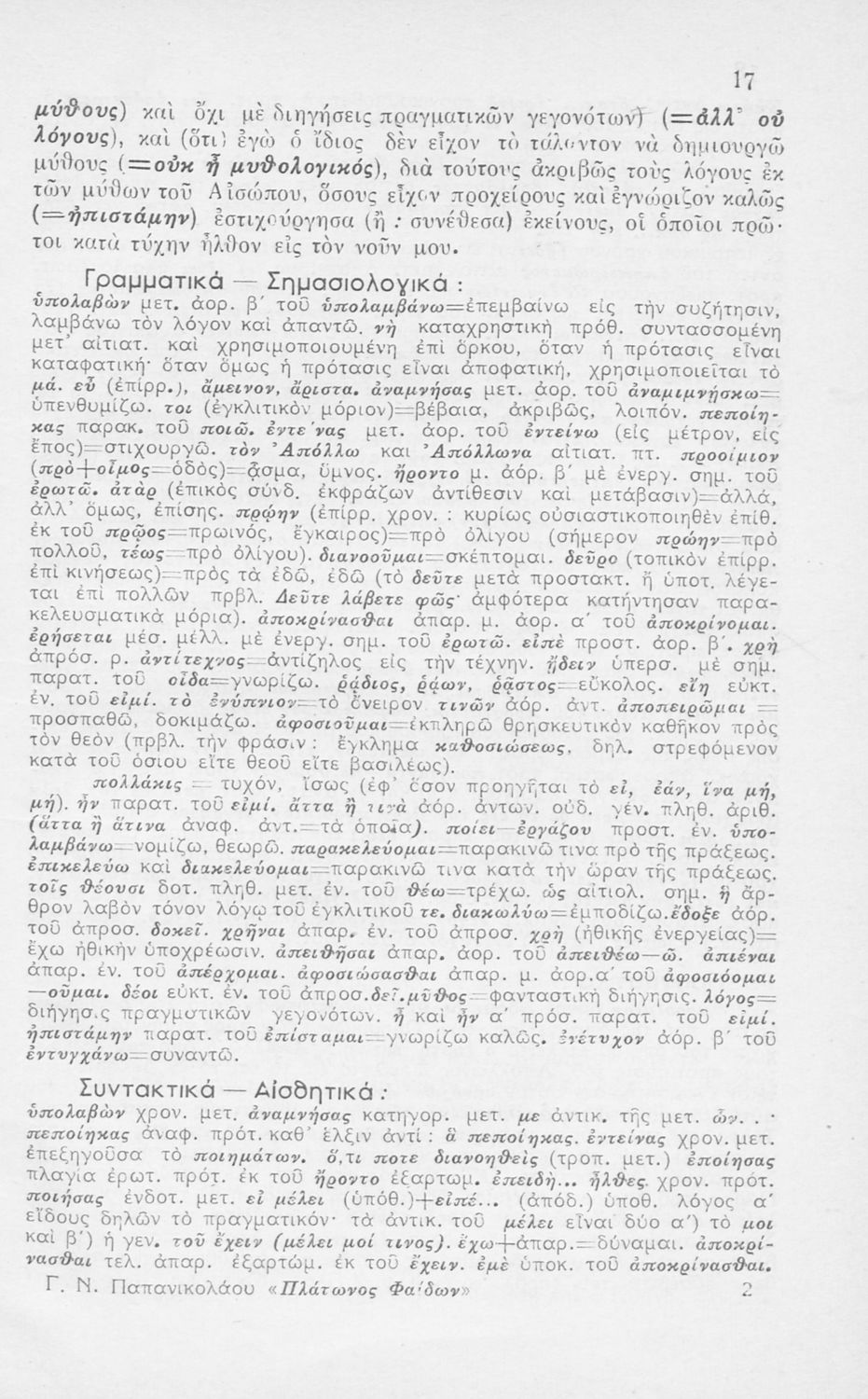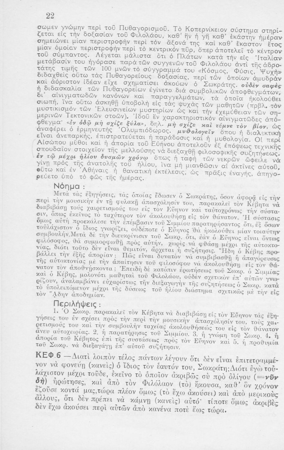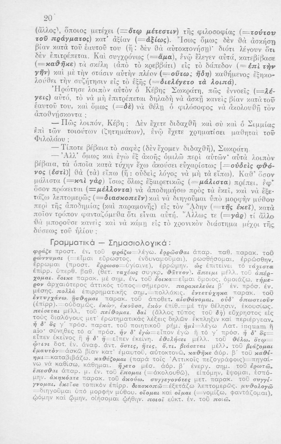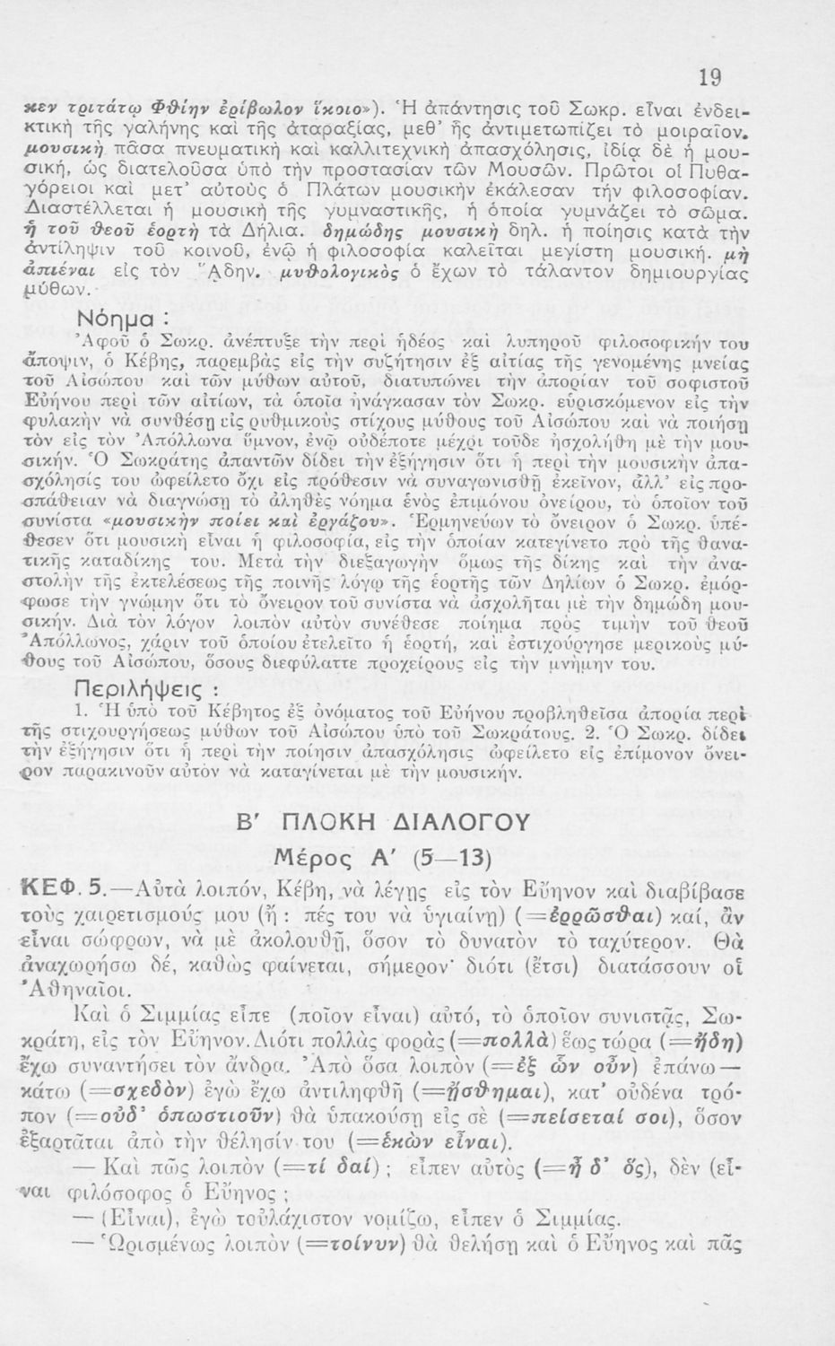 Μαθητικό βοήθημα Αρχαίων Ελληνικών για την Η' Γυμνασίου που περιλαμβάνει εισαγωγή και μετάφραση του Φαίδωνα του Πλάτωνα καθώς και ερμηνευτικά, γραμματικά και πραγματολογικά σχόλια.