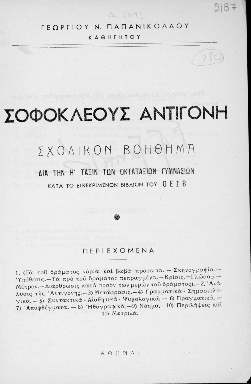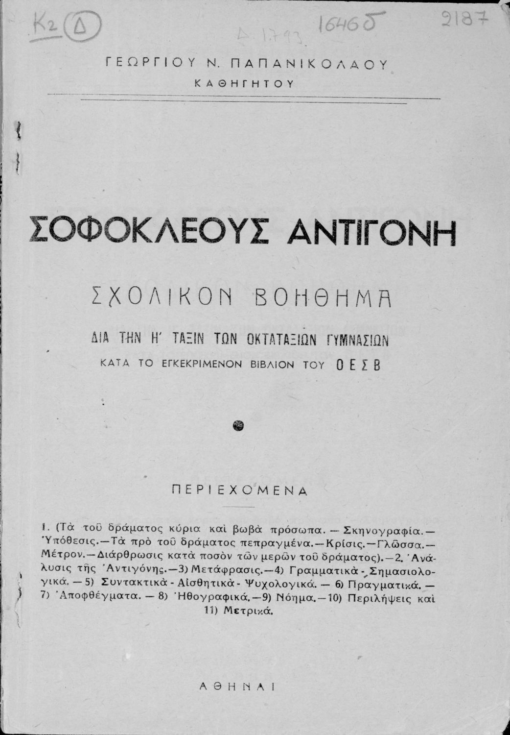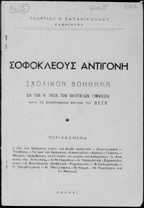Σοφοκλέους Αντιγόνη. Σχολικόν βοήθημα διά την Η΄ τάξιν των Οκταταξίων Γυμνασίων κατά το εγκεκριμένον βιβλίον του Οργανισμού Εκδόσεως Σχολικών Βιβλίων