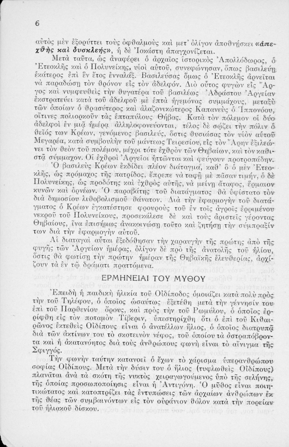Σχολικό εγχειρίδιο Αρχαίων Ελληνικών ΣΤ΄ Γυμνασίου που περιέχει την Αντιγόνη του Σοφοκλή, ερμηνευτικά και πραγματολογικά σχόλια και λεξιλογικές παρατηρήσεις.
