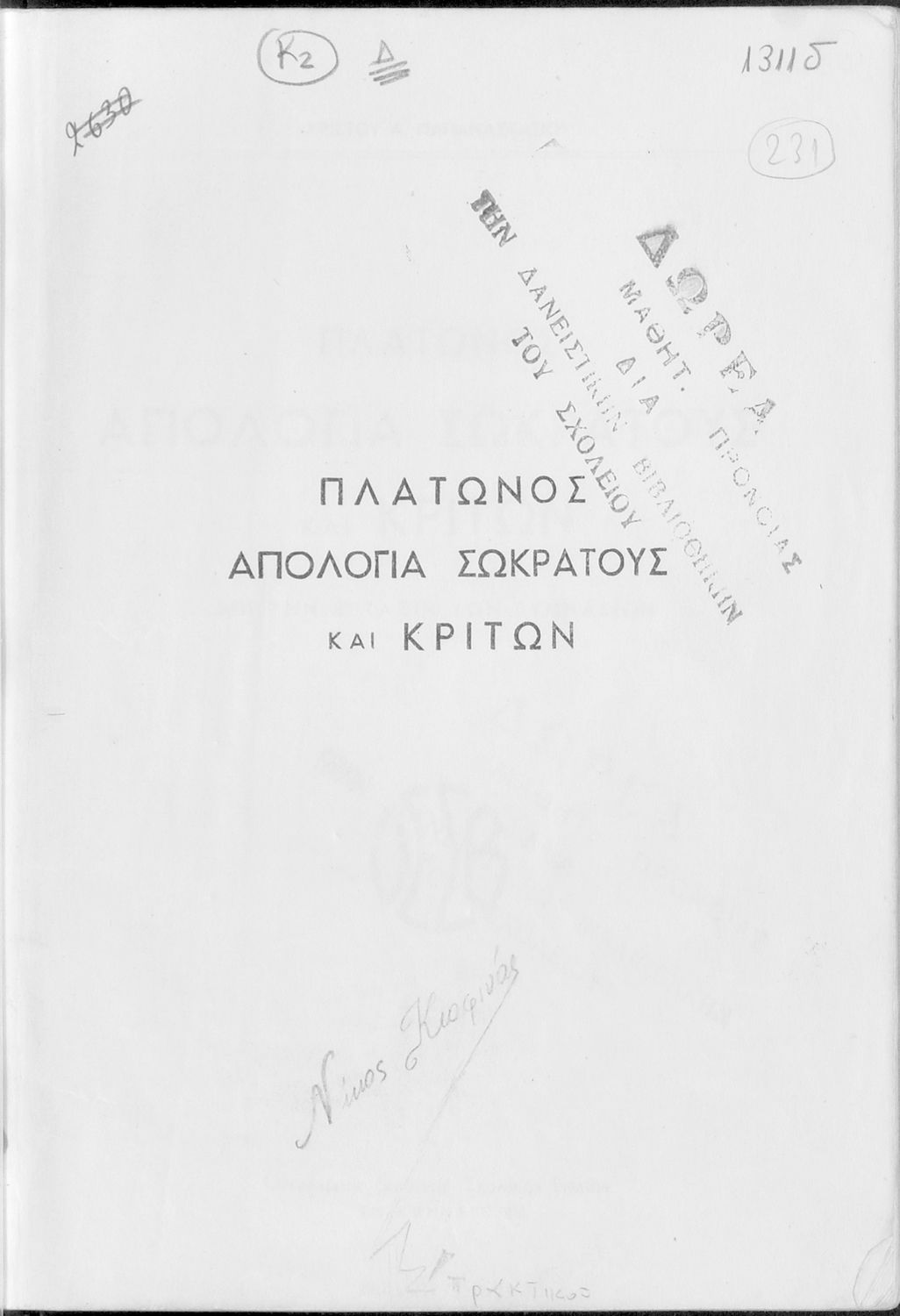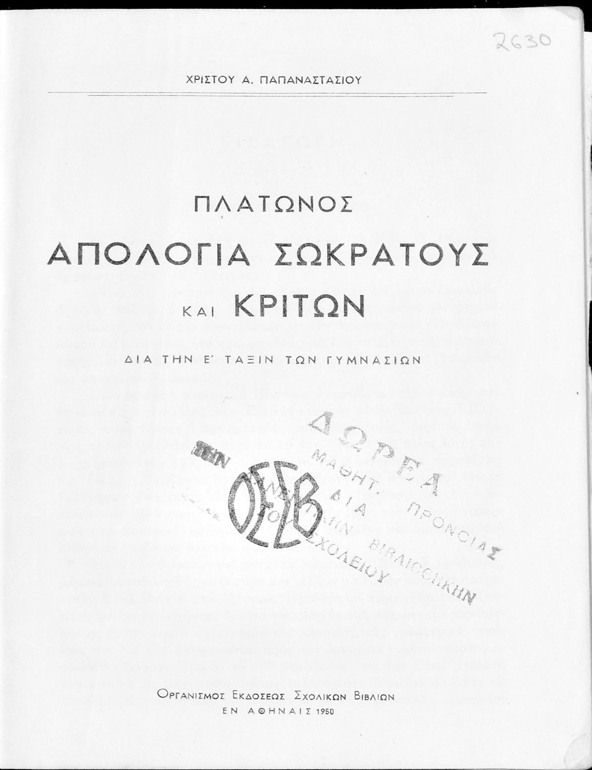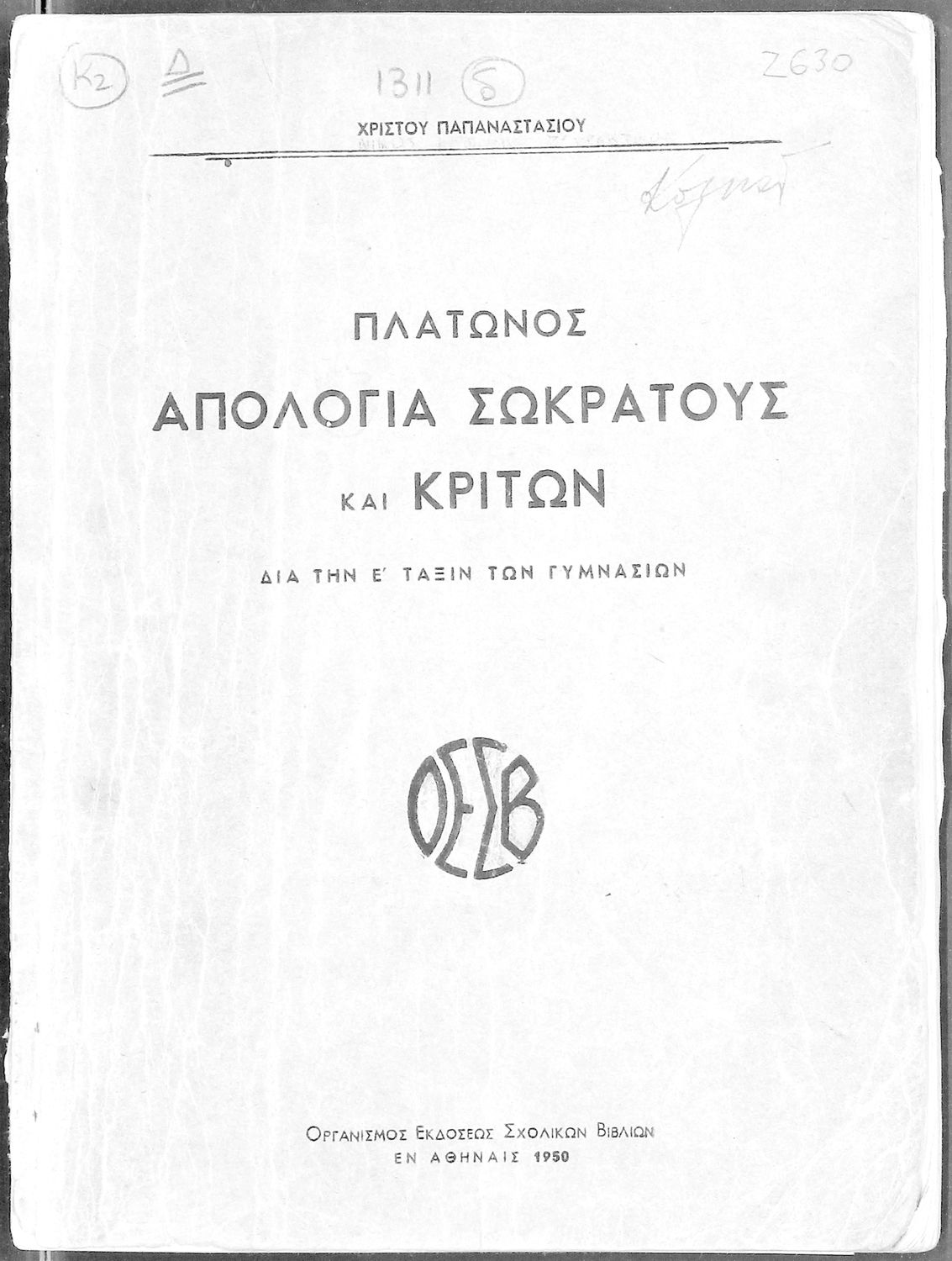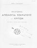 Κωδικός αναγνώρισης: 05-00231 Τίτλος: Πλάτωνος Απολογία Σωκράτους Κρίτων δια την Ε΄ τάξιν των Γυμνασίων Συγγραφέας: Πλάτων, Χρίστος Α. Παπαναστασίου (σχόλια) Μέγεθος και υπόστρωμα: Σχολικό εγχειρίδιο, 96 σελίδες. Σκίτσο (ασπρόμαυρο). |