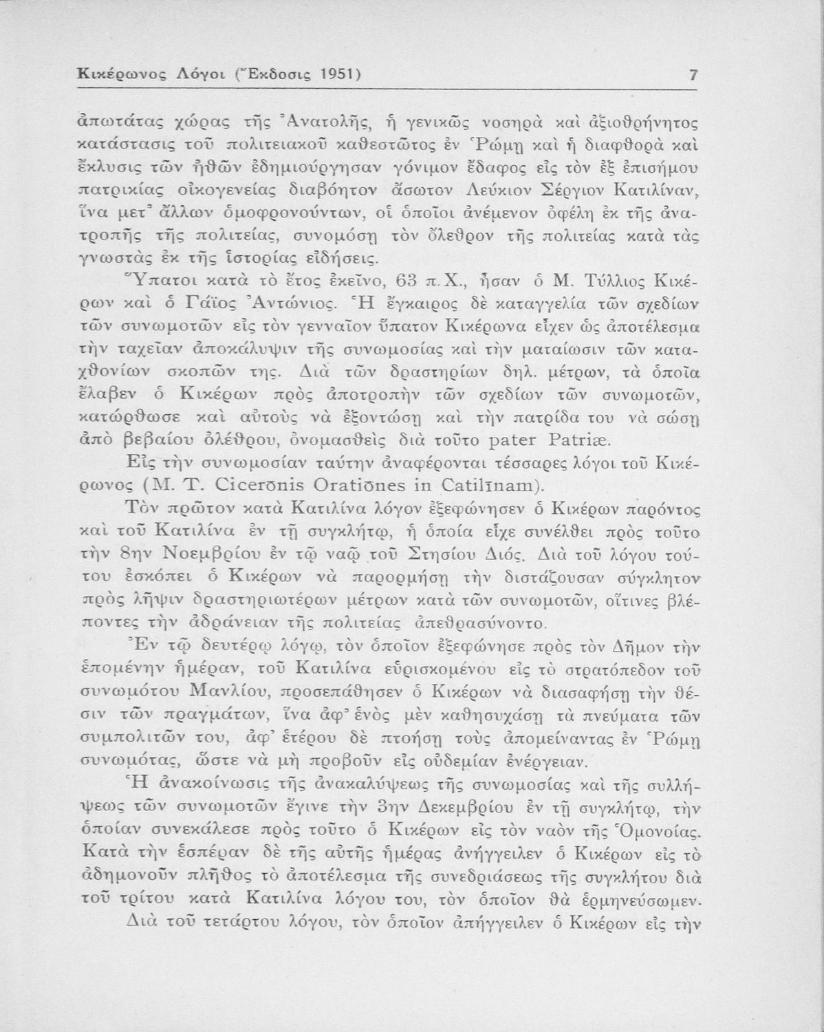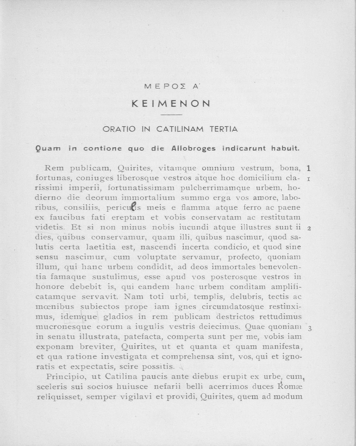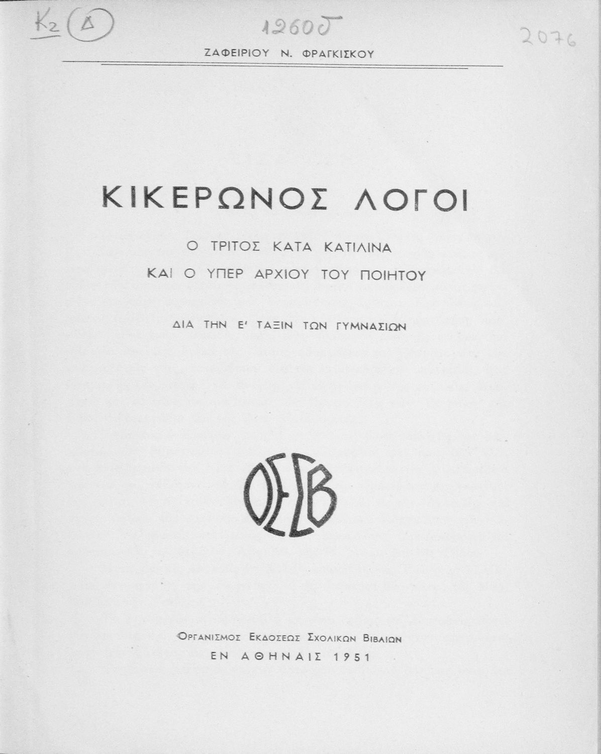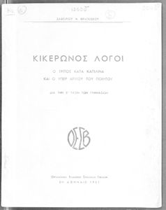 Σχολικό εγχειρίδιο Λατινικών για την Ε΄ Γυμνασίου που περιέχει βιογραφικό σημείωμα του Κικέρωνα, εισαγωγικά σχόλια, κείμενο και ερμηνευτικές σημειώσεις.