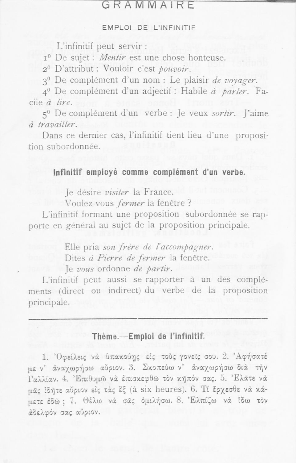 Βαθμίδα εκπαίδευσης: Δευτεροβάθμια Τάξη: Ε' Γυμνασίου Μάθημα: Γαλλικά Γλώσσα: Καθαρεύουσα Παρουσίαση περιεχομένου: Σχολικό εγχειρίδιο Γαλλικών για την Ε΄ Γυμνασίου που περιλαμβάνει πεζά, ποιήματα, αποσπάσματα από θεατρικά έργα, βιογραφικά σημειώματα των συyγραφέων, γραμματικές ασκήσεις, επεξηγηματικές σημειώσεις και λεξιλόγιο. |