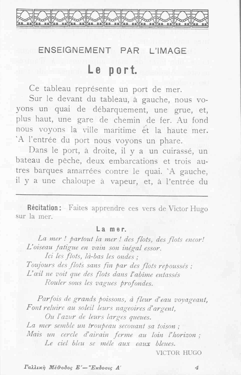 LDR 01440 2200205 4500 035 ## _a05-00233 040 ## _aΕργαστήρι Ιστορίας Ν.Ε. Εκπαίδευσης, Πανεπιστήμιο Ιωαννίνων 041 ## _ael 100 ## _aΘεοδ. Γ. Κύπριος 110 ## _a233 245 0# _aΓαλλική μέθοδος. Εγκεκριμένη υπό του Υπουργείου της Παιδείας δια την Ε΄ τάξιν των Εξαταξίων Γυμνασίων και τας αντιστοίχους τάξεις των λοιπών σχολείων της Μέσης Εκπαιδεύσεως 250 ## _a1η Έκδοση 260 ## _aΑθήνα _bΙωάννης Δ. Κολλάρος και ΣΙΑ _c1930 300 ## _a176 _bΕικόνες (ασπρόμαυρες), σκίτσα (ασπρόμαυρα) 520 ## _aΣχολικό εγχειρίδιο Γαλλικών για την Ε΄ Γυμνασίου που περιλαμβάνει πεζά, ποιήματα, αποσπάσματα από θεατρικά έργα, βιογραφικά σημειώματα των συyγραφέων, γραμματικές ασκήσεις, επεξηγηματικές σημειώσεις και λεξιλόγιο. 521 ## _aΕ' Γυμνασίου 522 ## _aΕλλάδα 546 ## _aΚαθαρεύουσα 563 ## _aΜαλακό Εξώφυλλο 650 #4 _aHugo _aLa Fontaine _aLamartine _aVoltaire