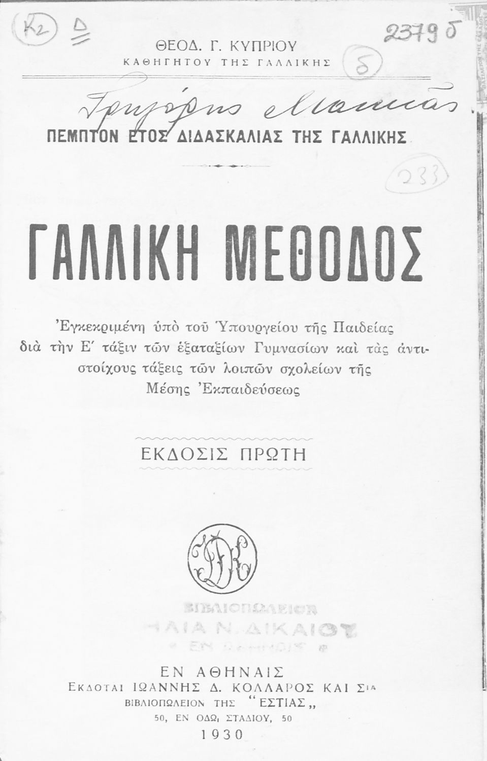 Κωδικός αναγνώρισης: 05-00233 Τίτλος: Γαλλική μέθοδος. Εγκεκριμένη υπό του Υπουργείου της Παιδείας δια την Ε΄ τάξιν των Εξαταξίων Γυμνασίων και τας αντιστοίχους τάξεις των λοιπών σχολείων της Μέσης Εκπαιδεύσεως Συγγραφέας: Θεοδ. Γ. Κύπριος Μέγεθος και υπόστρωμα: Σχολικό εγχειρίδιο, μαλακό εξώφυλλο, 176 σελίδες. Εικόνες (ασπρόμαυρες), σκίτσα (ασπρόμαυρα). |