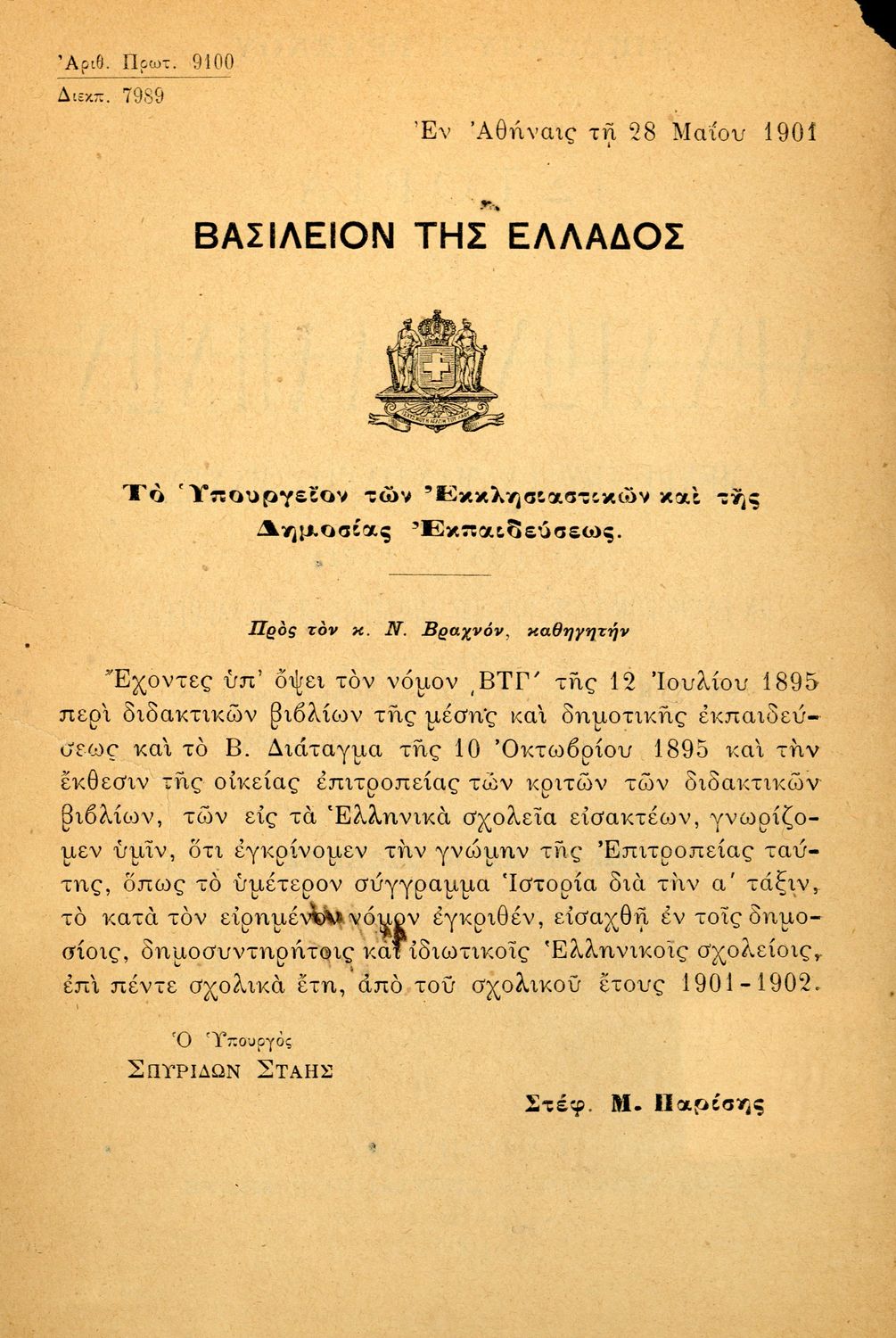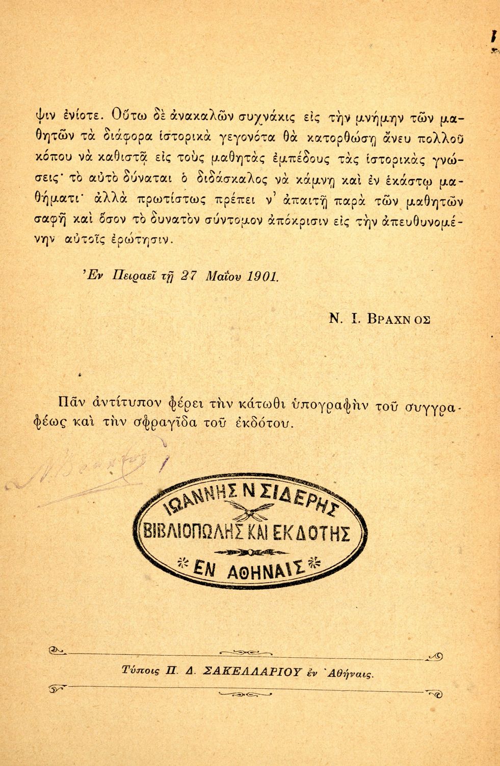 Εκδότης: Ιωάννης Ν. Σιδέρης Έτος έκδοσης: 1901 Τόπος έκδοσης: Αθήνα Υπουργική απόφαση / Σύμβαση: 9100/ 28-5-1901 Έτος έγκρισης: 1901 |