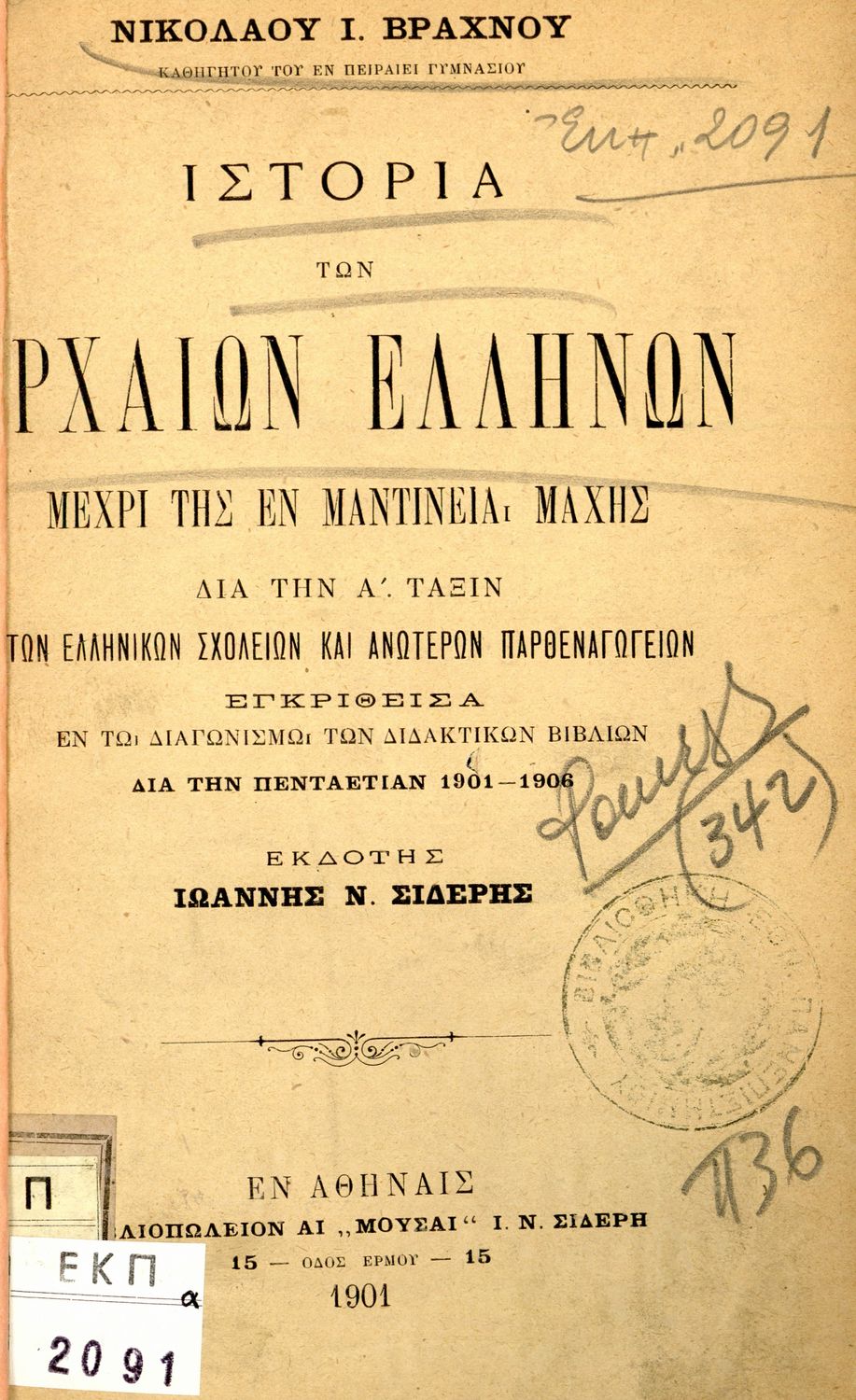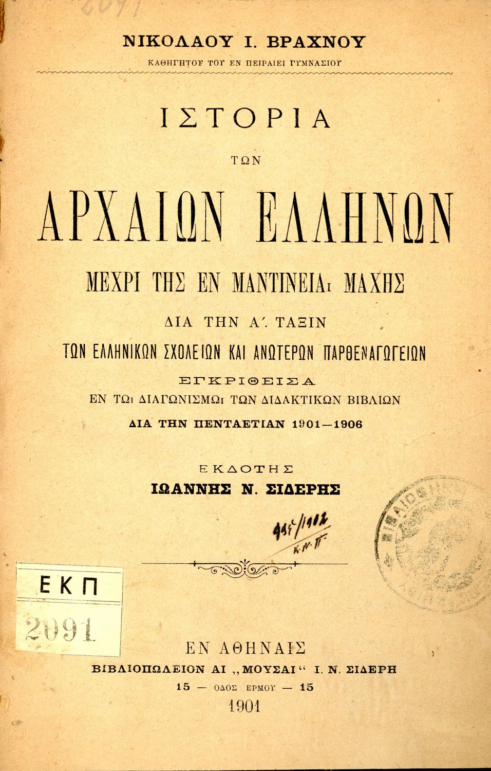 Κωδικός αναγνώρισης: 08-00005 Τίτλος: Ιστορία των αρχαίων Ελλήνων μέχρι της εν Μαντινεία μάχης διά την Α΄ τάξιν των Ελληνικών Σχολείων και Ανωτέρων Παρθεναγωγείων Συγγραφέας: Νικόλαος Ι. Βραχνός Μέγεθος και υπόστρωμα: Σχολικό εγχειρίδιο, σκληρό εξώφυλλο, 138 σελίδες. Σκίτσα (ασπρόμαυρα). |