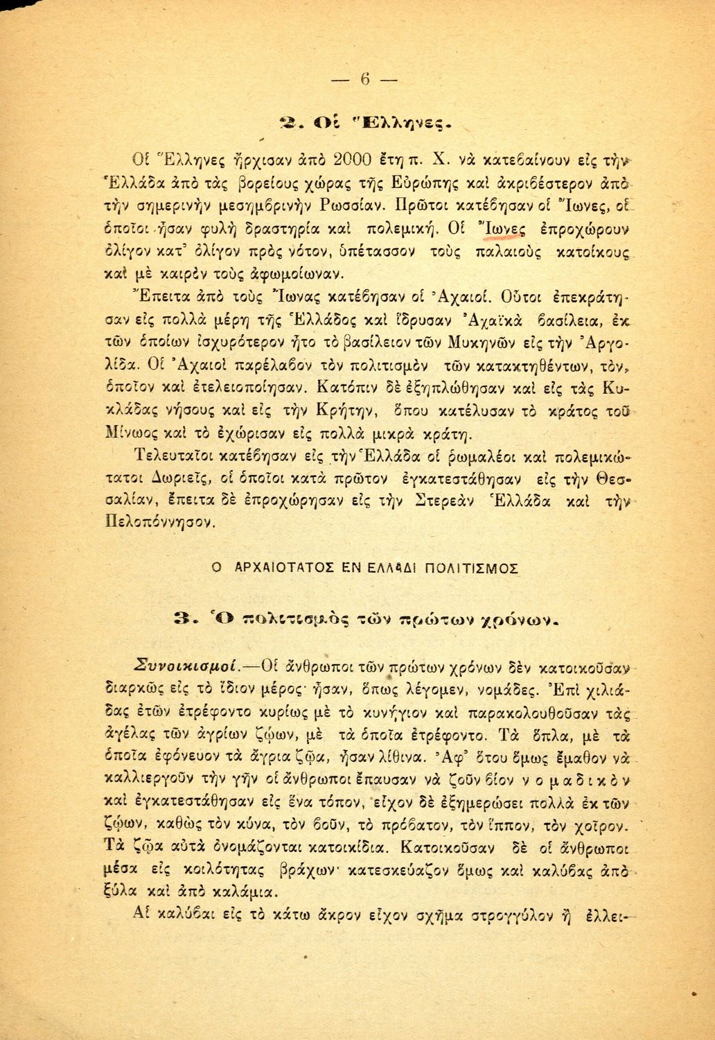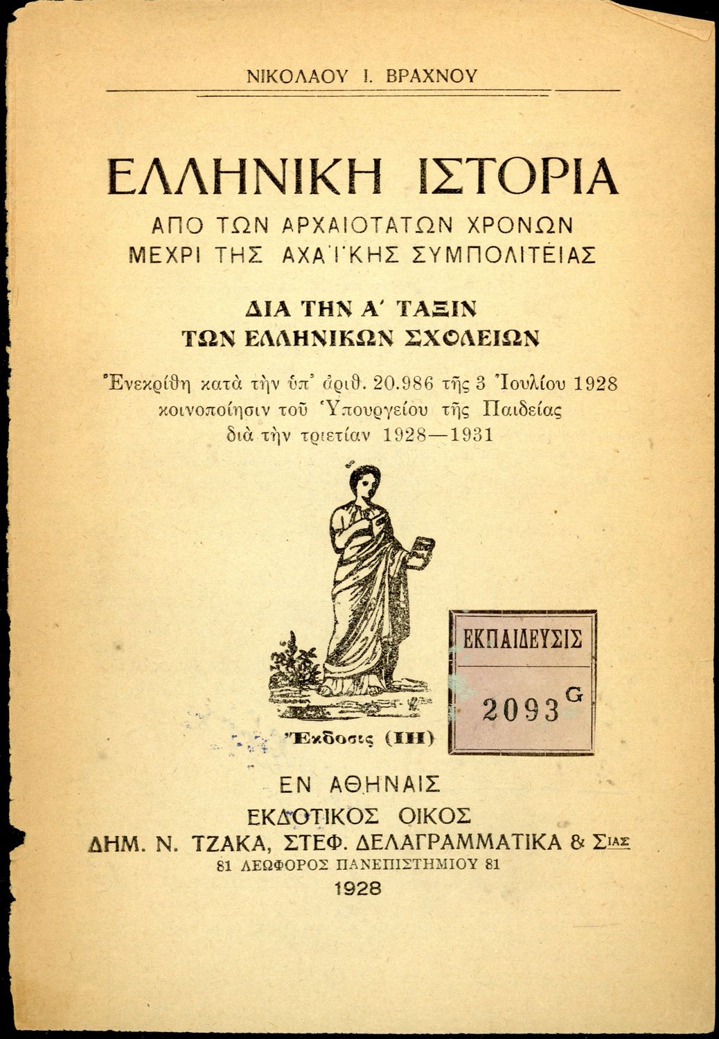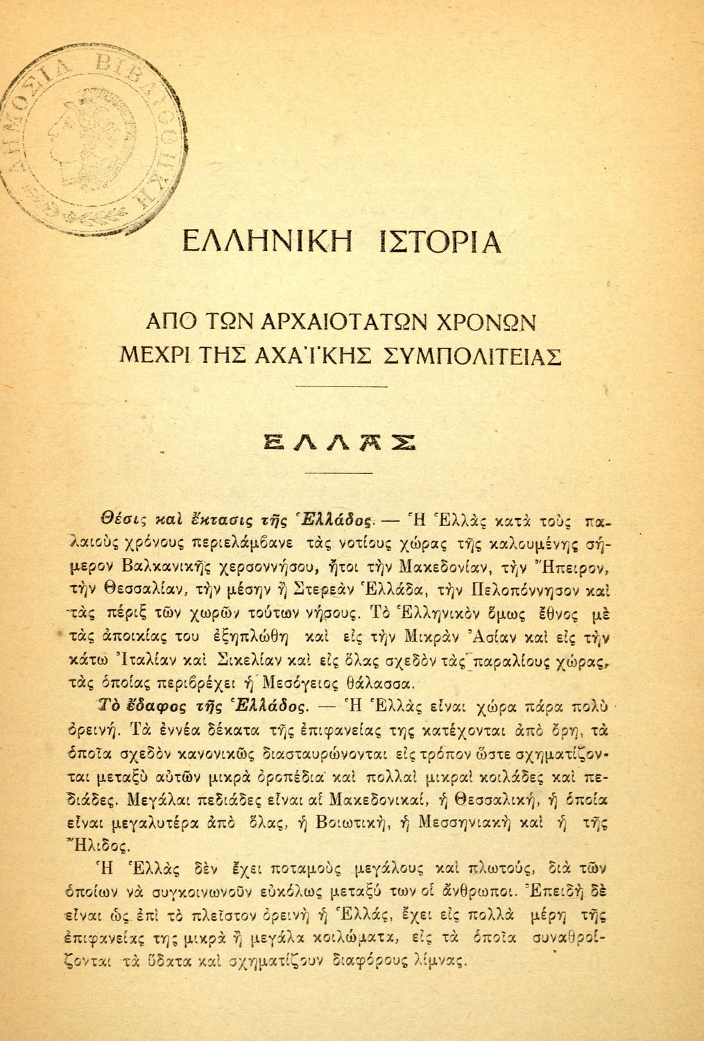 Βαθμίδα εκπαίδευσης: Δευτεροβάθμια Τάξη: Α' Ελληνικού Σχολείου Μάθημα: Ιστορία Γλώσσα: Καθαρεύουσα Παρουσίαση περιεχομένου: Σχολικό εγχειρίδιο Ιστορίας Α' Ελληνικού Σχολείου που καλύπτει την περίοδο από τους προϊστορικούς χρόνους ως τη συγκρότηση της Αχαϊκής Συμπολιτείας. |