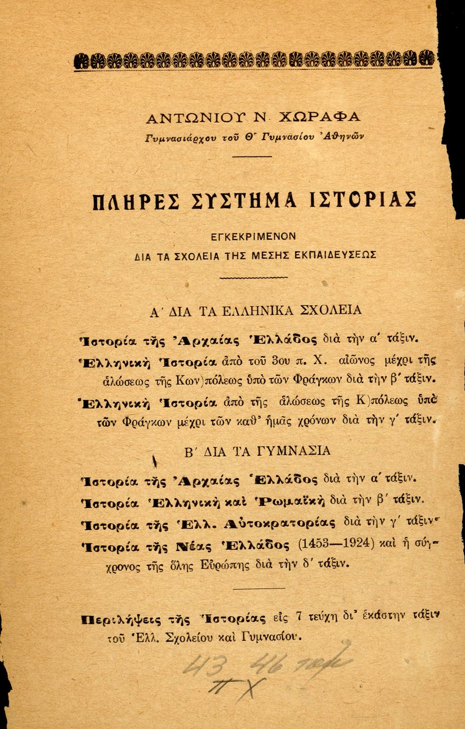 Κωδικός αναγνώρισης: 08-00013 Τίτλος: Ελληνική ιστορία από της αλώσεως της Κωνσταντινουπόλεως υπό των Φράγκων μέχρι των καθ' ημάς χρόνων μετά 23 εικόνων και χαρτών διά την τρίτην τάξιν των Ελληνικών Σχολείων και την αντίστοιχον των λοιπών σχολείων της Μέσης Εκπαιδεύσεως Συγγραφέας: Αντώνιος Ν. Χωραφάς Μέγεθος και υπόστρωμα: Σχολικό εγχειρίδιο, σκληρό εξώφυλλο, 184 σελίδες. Σκίτσα (ασπρόμαυρα), χάρτες (ασπρόμαυροι). |
