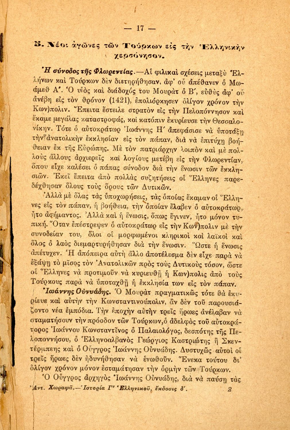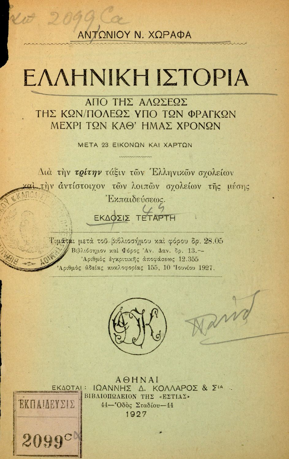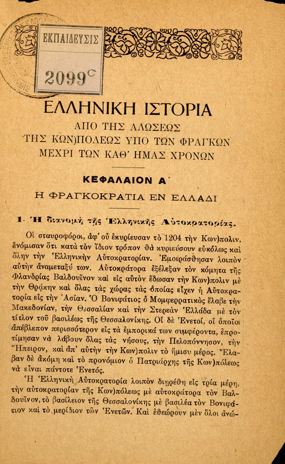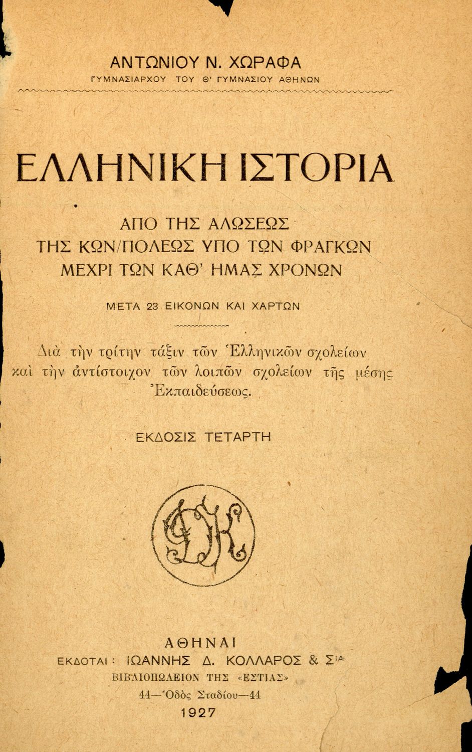 Τίτλος: Ελληνική ιστορία από της αλώσεως της Κωνσταντινουπόλεως υπό των Φράγκων μέχρι των καθ' ημάς χρόνων μετά 23 εικόνων και χαρτών διά την τρίτην τάξιν των Ελληνικών Σχολείων και την αντίστοιχον των λοιπών σχολείων της Μέσης Εκπαιδεύσεως