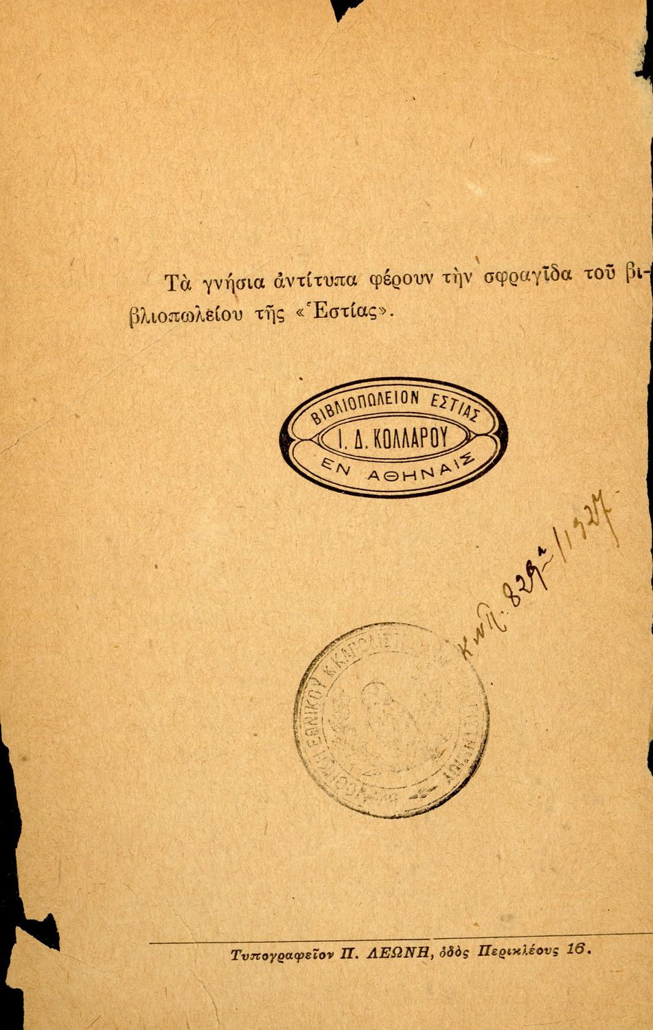 Εκδότης: Ιωάννης Δ. Κολλάρος, Βιβλιοπωλείο της "Εστίας"