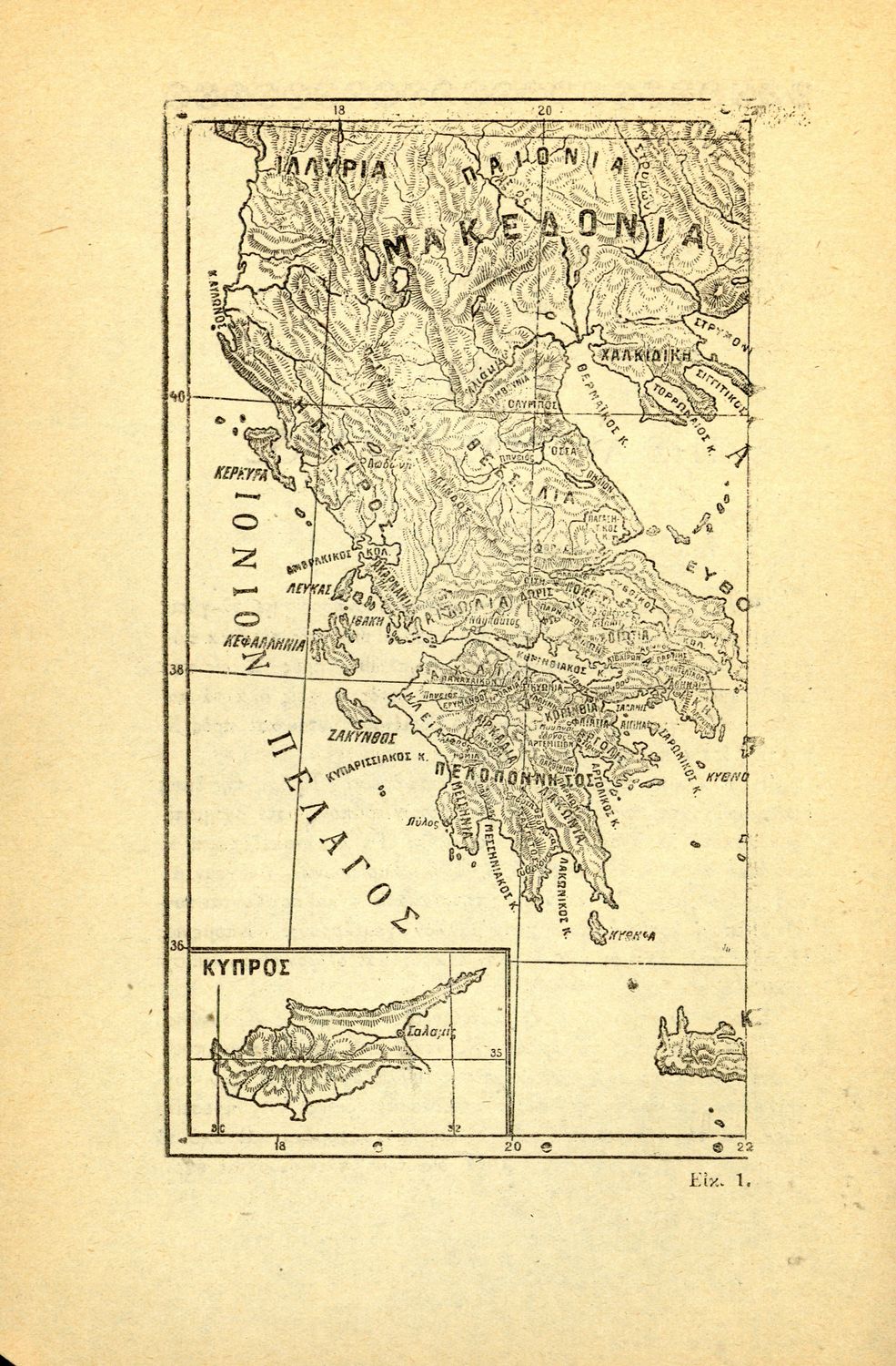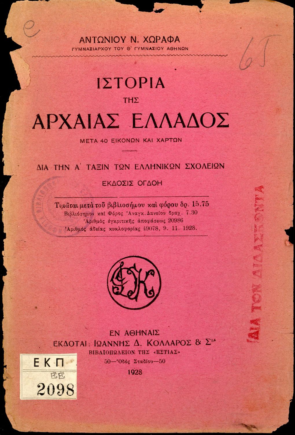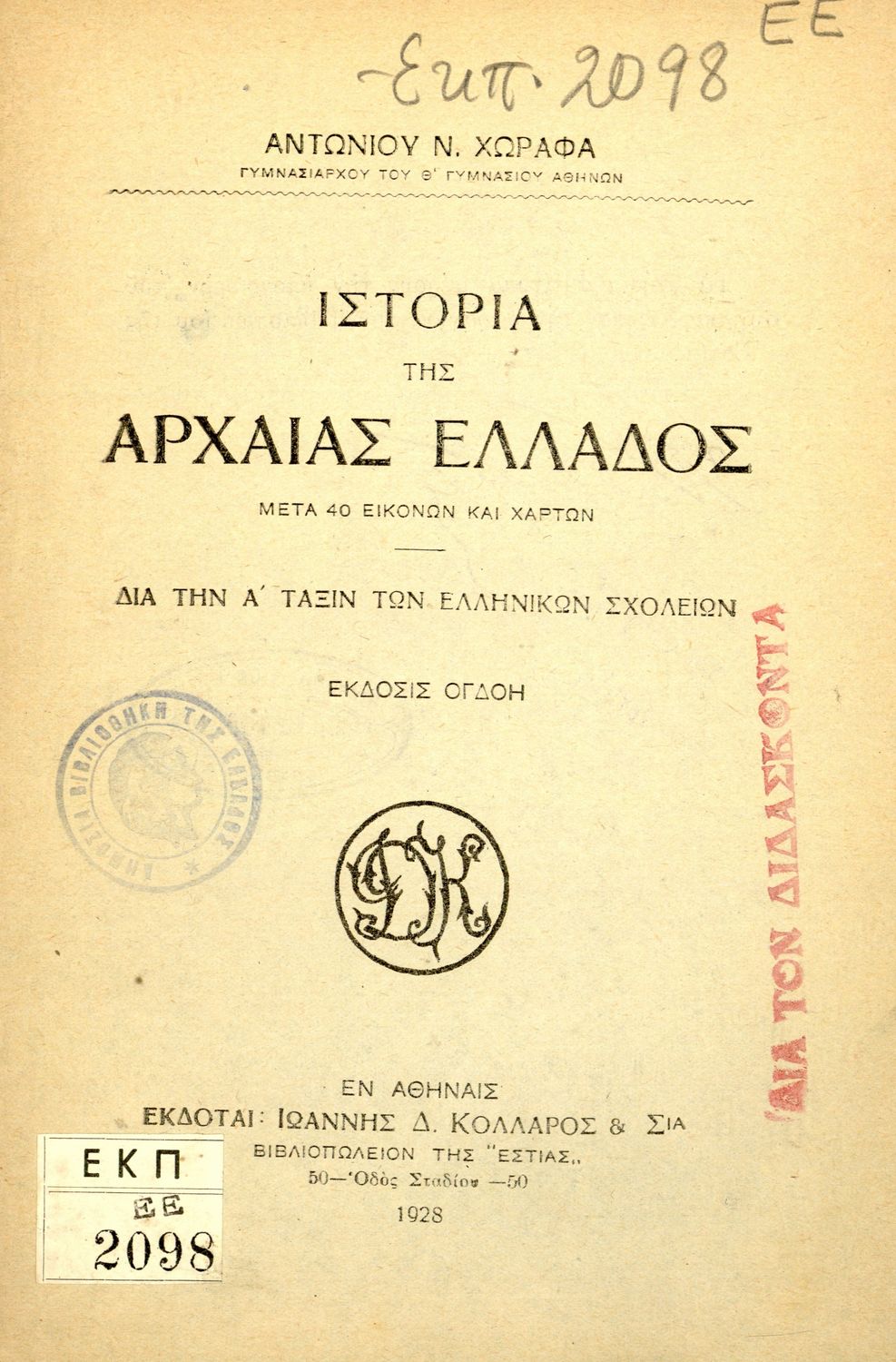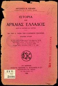 Κωδικός αναγνώρισης: 08-00014 Τίτλος: Ιστορία της αρχαίας Ελλάδος μετά 40 εικόνων και χαρτών διά την Α΄ τάξιν των Ελληνικών Σχολείων Συγγραφέας: Αντώνιος Ν. Χωραφάς Μέγεθος και υπόστρωμα: Σχολικό εγχειρίδιο, μαλακό εξώφυλλο, 138 σελίδες. Σκίτσα (ασπρόμαυρα), χάρτες (ασπρόμαυροι). |