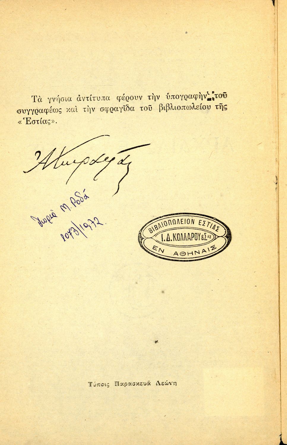 Εκδότης: Ιωάννης Δ. Κολλάρος, Βιβλιοπωλείο της "Εστίας" Έτος έκδοσης: 1928 Τόπος έκδοσης: Αθήνα Έκδοση: 8η Υπουργική απόφαση / Σύμβαση: 20986/ 9-11-1928 Έτος έγκρισης: 1928 |