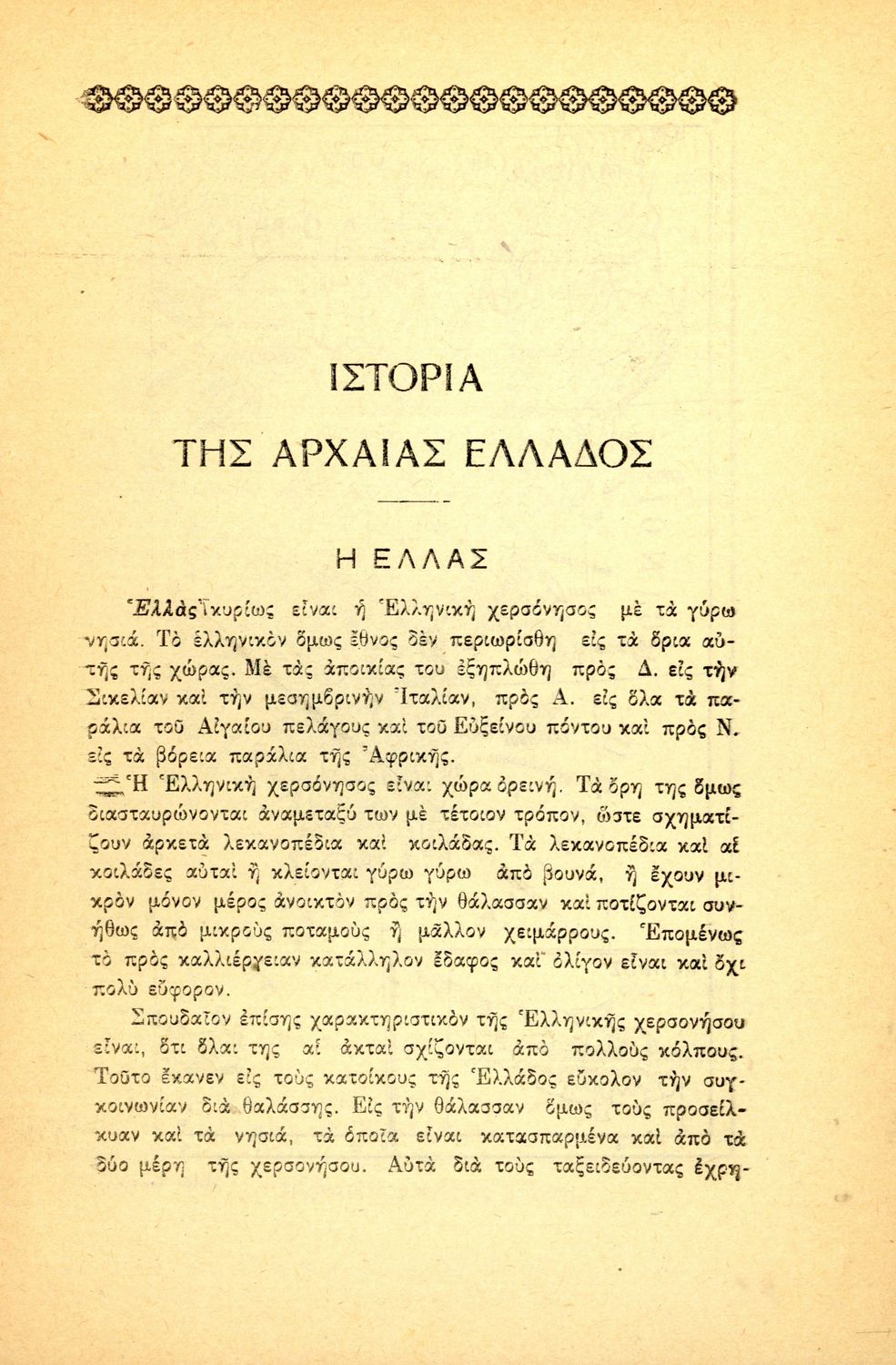 Βαθμίδα εκπαίδευσης: Δευτεροβάθμια Τάξη: Α' Ελληνικού Σχολείου Μάθημα: Ιστορία Γλώσσα: Καθαρεύουσα Παρουσίαση περιεχομένου: Σχολικό εγχειρίδιο Ιστορίας Α' Ελληνικού Σχολείου που καλύπτει το διάστημα από τους προϊστορικούς χρόνους ως τη Μακεδονική Ηγεμονία. |