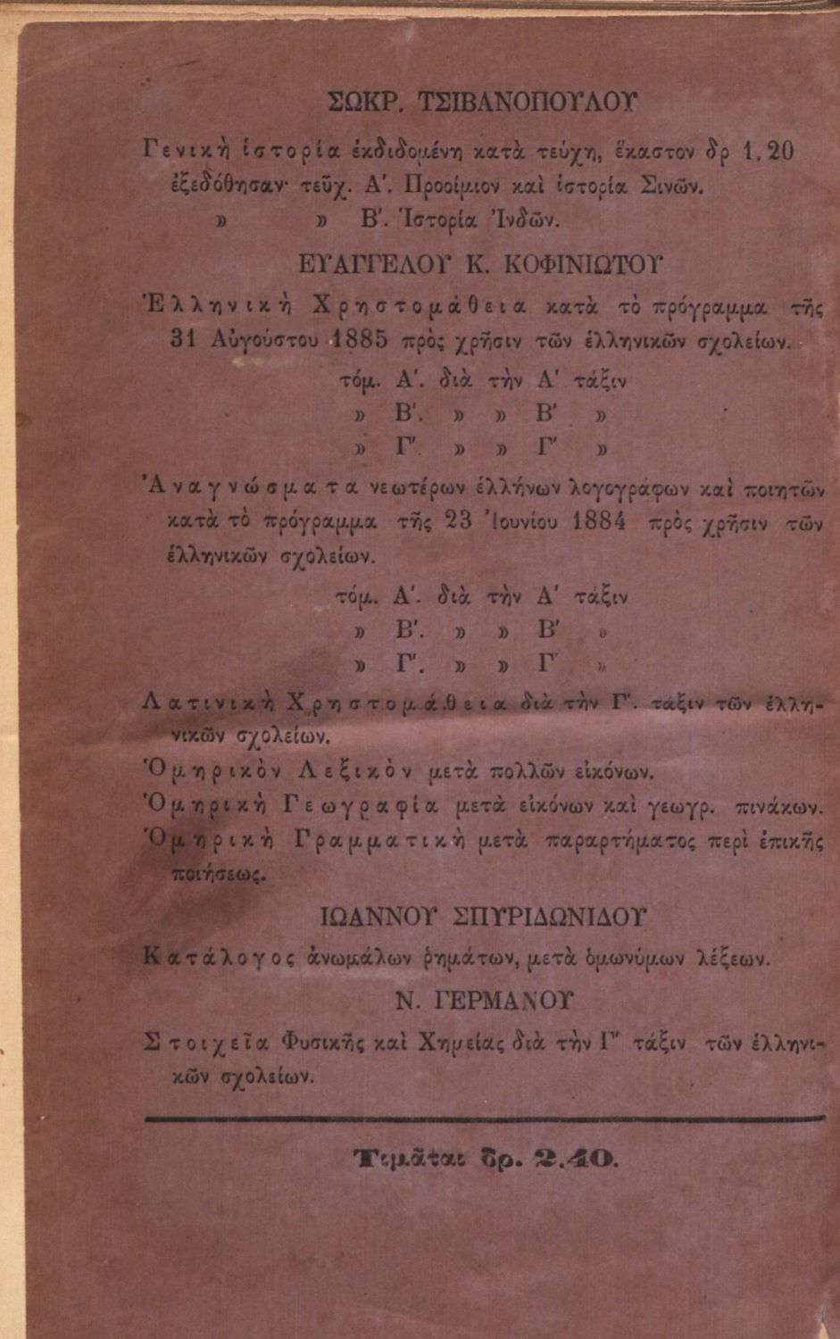 Τίτλος: Ιστορία της Ελλάδος από της κτίσεως της Κωνσταντινουπόλεως μέχρι της ιδρύσεως του βασιλείου της Ελλάδος μετά εικόνων προς χρήσιν της Γ΄ τάξεως των Ελληνικών Σχολείων