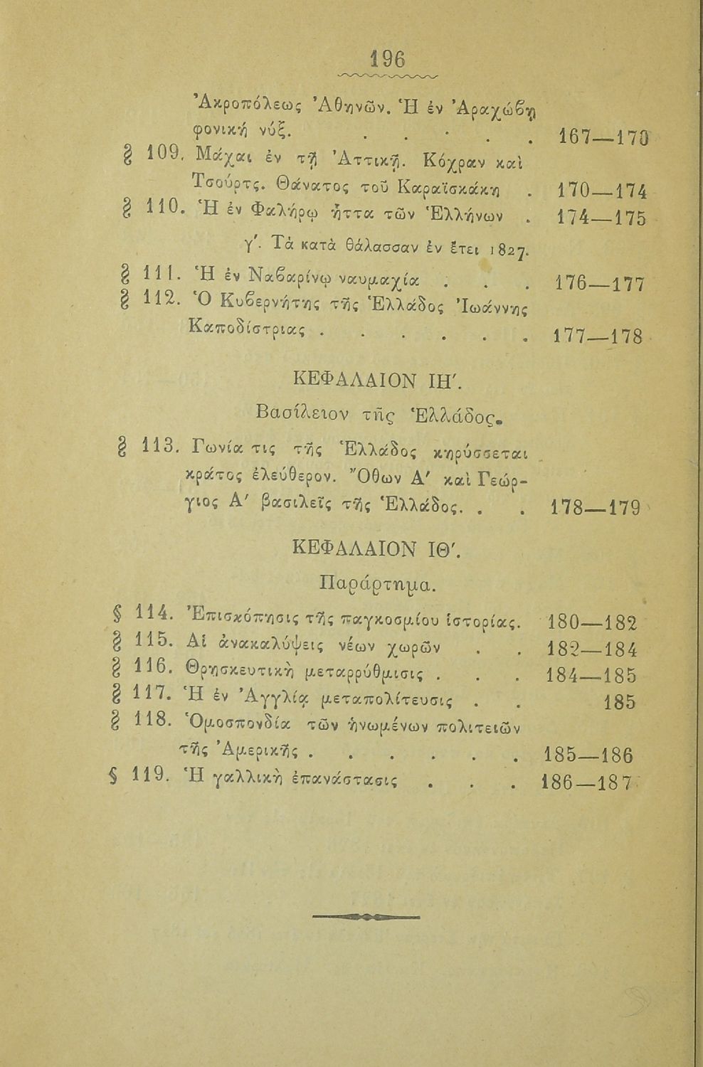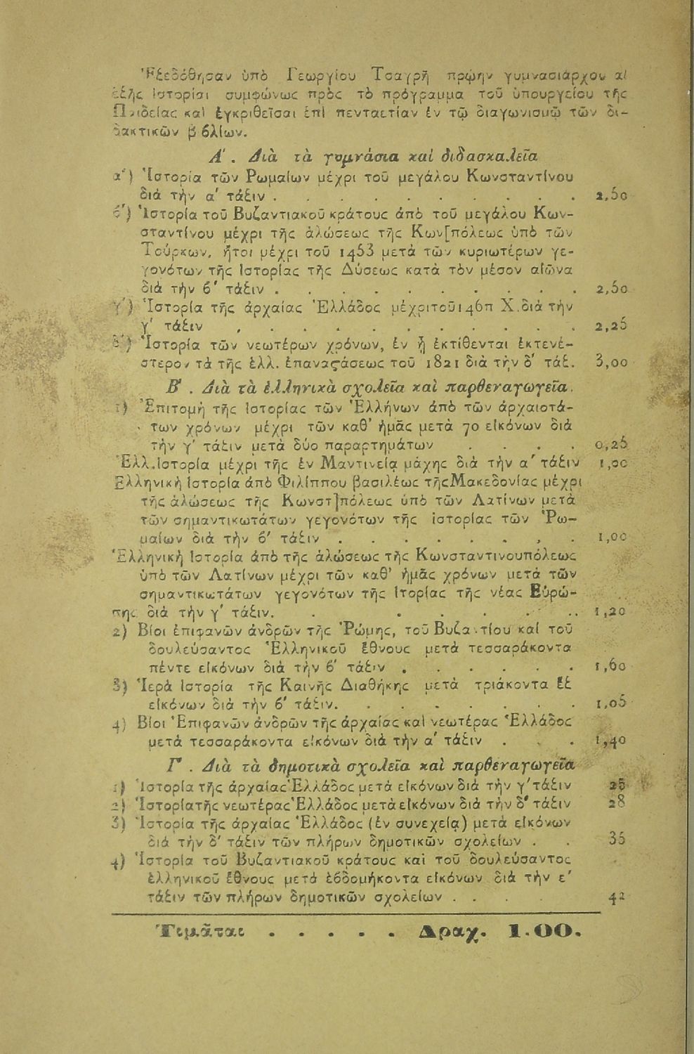 Σχολικό εγχειρίδιο Ιστορίας. Η΄ Αρσακείου Γυμνασίου και Παρθεναγωγείου που καλύπτει την περίοδο από την άλωση της Κωνσταντινούπολης ως την Ελληνική Επανάσταση και την ίδρυση του Βασιλείου της Ελλάδας υπό τον Όθωνα. Περιέχει και παράρτημα που εξετάζει τη θρησκευτική μεταρρύθμιση, τη Γαλλική Επανάσταση και τις Ηνωμένες Πολιτείες της Αμερικής.