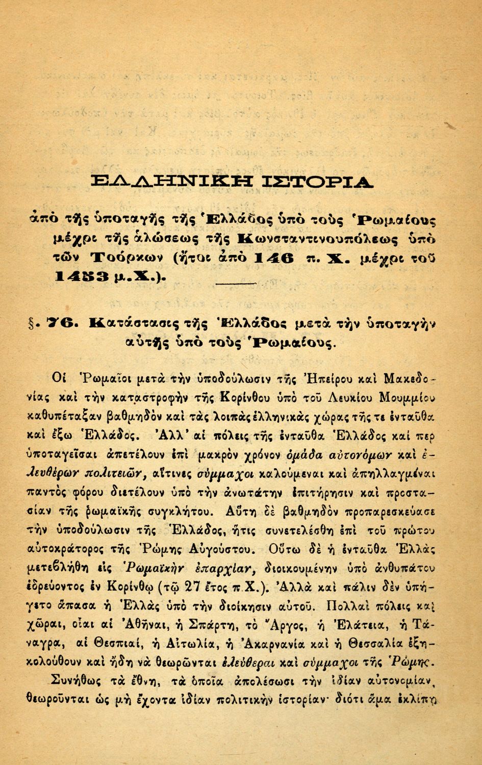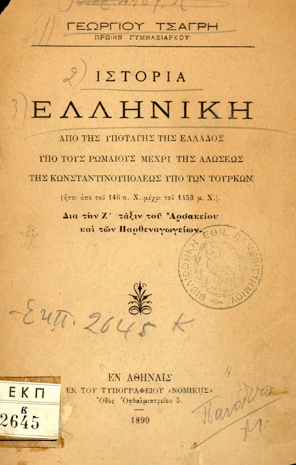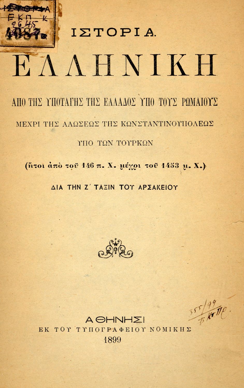 Τίτλος: Ιστορία ελληνική από της υποταγής της Ελλάδος υπό τους Ρωμαίους μέχρι της αλώσεως της Κωνσταντινουπόλεως υπό των Τούρκων (ήτοι από του 146 π. Χ. μέχρι του 1453 μ. Χ.) διά την Ζ΄ τάξιν του Αρσακείου και των Παρθεναγωγείων.