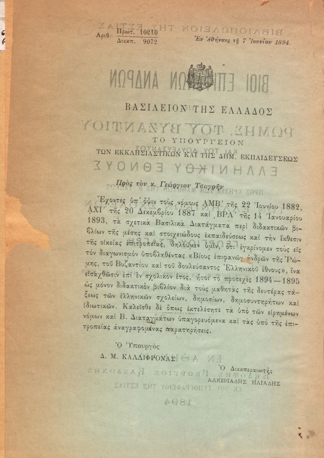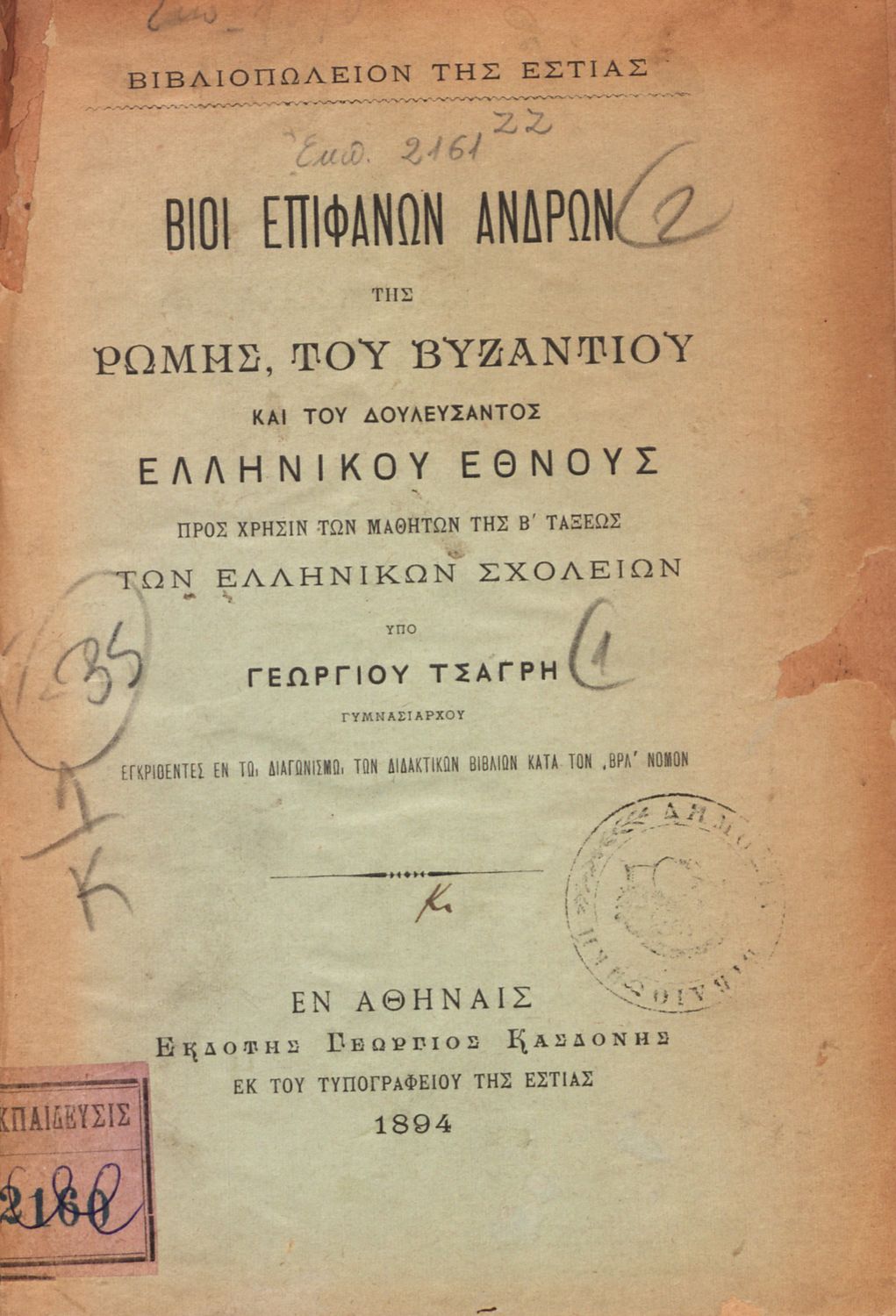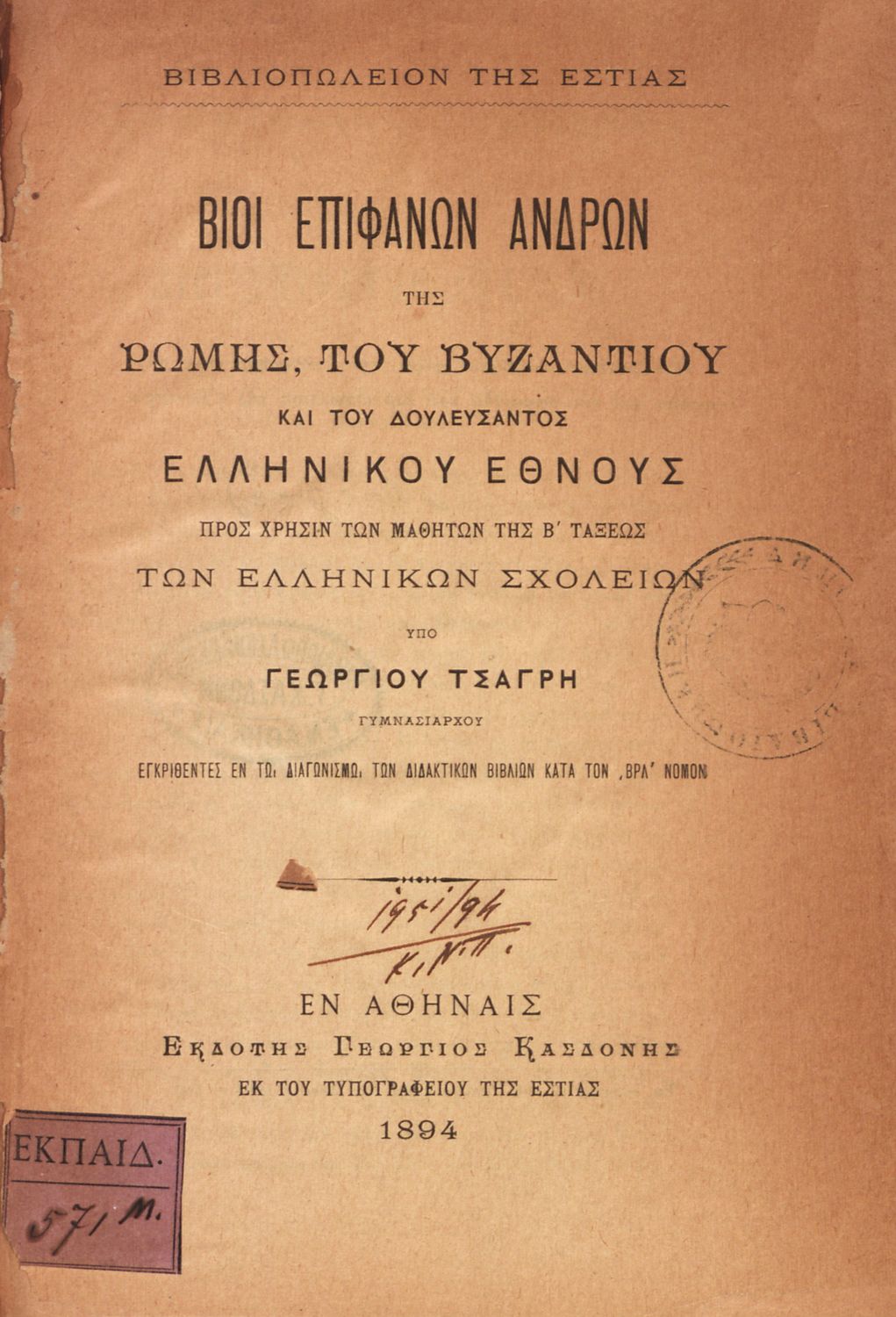 Κωδικός αναγνώρισης: 08-00038 Τίτλος: Βίοι επιφανών ανδρών της Ρώμης, του Βυζαντίου και του δουλεύσαντος ελληνικού έθνους προς χρήσιν των μαθητών της Β΄ τάξεως των Ελληνικών Σχολείων Συγγραφέας: Γεώργιος Τσαγρής Μέγεθος και υπόστρωμα: Σχολικό εγχειρίδιο, σκληρό εξώφυλλο, 140 σελίδες. |
