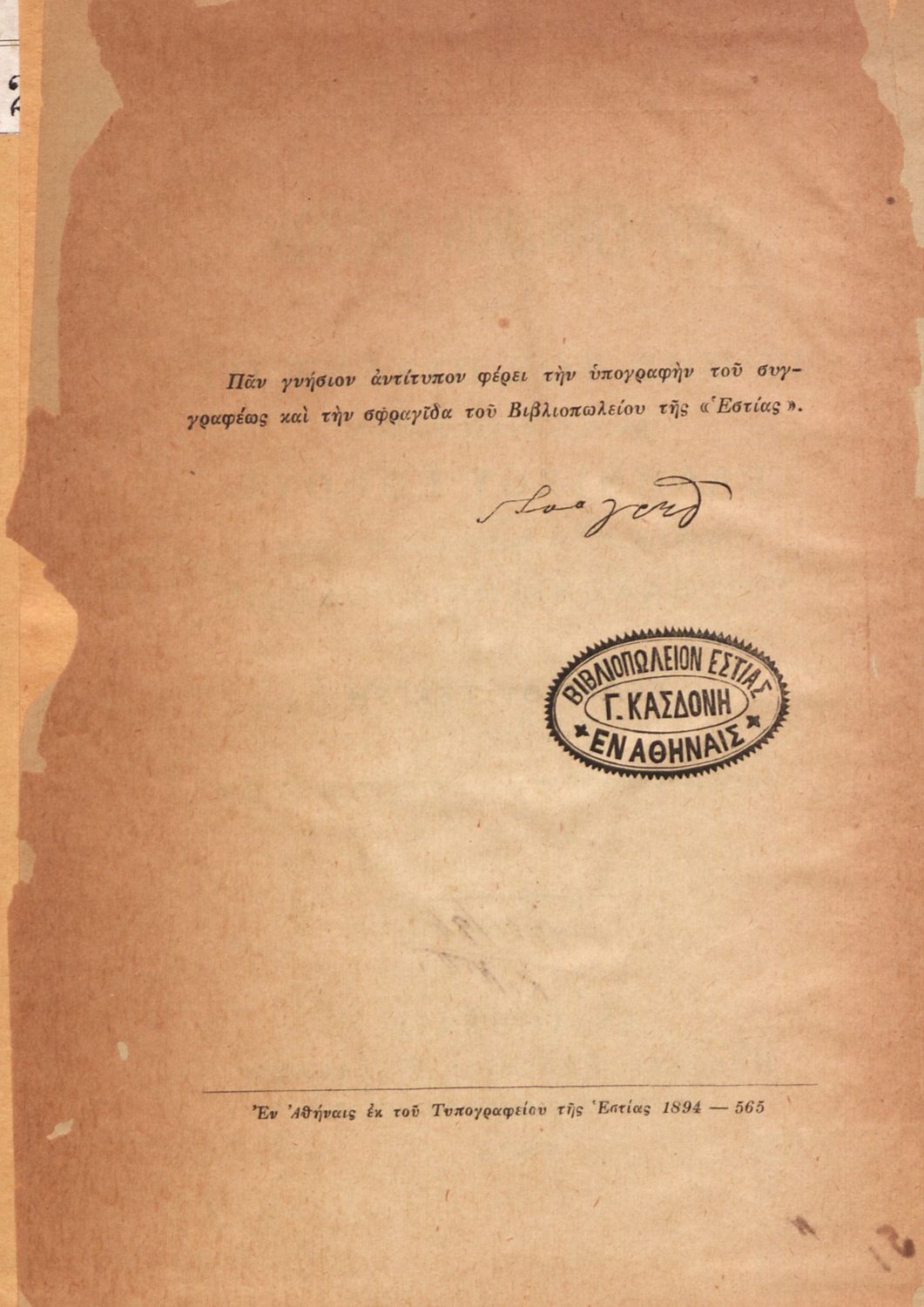 Εκδότης: Γεώργιος Κασδόνης Έτος έκδοσης: 1894 Τόπος έκδοσης: Αθήνα Υπουργική απόφαση / Σύμβαση: 10210/ 7-6-1894 Έτος έγκρισης: 1894 |