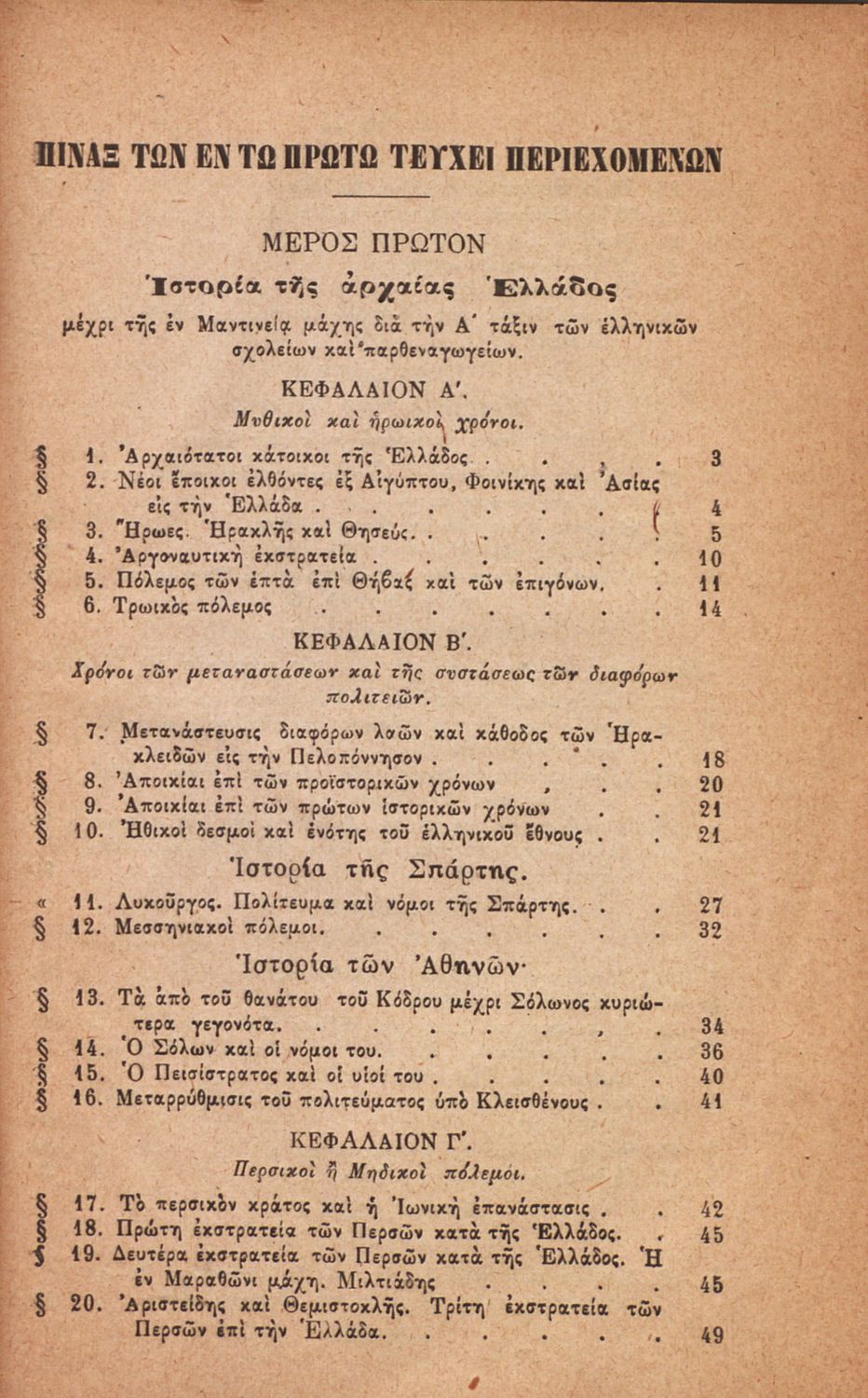 Σχολικό εγχειρίδιο Ιστορίας Α΄ Ελληνικού και Παρθεναγωγείου που καλύπτει την περίοδο από τους μυθικούς και ηρωικούς χρόνους μέχρι την μάχη της Μαντινείας και τον θάνατο του Επαμεινώνδα.