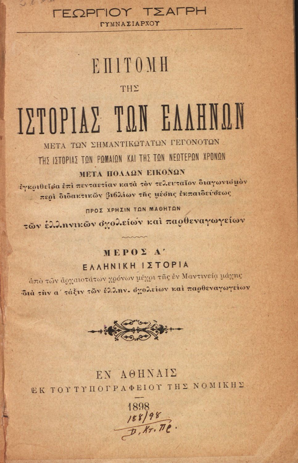 Τίτλος: Επιτομή της ιστορίας των Ελλήνων μετά των σημαντικοτάτων γεγονότων της ιστορίας των Ρωμαίων και των νεωτέρων χρόνων μετά πολλών εικόνων προς χρήσιν των μαθητών των Ελληνικών Σχολείων και Παρθεναγωγείων, μέρος Α΄ ελληνική ιστορία από των αρχαιοτάτων χρόνων μέχρι της εν Μαντινεία μάχης διά την Α΄ τάξιν των Ελλην. Σχολείων και Παρθεναγωγείων