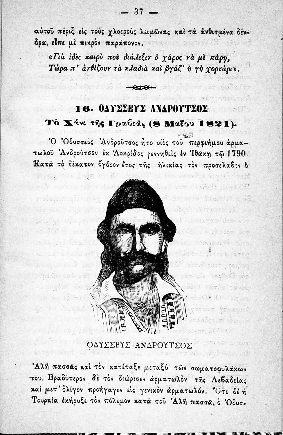 Βαθμίδα εκπαίδευσης: Πρωτοβάθμια, Δευτεροβάθμια Τάξη: Δ' Δημοτικού / Παρθεναγωγείο Μάθημα: Ιστορία Γλώσσα: Καθαρεύουσα Παρουσίαση περιεχομένου: Σχολικό εγχειρίδιο Ιστορίας για τη Δ΄ Δημοτικού και τα Παρθεναγωγεία που εστιάζει στη δράση επιφανών μορφών της Ελληνικής Επανάστασης. |