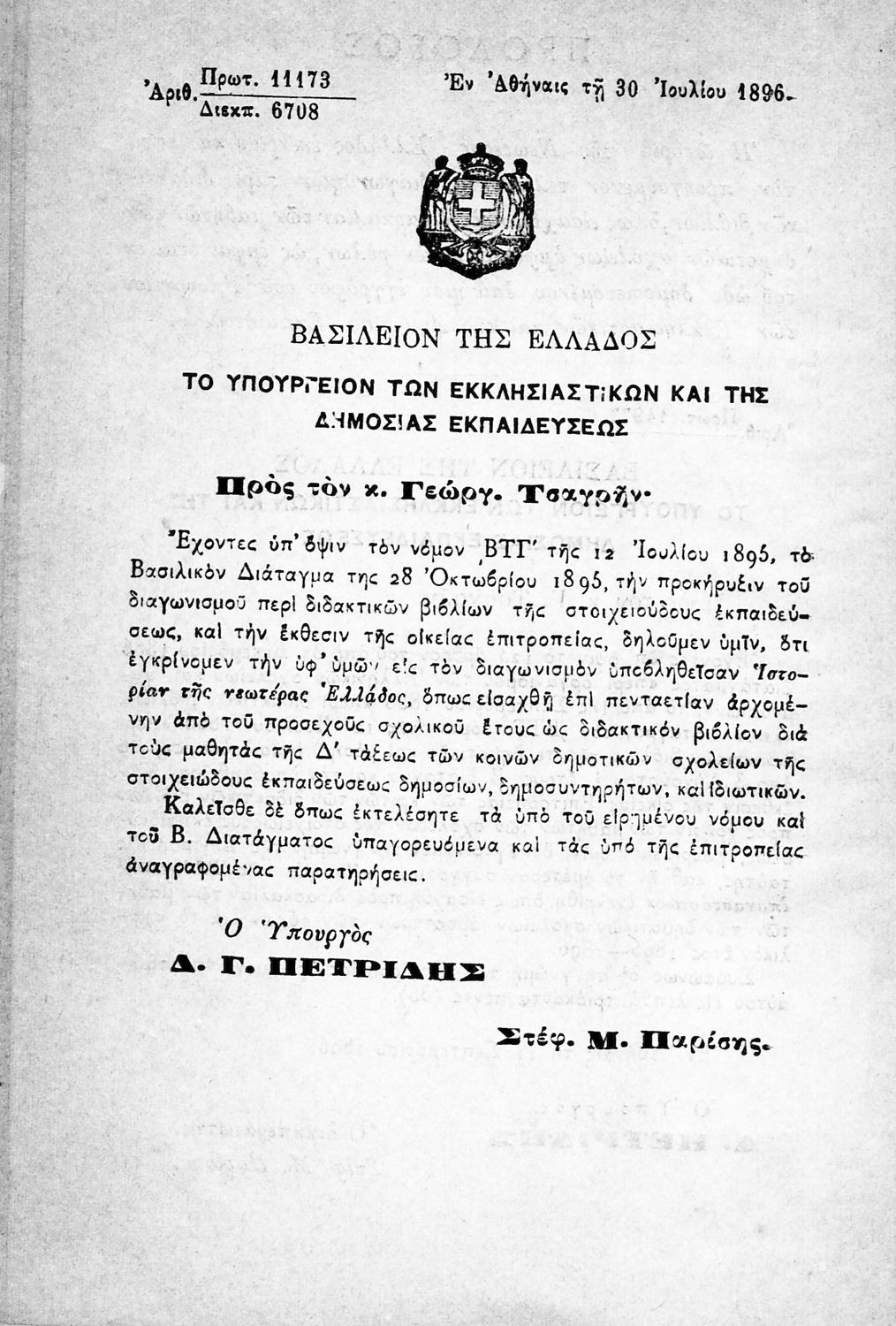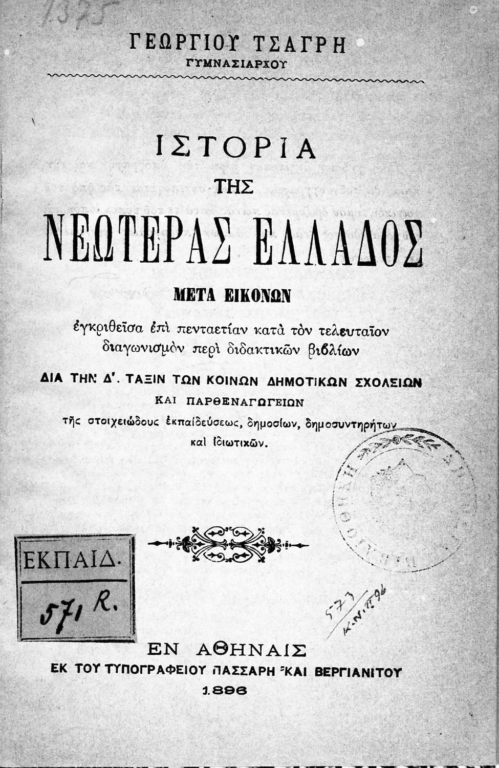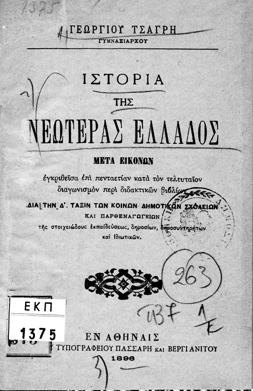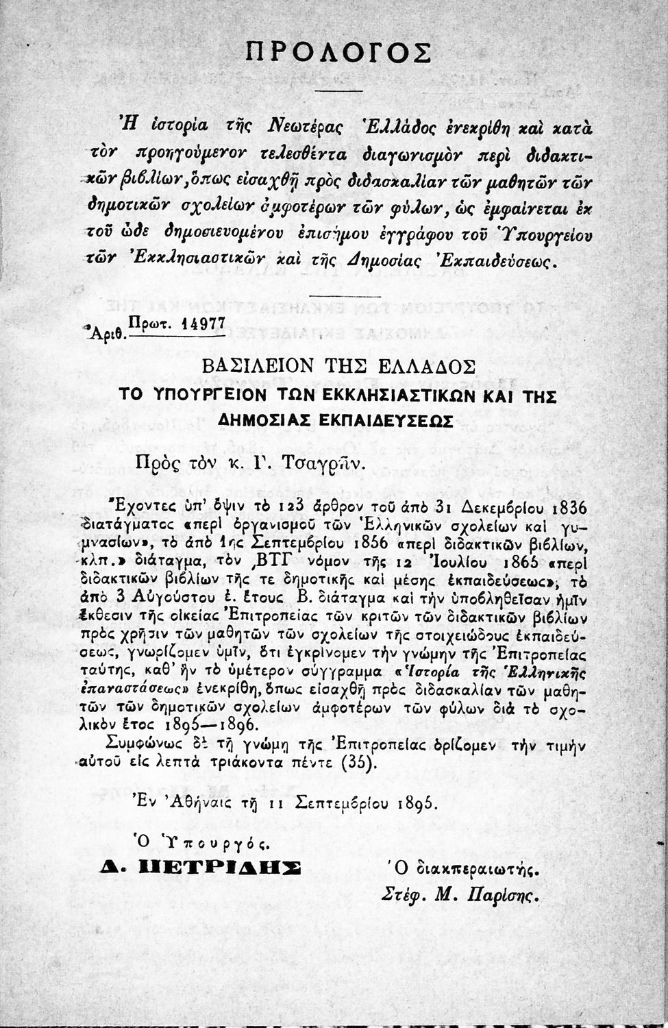 Εκδότης: Πάσσαρης και Βεργιανίτης Έτος έκδοσης: 1896 Τόπος έκδοσης: Αθήνα Υπουργική απόφαση / Σύμβαση: 14977/ 11-9-1895 Έτος έγκρισης: 1895 |