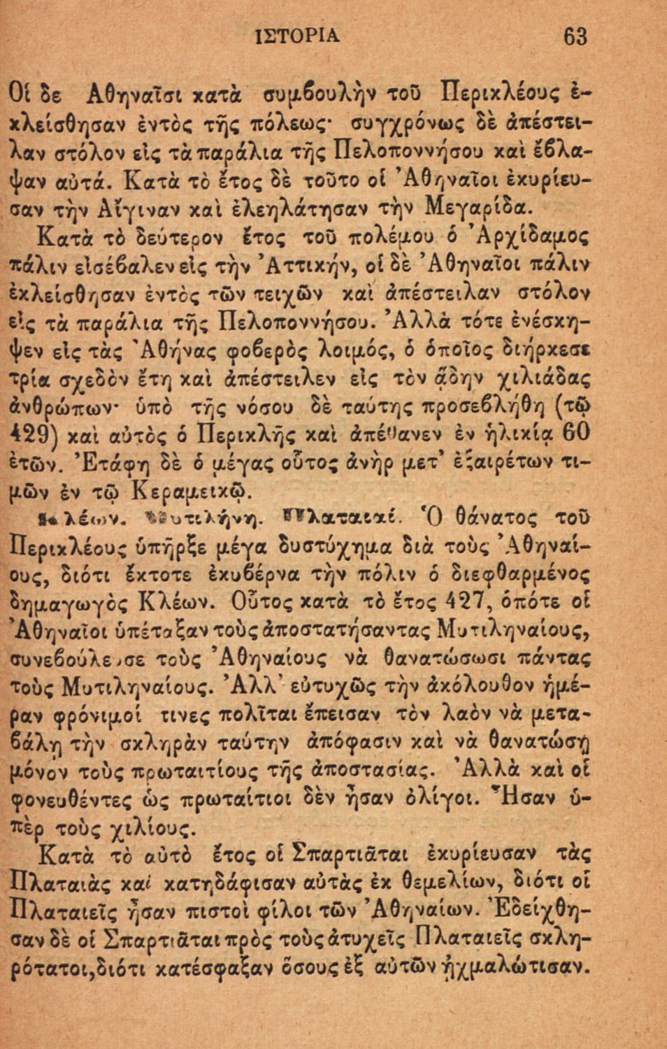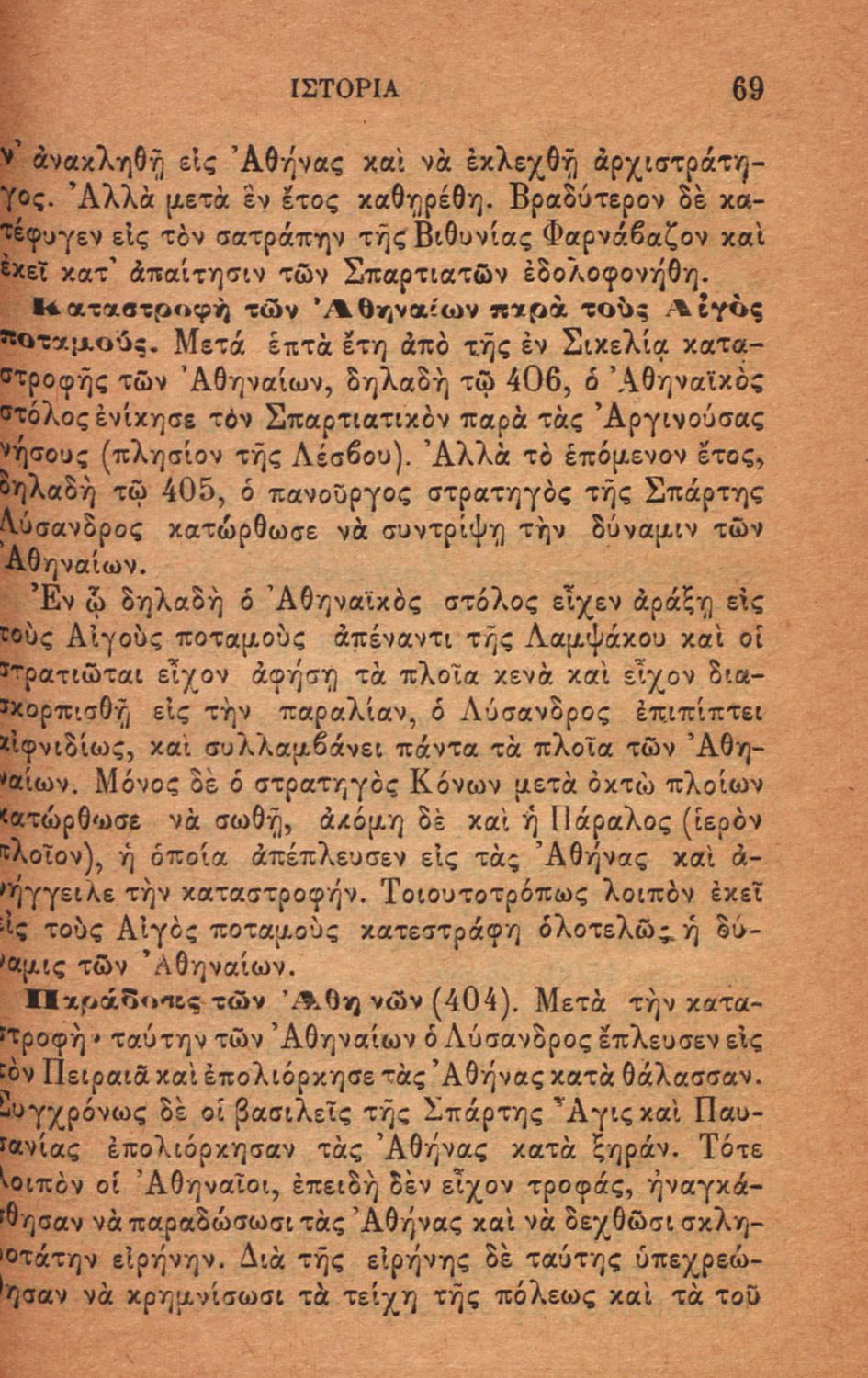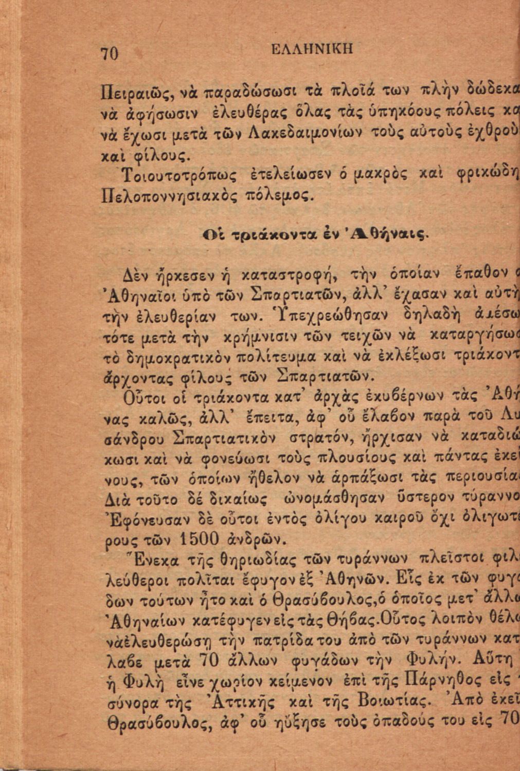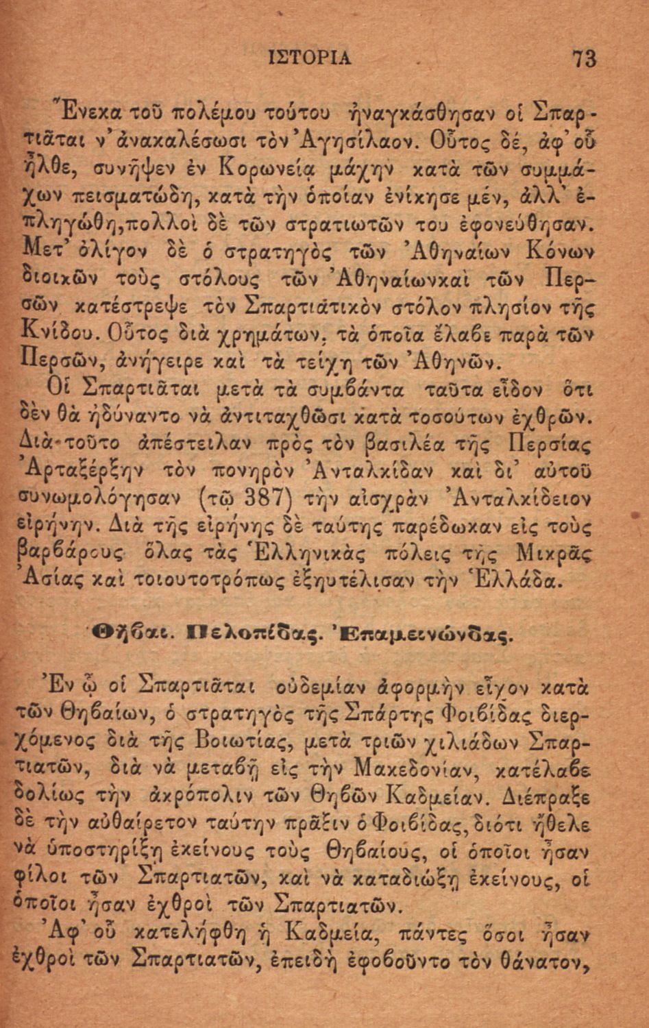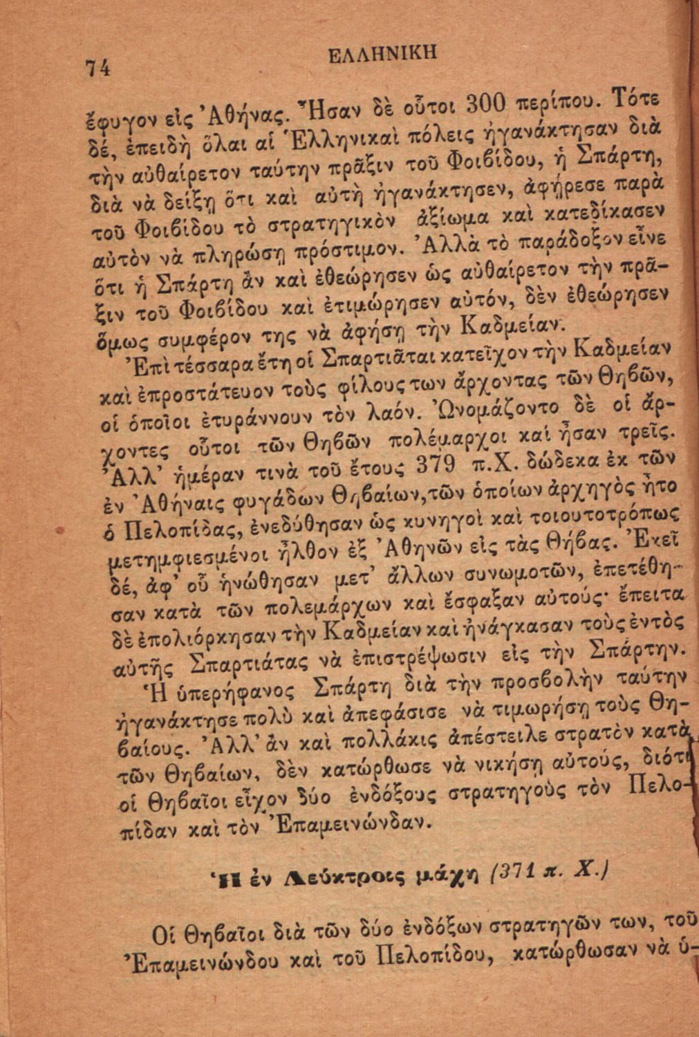 Σχολικό εγχειρίδιο Ιστορίας Α΄ Ελληνικού και Παρθεναγωγείου που καλύπτει την περίοδο από τους μυθικούς και ηρωικούς χρόνους μέχρι την μάχη της Μαντινείας και τον θάνατο του Επαμεινώνδα.