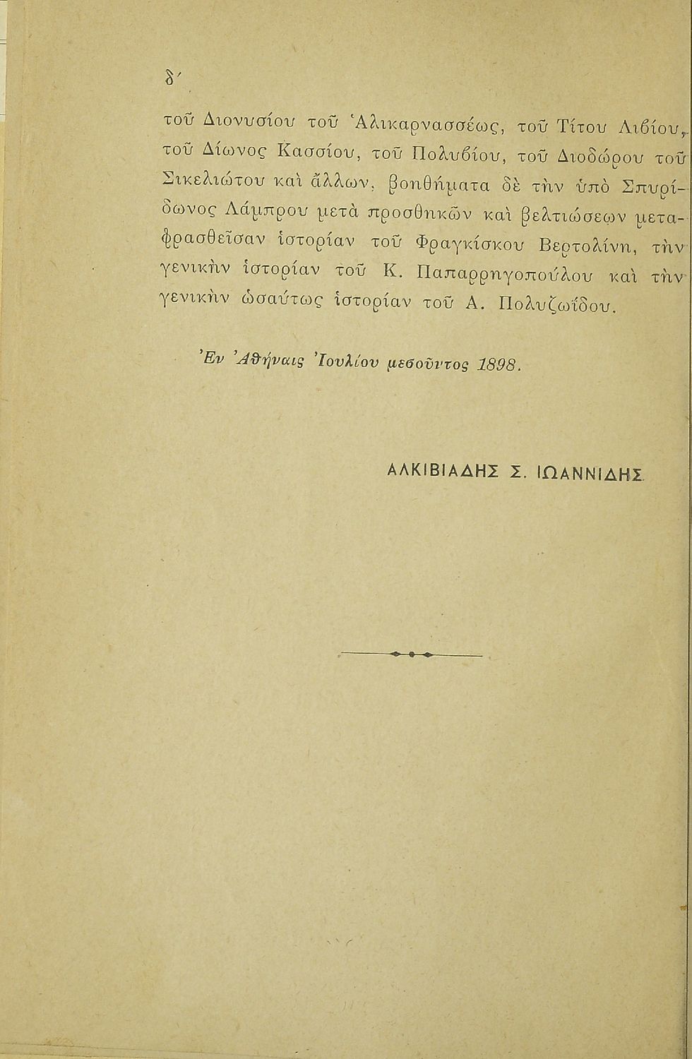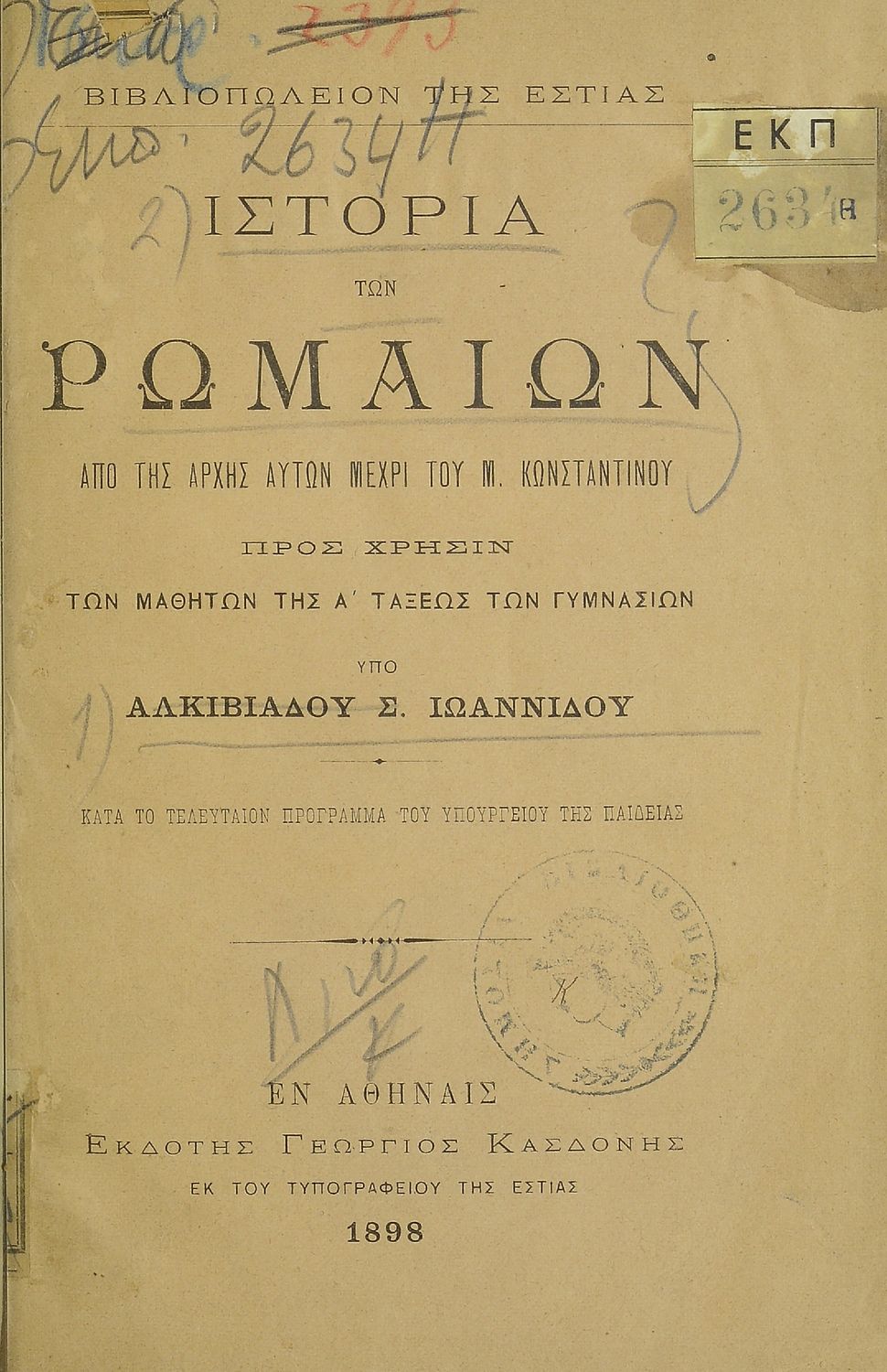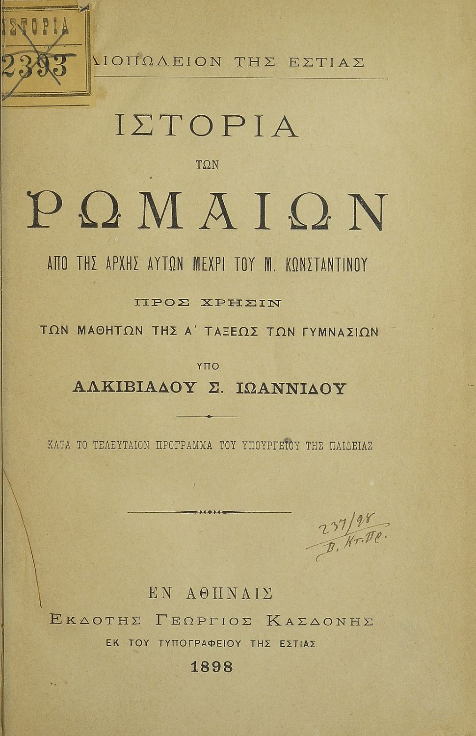 Κωδικός αναγνώρισης: 08-00052 Τίτλος: Ιστορία των Ρωμαίων από της αρχής αυτών μέχρι του Μ. Κωνσταντίνου προς χρήσιν των μαθητών της Α΄ τάξεως των Γυμνασίων Συγγραφέας: Αλκιβιάδης Σ. Ιωαννίδης Μέγεθος και υπόστρωμα: Μαθητικό βοήθημα, σκληρό εξώφυλλο, 170 σελίδες. |