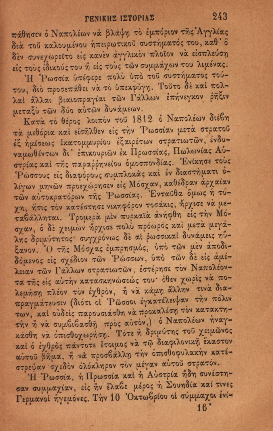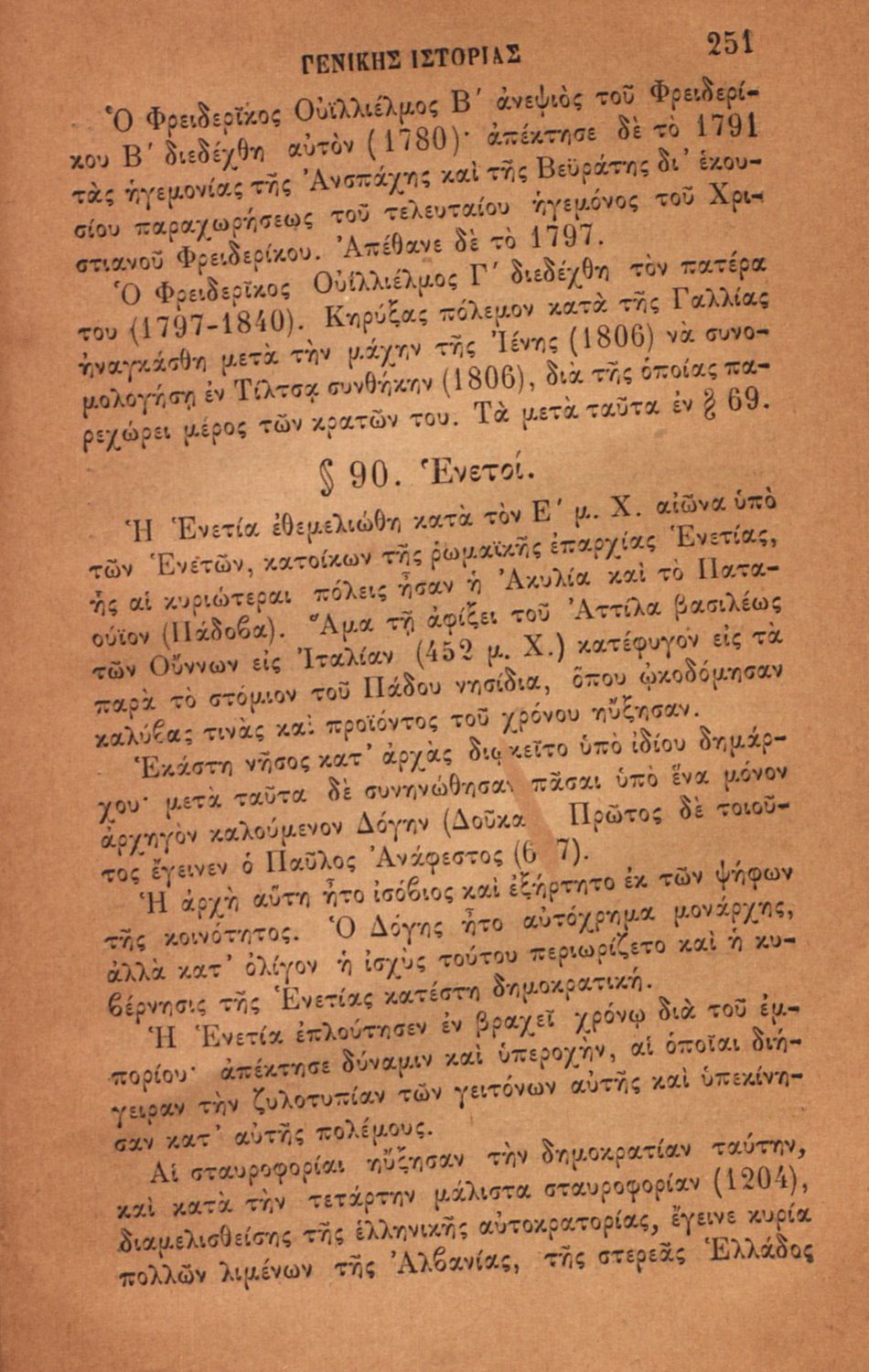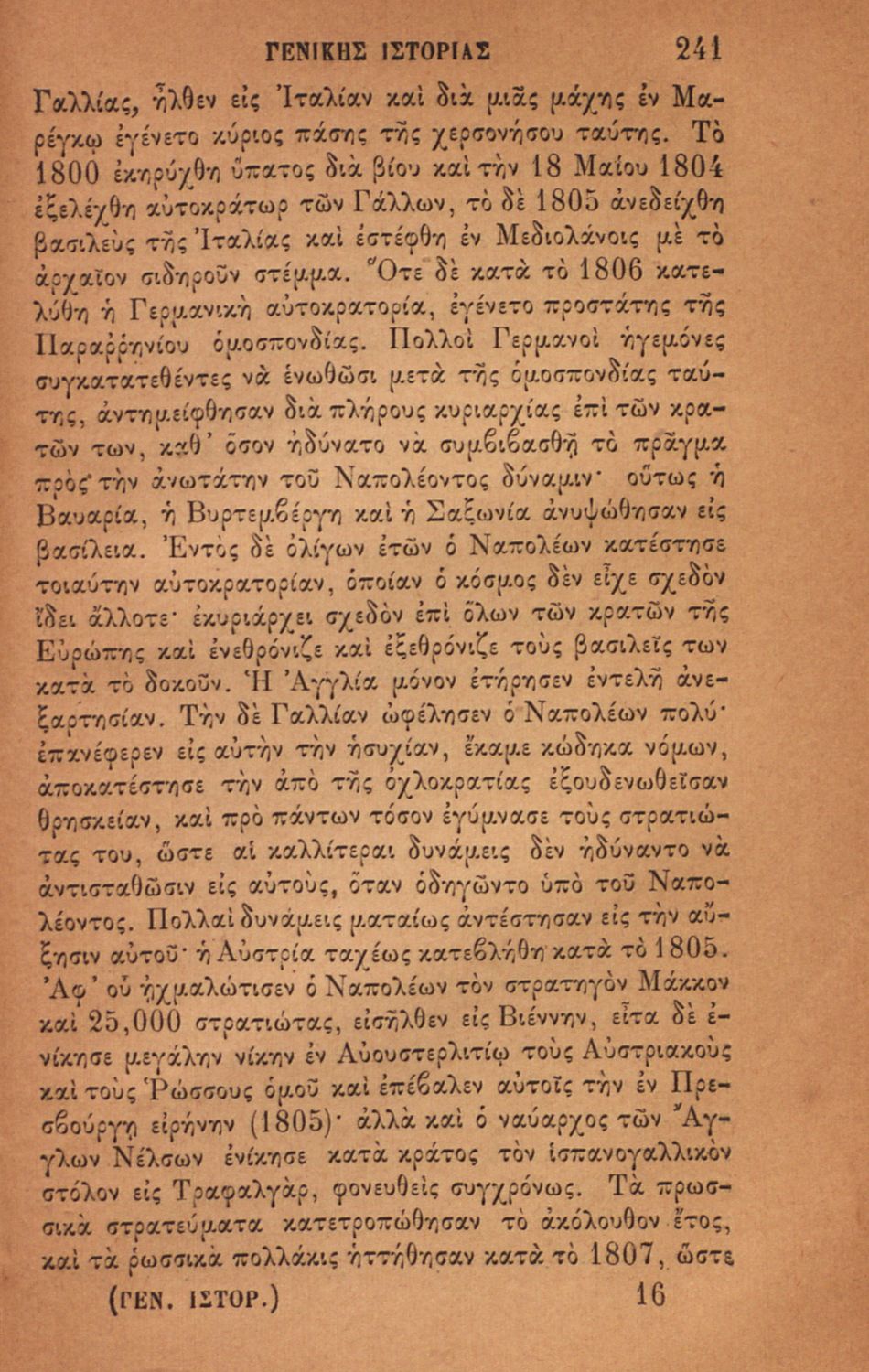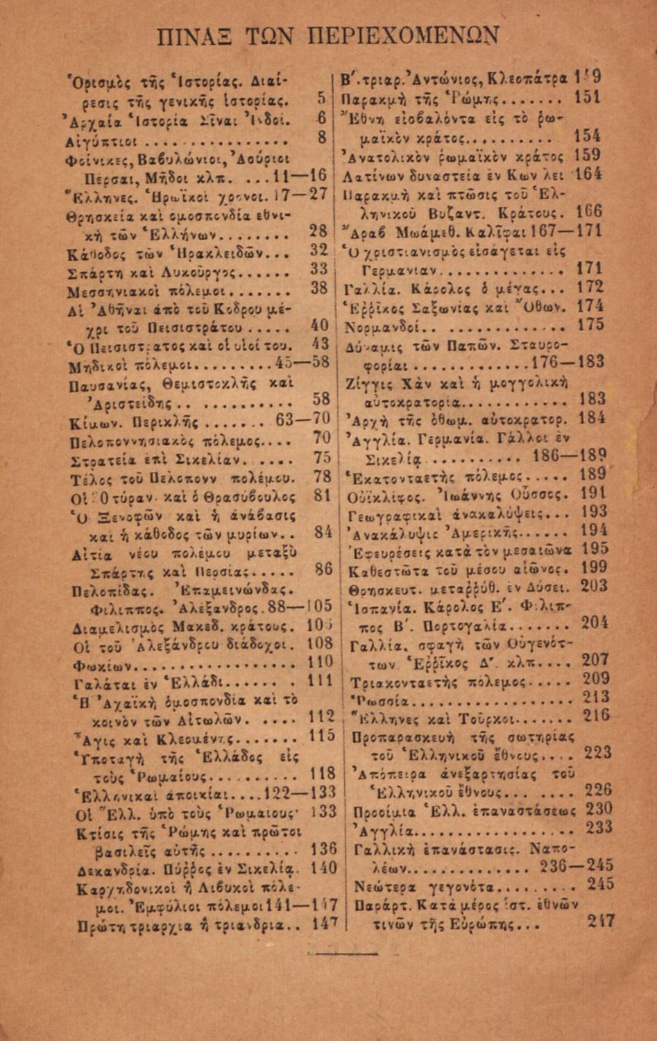 Σχολικό εγχειρίδιο για τις τάξεις του Ελληνικού για το μάθημα της Ιστορίας. Το εγχειρίδιο περιλαμβάνει εισαγωγικά τον ορισμό και τις διαιρέσεις της γενικής ιστορίας. Περιγράφονται γεγονότα από την αρχαία ελληνική ιστορία, από την εμφάνιση των πρώτων κατοίκων στην Ελλάδα, τα γεγονότα του Πελοποννησιακού πολέμου, την υποταγή των Ελλήνων στους Ρωμαίους, τις ελληνικές αποικίες, την παρακμή του ρωμαϊκού κράτους. Το δεύτερο μέρος ασχολείται με την βυζαντινή / μέση ιστορία, την κατάσταση στην Ευρώπη κατά τον 15ο - 17ο αιώνα, την γαλλική επανάσταση κ.α.