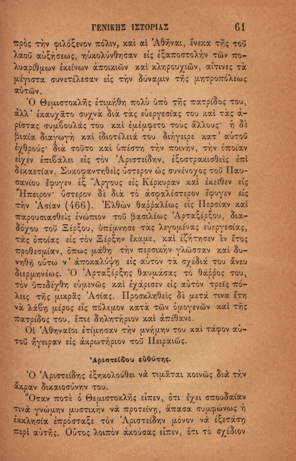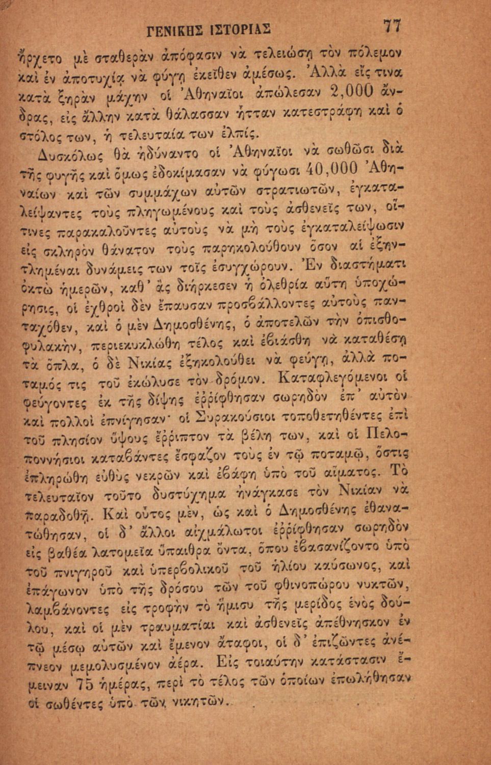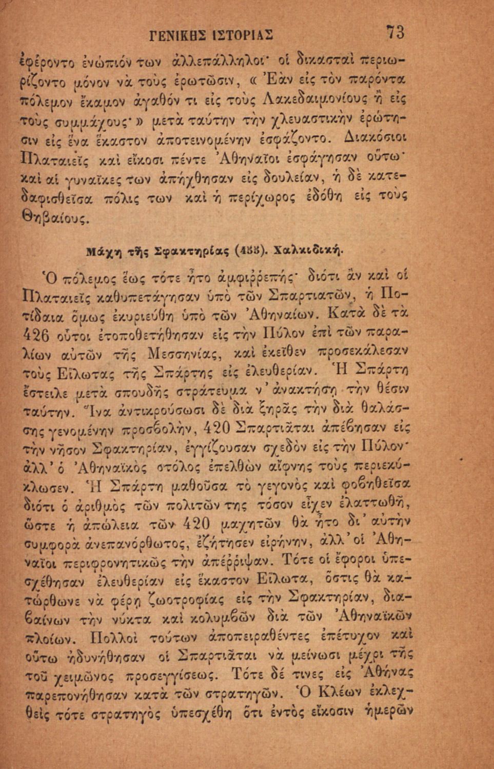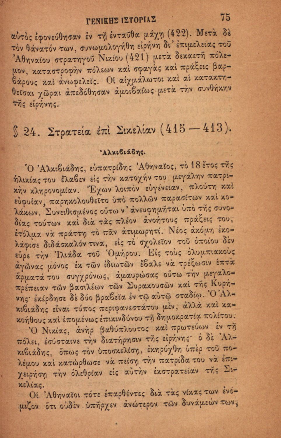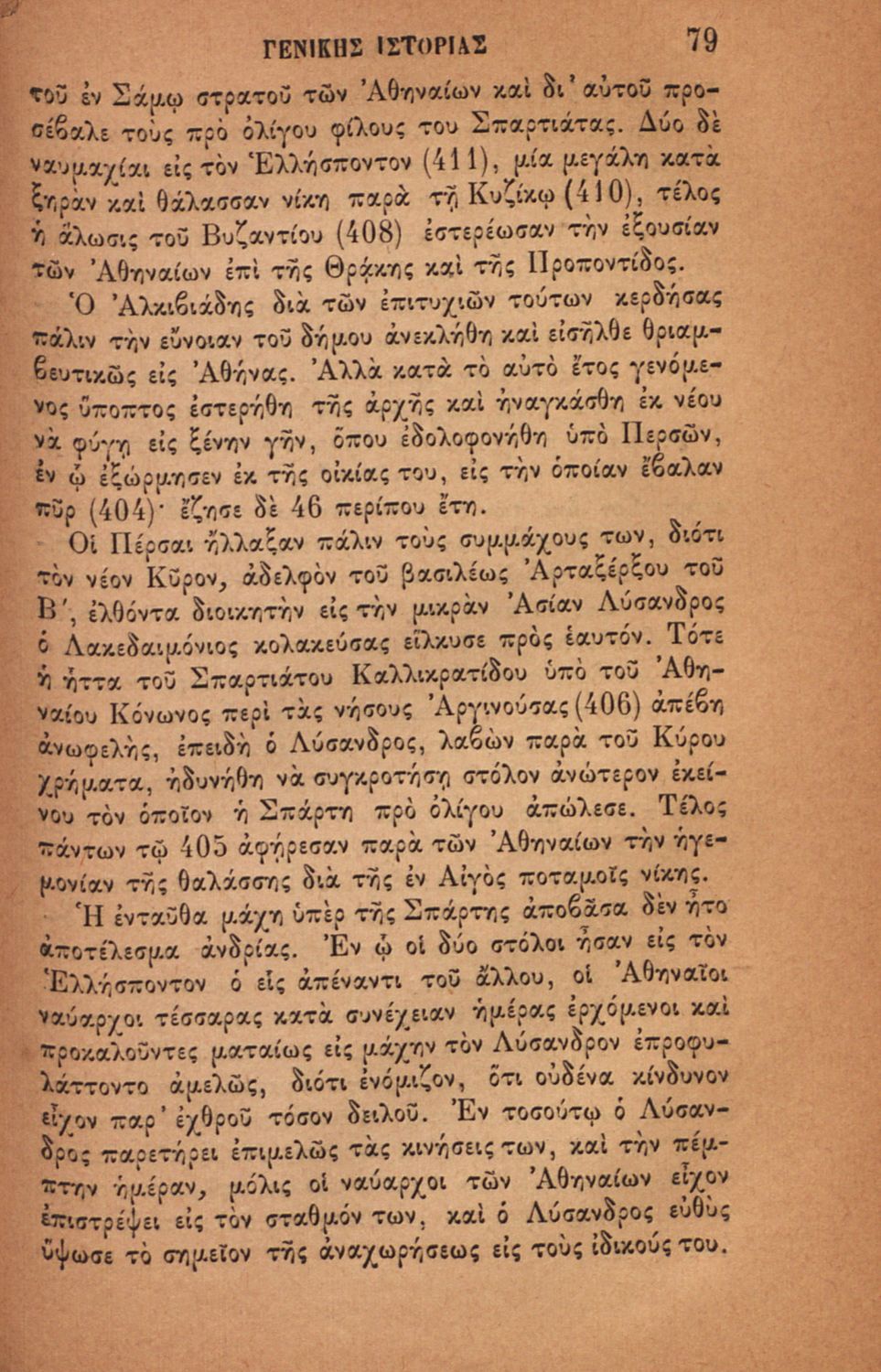 Σχολικό εγχειρίδιο για τις τάξεις του Ελληνικού για το μάθημα της Ιστορίας. Το εγχειρίδιο περιλαμβάνει εισαγωγικά τον ορισμό και τις διαιρέσεις της γενικής ιστορίας. Περιγράφονται γεγονότα από την αρχαία ελληνική ιστορία, από την εμφάνιση των πρώτων κατοίκων στην Ελλάδα, τα γεγονότα του Πελοποννησιακού πολέμου, την υποταγή των Ελλήνων στους Ρωμαίους, τις ελληνικές αποικίες, την παρακμή του ρωμαϊκού κράτους. Το δεύτερο μέρος ασχολείται με την βυζαντινή / μέση ιστορία, την κατάσταση στην Ευρώπη κατά τον 15ο - 17ο αιώνα, την γαλλική επανάσταση κ.α.