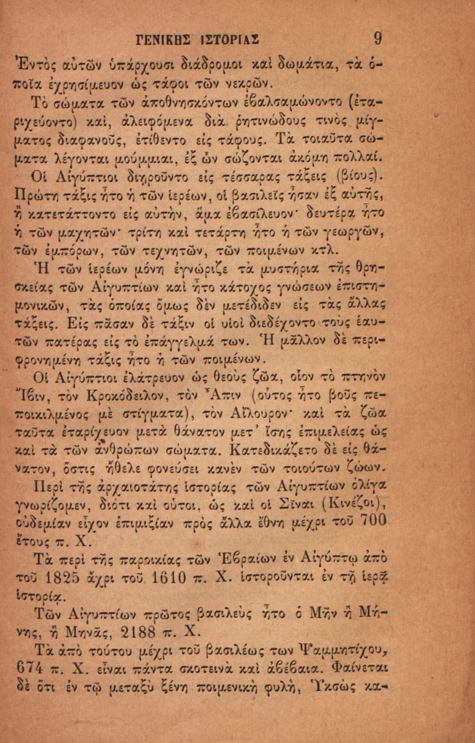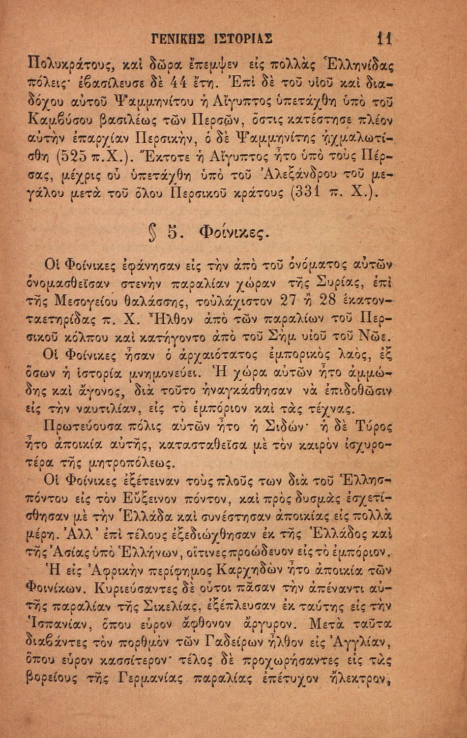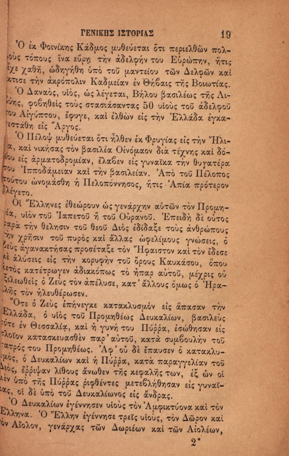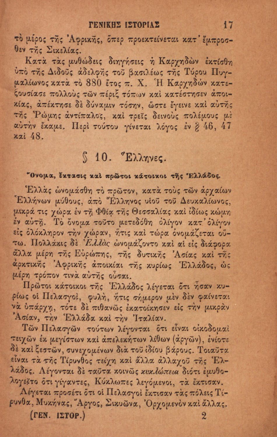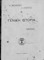 Σχολικό εγχειρίδιο για τις τάξεις του Ελληνικού για το μάθημα της Ιστορίας. Το εγχειρίδιο περιλαμβάνει εισαγωγικά τον ορισμό και τις διαιρέσεις της γενικής ιστορίας. Περιγράφονται γεγονότα από την αρχαία ελληνική ιστορία, από την εμφάνιση των πρώτων κατοίκων στην Ελλάδα, τα γεγονότα του Πελοποννησιακού πολέμου, την υποταγή των Ελλήνων στους Ρωμαίους, τις ελληνικές αποικίες, την παρακμή του ρωμαϊκού κράτους. Το δεύτερο μέρος ασχολείται με την βυζαντινή / μέση ιστορία, την κατάσταση στην Ευρώπη κατά τον 15ο - 17ο αιώνα, την γαλλική επανάσταση κ.α.