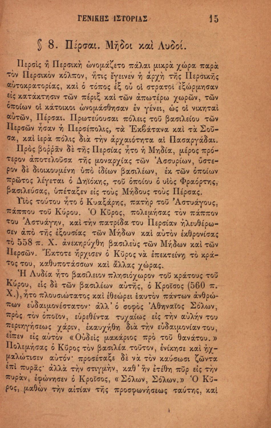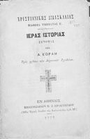 Βαθμίδα εκπαίδευσης: Δευτεροβάθμια Τάξη: Ελληνικό Σχολείο Μάθημα: Ιστορία Γλώσσα: Καθαρεύουσα Παρουσίαση περιεχομένου: Σχολικό εγχειρίδιο για τις τάξεις του Ελληνικού για το μάθημα της Ιστορίας. Το εγχειρίδιο περιλαμβάνει εισαγωγικά τον ορισμό και τις διαιρέσεις της γενικής ιστορίας. Περιγράφονται γεγονότα από την αρχαία ελληνική ιστορία, από την εμφάνιση των πρώτων κατοίκων στην Ελλάδα, τα γεγονότα του Πελοποννησιακού πολέμου, την υποταγή των Ελλήνων στους Ρωμαίους, τις ελληνικές αποικίες, την παρακμή του ρωμαϊκού κράτους. Το δεύτερο μέρος ασχολείται με την βυζαντινή / μέση ιστορία, την κατάσταση στην Ευρώπη κατά τον 15ο - 17ο αιώνα, την γαλλική επανάσταση κ.α. |